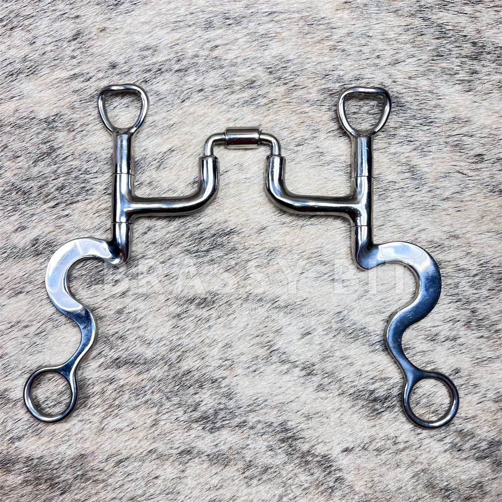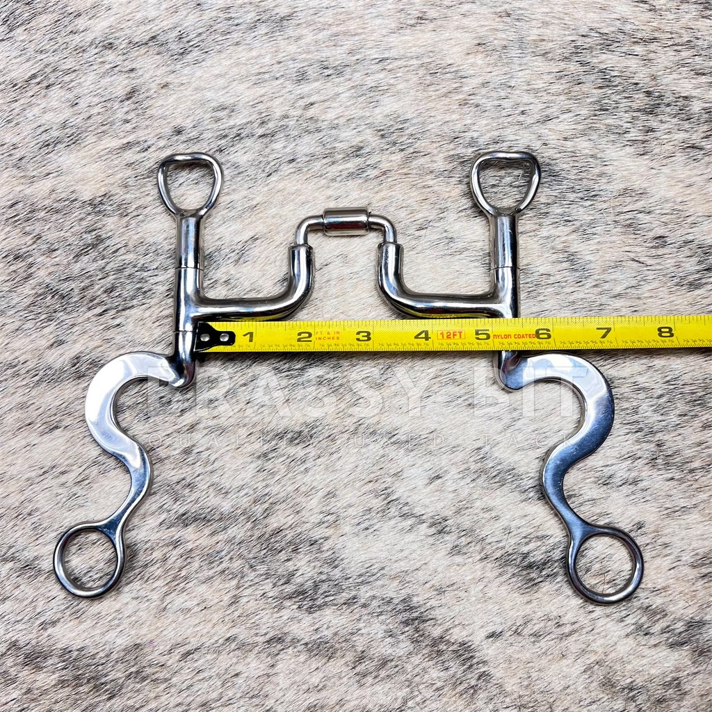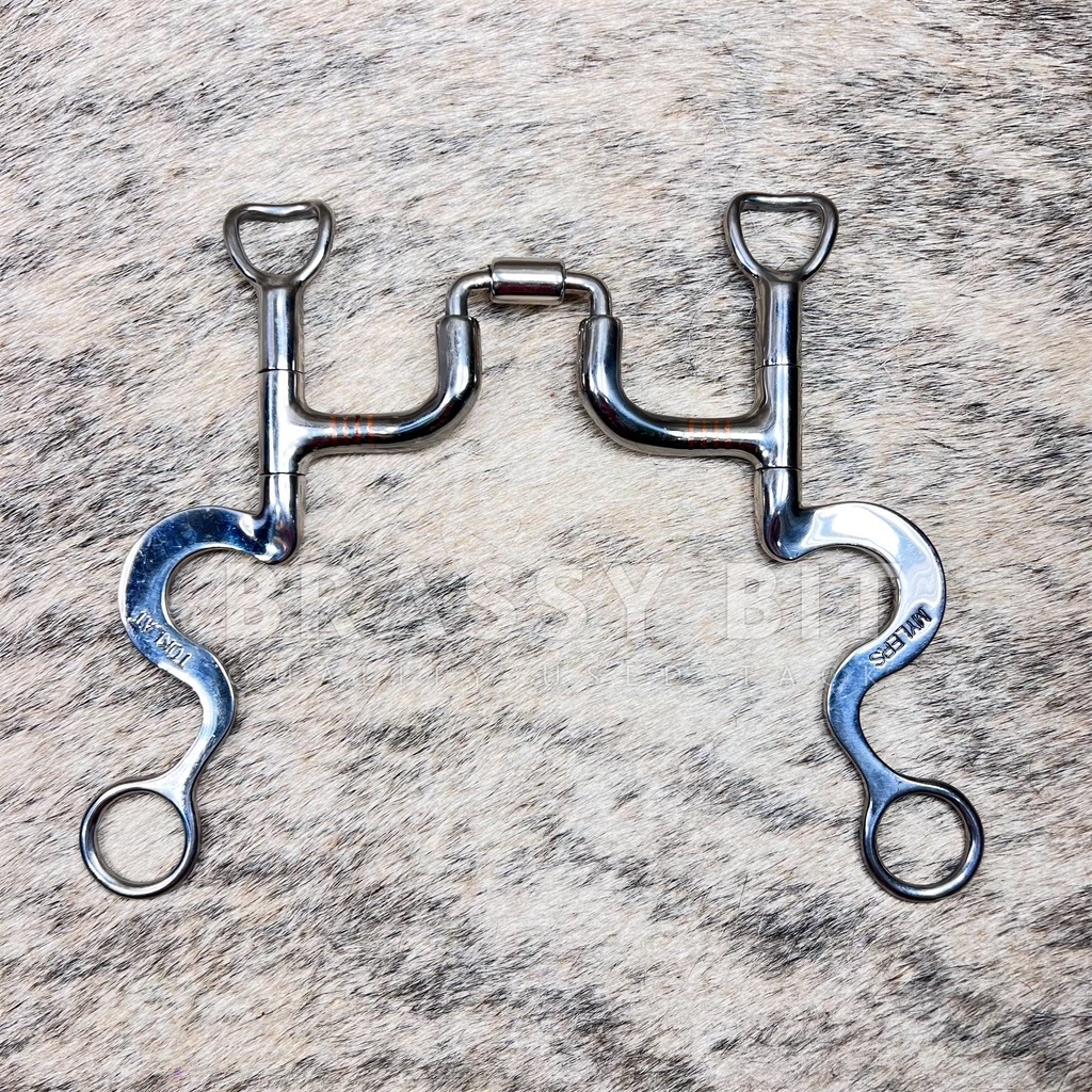 Here is a really nice, new without tags 5″ Myler correction ported Level 3 Calvary Flat Shank Curb. This bit has been discontinued, with the current mouth a bit different. This one is most comparable to the MB47PB correctional ported curb, as it rounds up to the port. However, this port is higher and wider, with a wider roller than the current model. Port measures 2 1/8″. Â Sweet iron mouth with copper inlays. Calvary style flat shank that measures 7 3/4″. This is, new bit but we are calling this ‘demo’ it may have a couple tiny marks from storage, but has never been used. Great, new bit that is offered way less than retail!