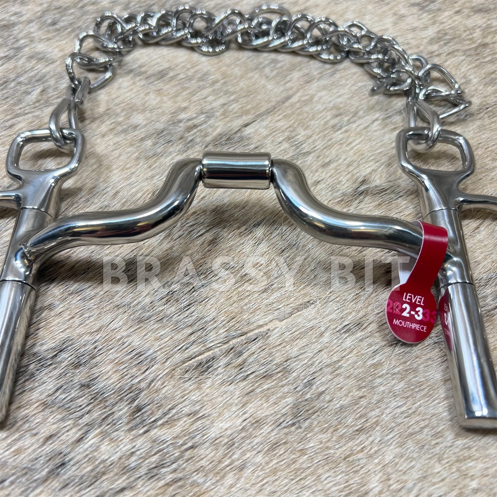 The MB 43LP does not rotate on to the tongue, but instead sits solidly across the bars and lips of the horse’s mouth. The port is narrower than a Level 3 mouthpiece, but still offers room for the horse’s tongue to pass under the bit. Because the port is narrow, when the reins are engaged, the horse will feel a slight pressure on the outside edges of the tongue — a gentle reminder rather than a strong reprimand. The port on this mouthpiece is only 1 ¼” high, so it will apply little to no palate pressure. It is the mildest of the Level 2-3 mouthpieces in terms of tongue pressure, just one step below a Level 3 mouthpiece.