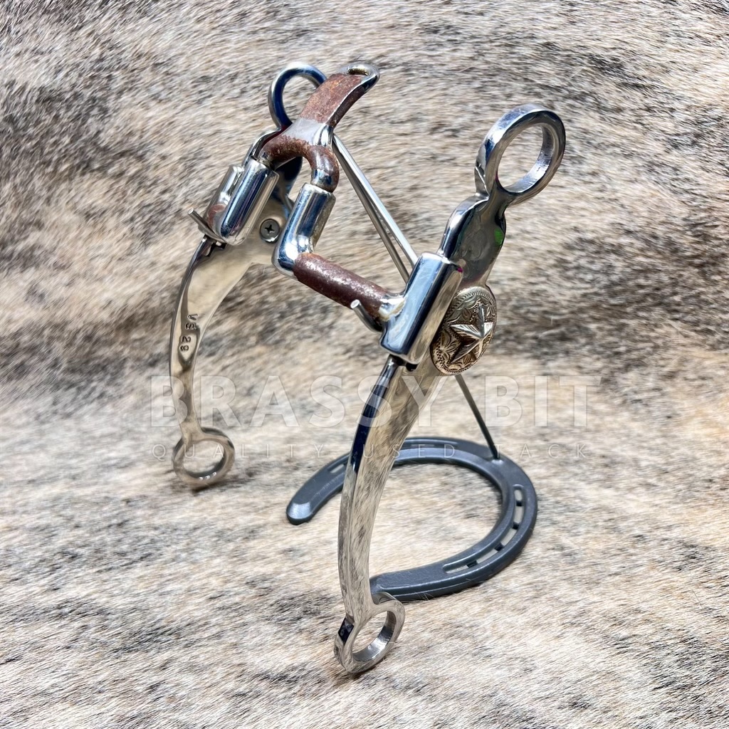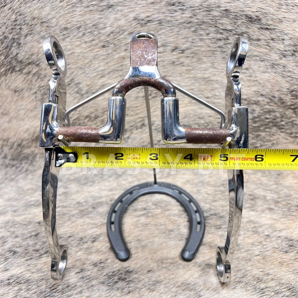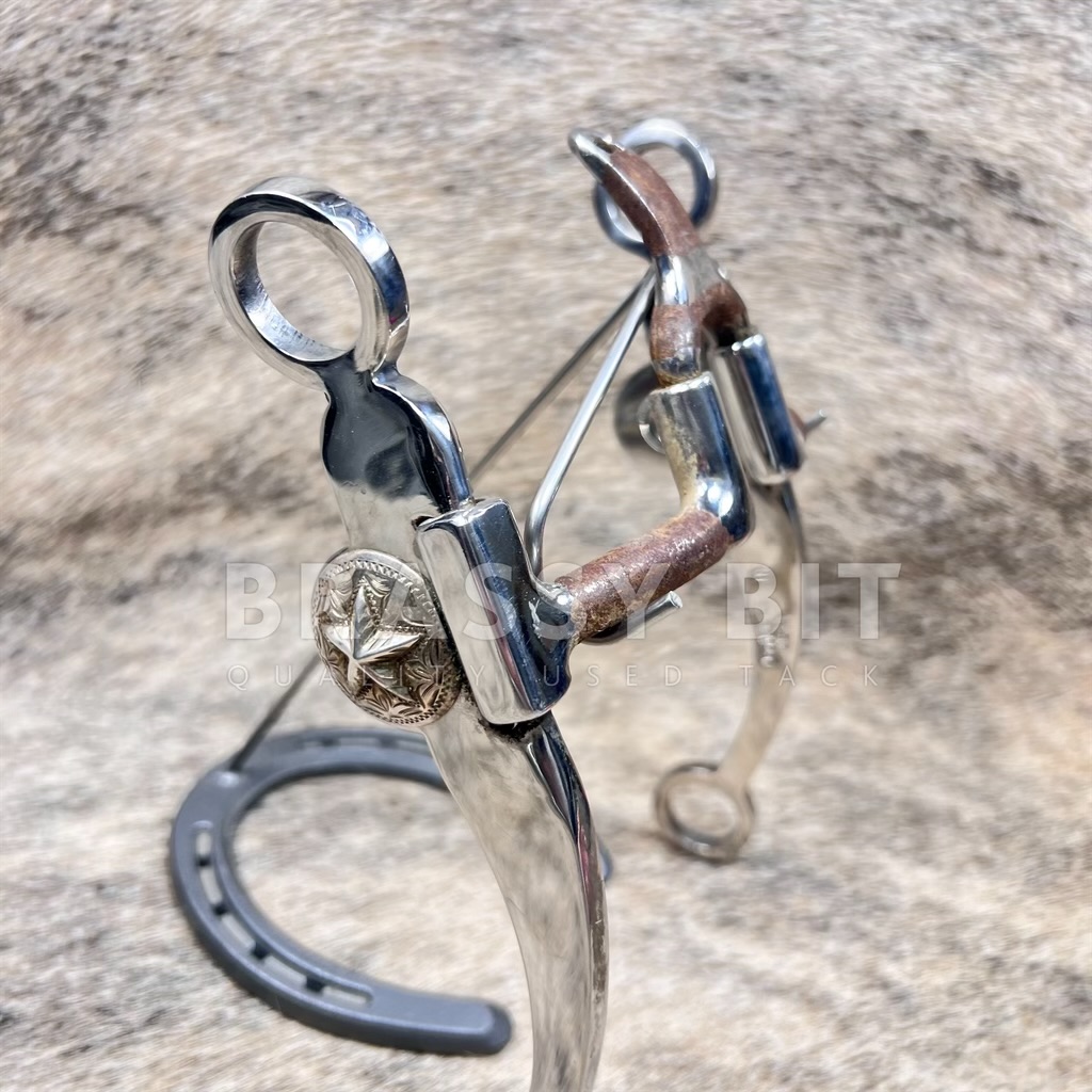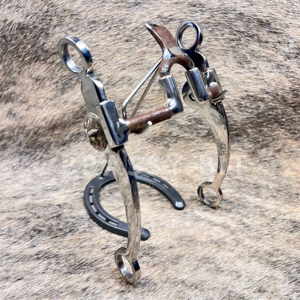 Goodness, is this curb bit pretty! It is an original Myler Bit, made in the USA, with all the craftsmanship and feel you’d expect from a custom Myler. Offers a 5” sweet iron mouth with cathedral port that measures 3.25” from top to bottom of the mouth. Rotates at the port and the shank. Build on the heavier and wider swept back shank, with a raised silver overlay star concho on the very side of the mouth. This curb is quite weighty, with a great balance and feel. In very lightly used condition, used just enough for the sweet iron mouth to start to rust. Stunning bit and offered way less than its retail price.