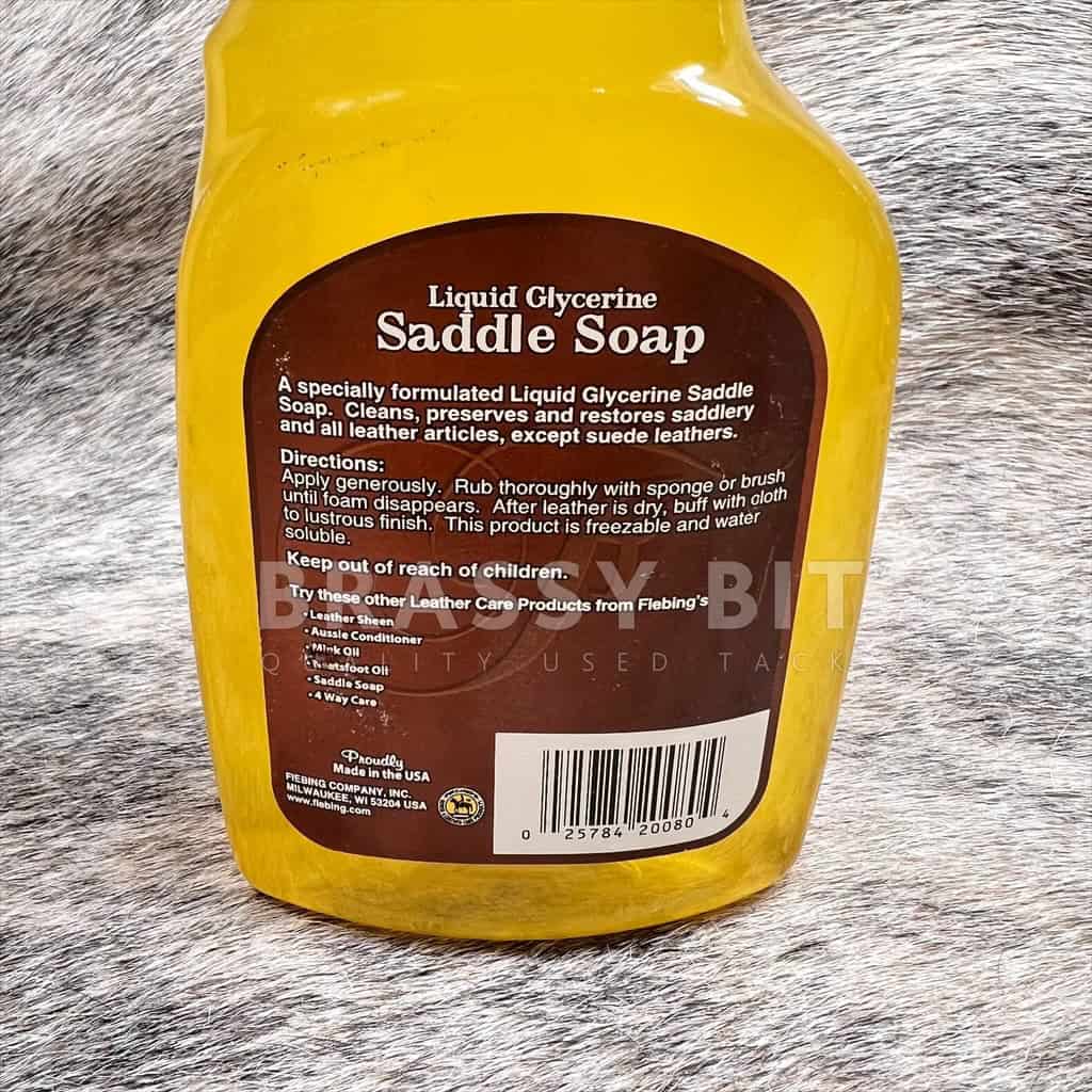 Here is one of those staples every tack room should have! Fiebing’s liquid glycerine saddle soap is such an easy product to use. Simply spray on, scrub a bit, and wipe off. That’s it! It quickly cleans tack without leaving a sticky or soapy residue, doesn’t overly dry leather, and doesn’t stain. It is great for any leather product, not just tack. It may darken some lighter, unseal leathers or suede. New, in a 16oz spray bottle.
