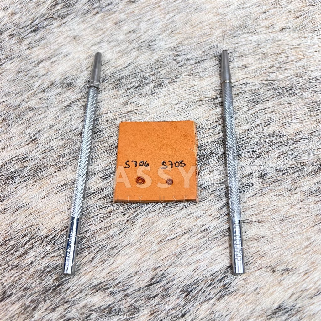 Nice, lightly used vintage, US made Craftool Leather Tools leather stamps. Quite rare stamps, made in 1968-1971. Comes as a pair-S705 and S706-Lined Seeders- Clear/sharp stamp, stamps evenly, shows normal/less than normal use or wear. May how a minor mark or two on handle from use and storage. Approx stamp dimensions: S705: 1/8″ (3.2mm) diameter, S706: 5/32″ (4.0mm) diameter.