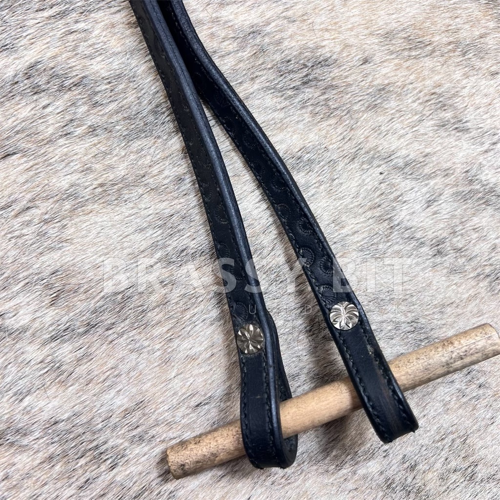 Here is a nice pair of leather split reins. While not branded, made from nice leather and have a really nice look. In black leather with a cool geometric stamping/tooling at the ends. Shorter at 59″, 1*/2″ diameter. Have Chicago screw bit ends. Very lightly used however have been in storage for some time, so are quite dry. These are made from nice leather so have already softened up with just a bit of attention.