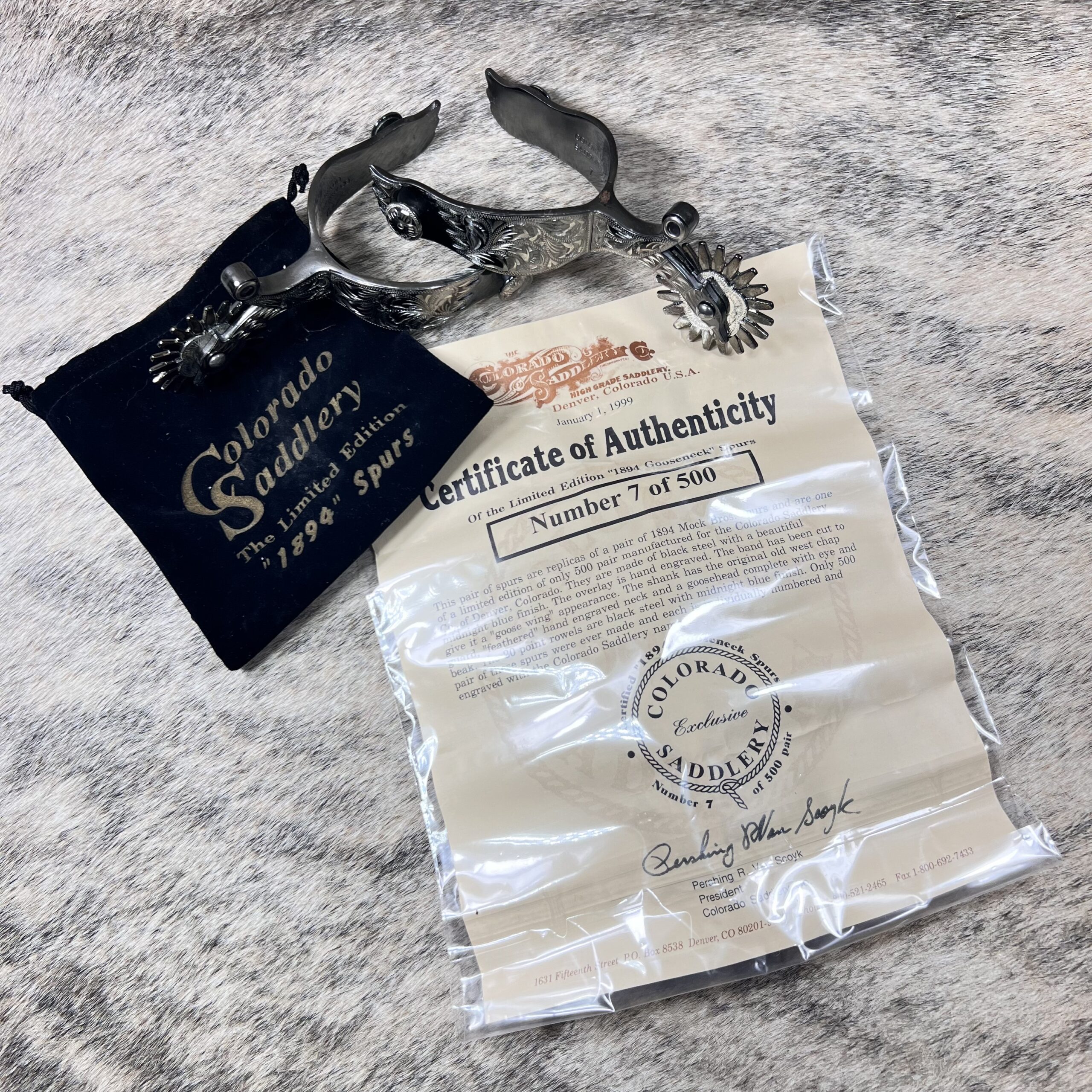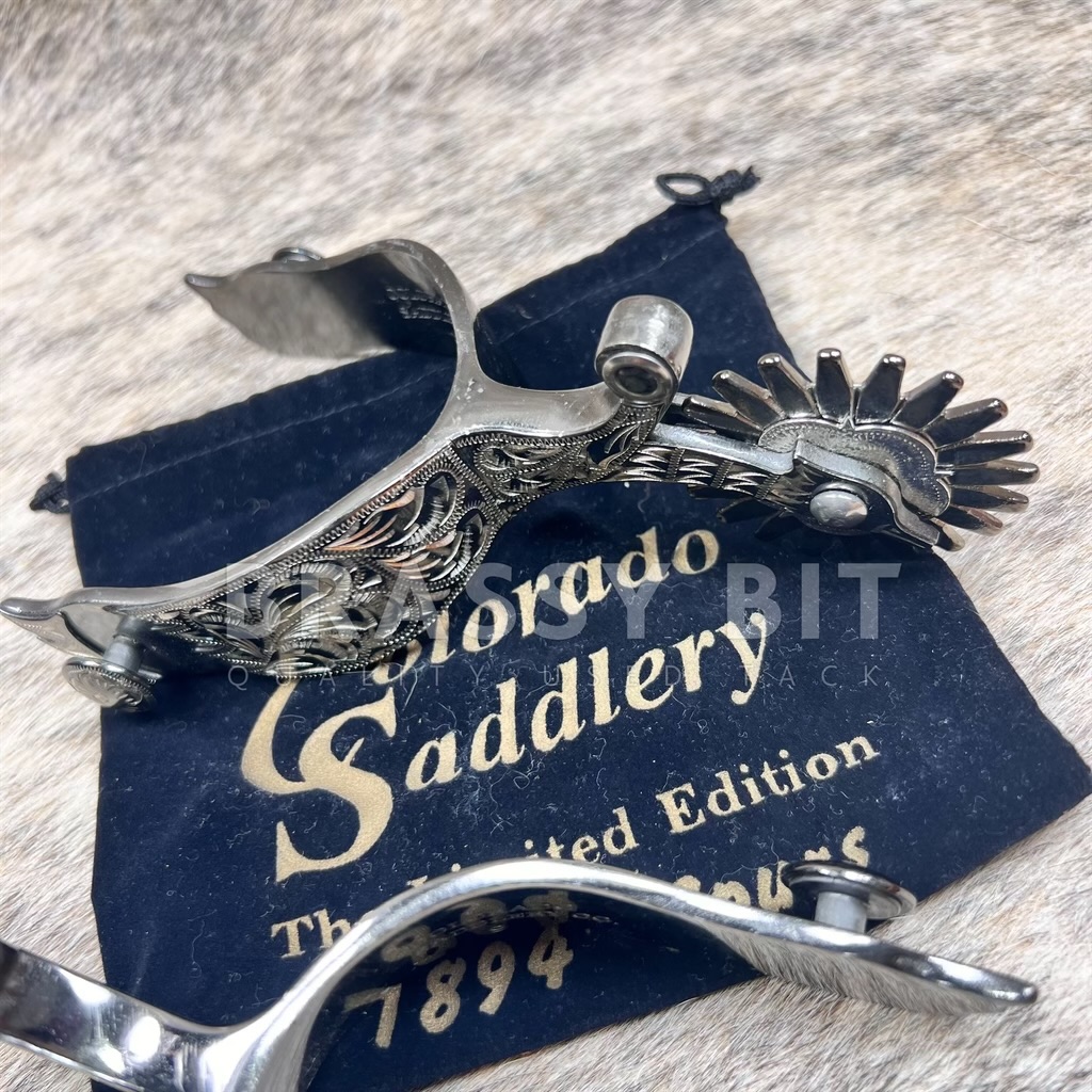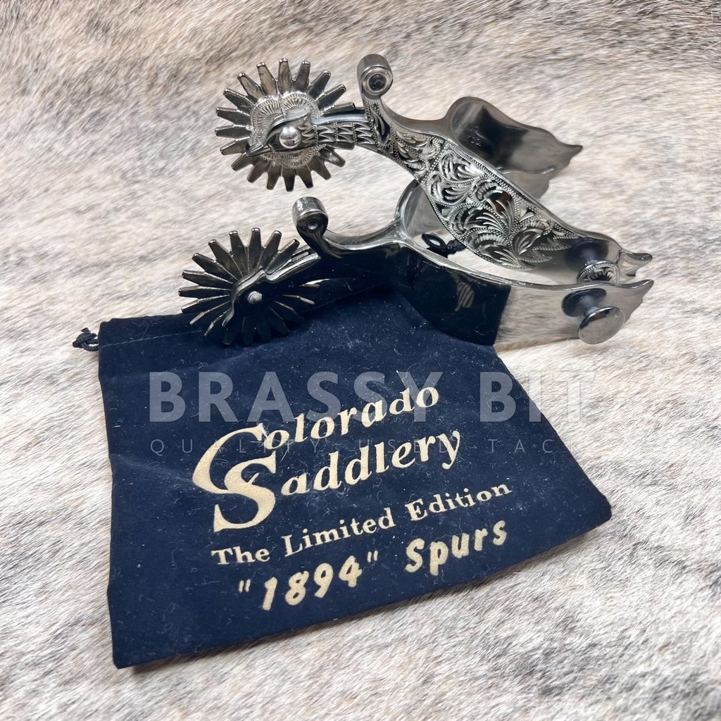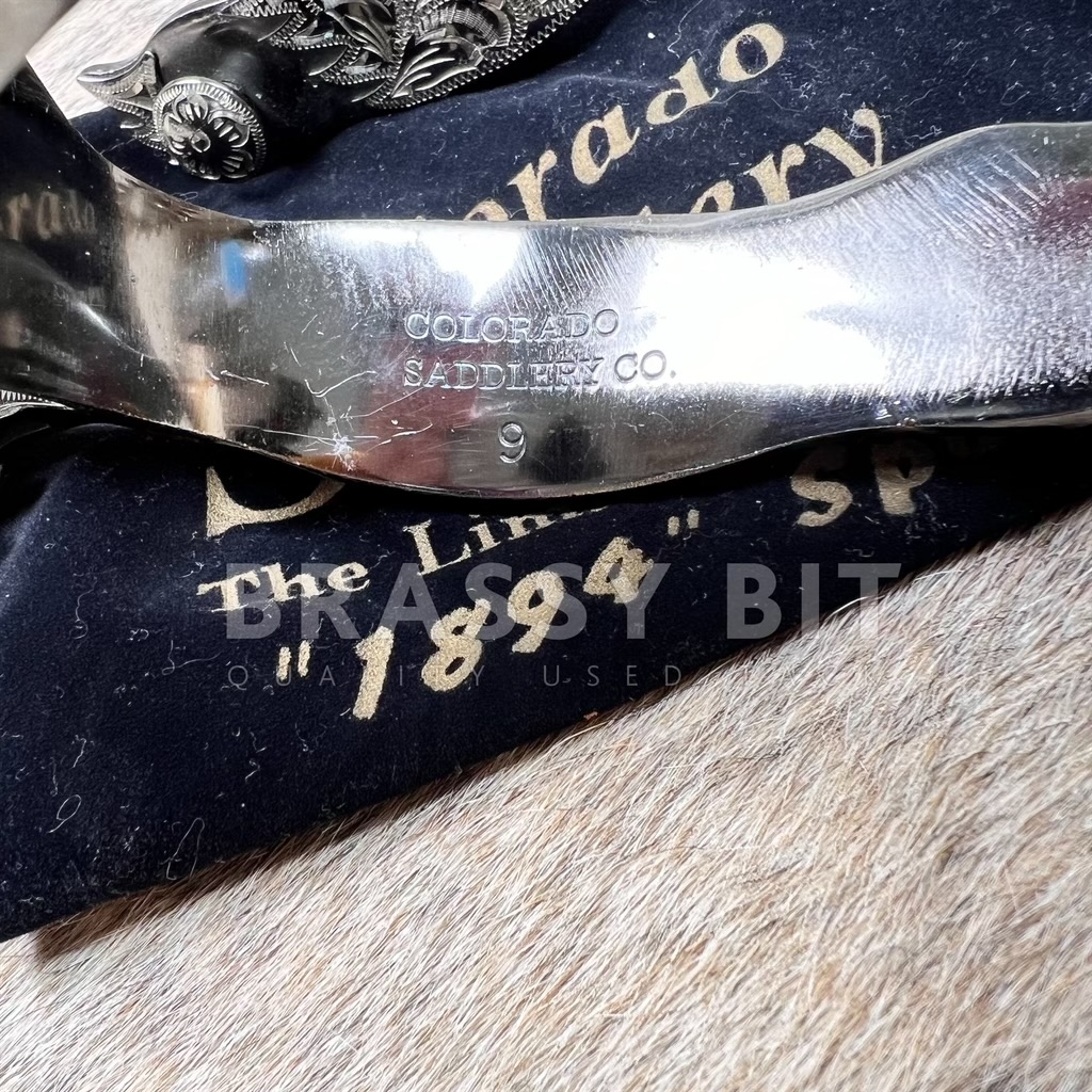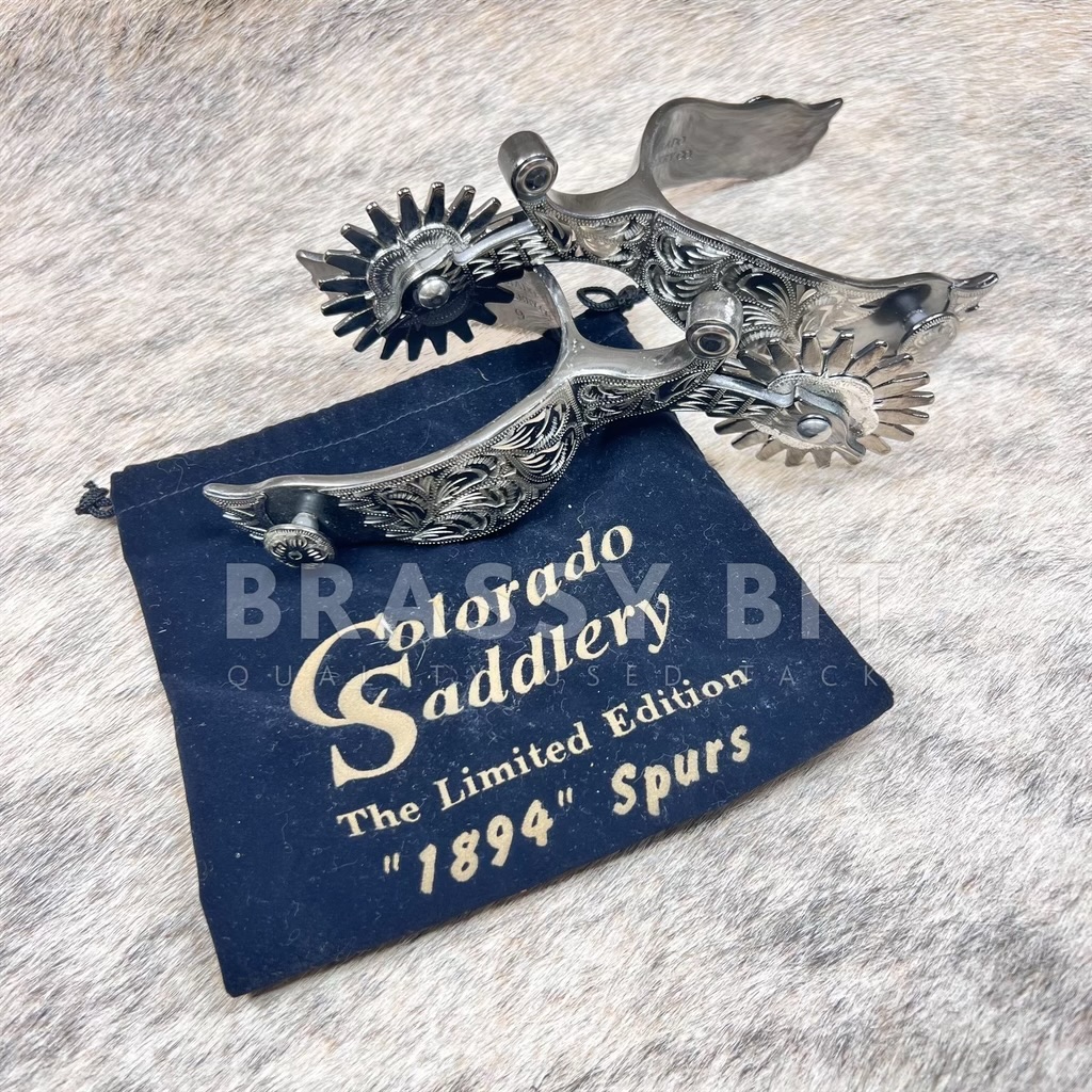 These spurs from Colorado Saddlery are so darn cool! These spurs were a very limited edition (500 made) by Colorado Saddlery as a direct replica of the incredibly popular 1894 Mock Brothers spurs. US made-not imports-and truly meant to be a collectors item as well as a daily using spur. Solid steel spurs, finished in a cool antiqued finish with hand engraving (single mount) that extends down the neck into the rowel. The neck/rowel have the famed gooseneck/goosehead shape complete with eye and beak. Larger, 20 point free spinning rowel finishes this sharp spur off. Many of these spurs ended up in private collections, just like this set. These were purchased by a long time collector (along with 4 other pairs) and have been in storage. Are new/new old stock, never used but have been in storage for some time. May show a bit of scuffing from storage, but are darn cool! These are an incredibly low number (#7 of 500 made). We also have #8, #9, and #39 in stock. It is RARE to find these spurs in consecutive order (#7, #8, and #9). Comes with certificate of authenticity and velvet storage bag.