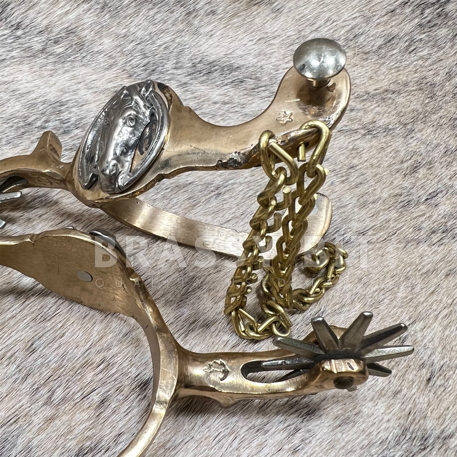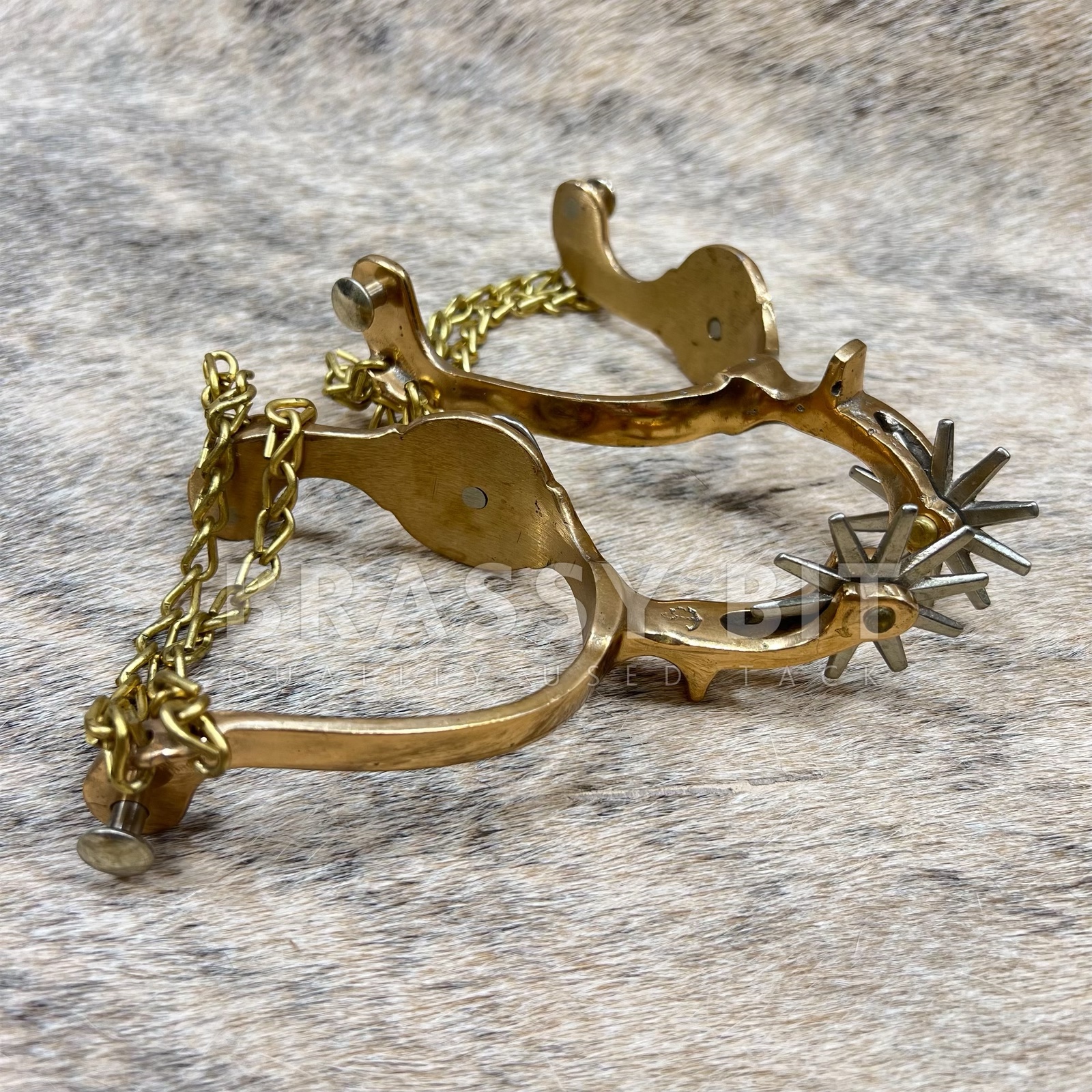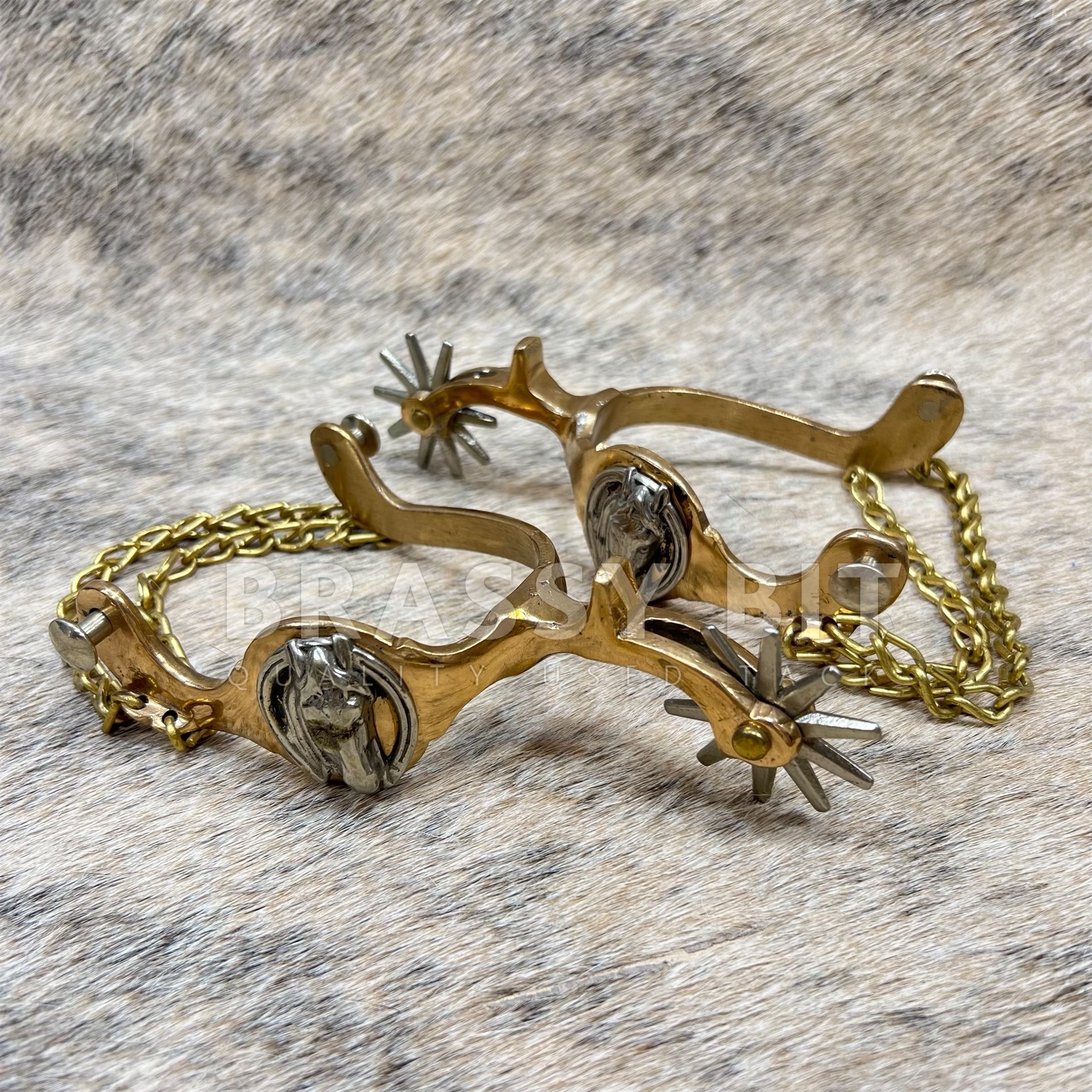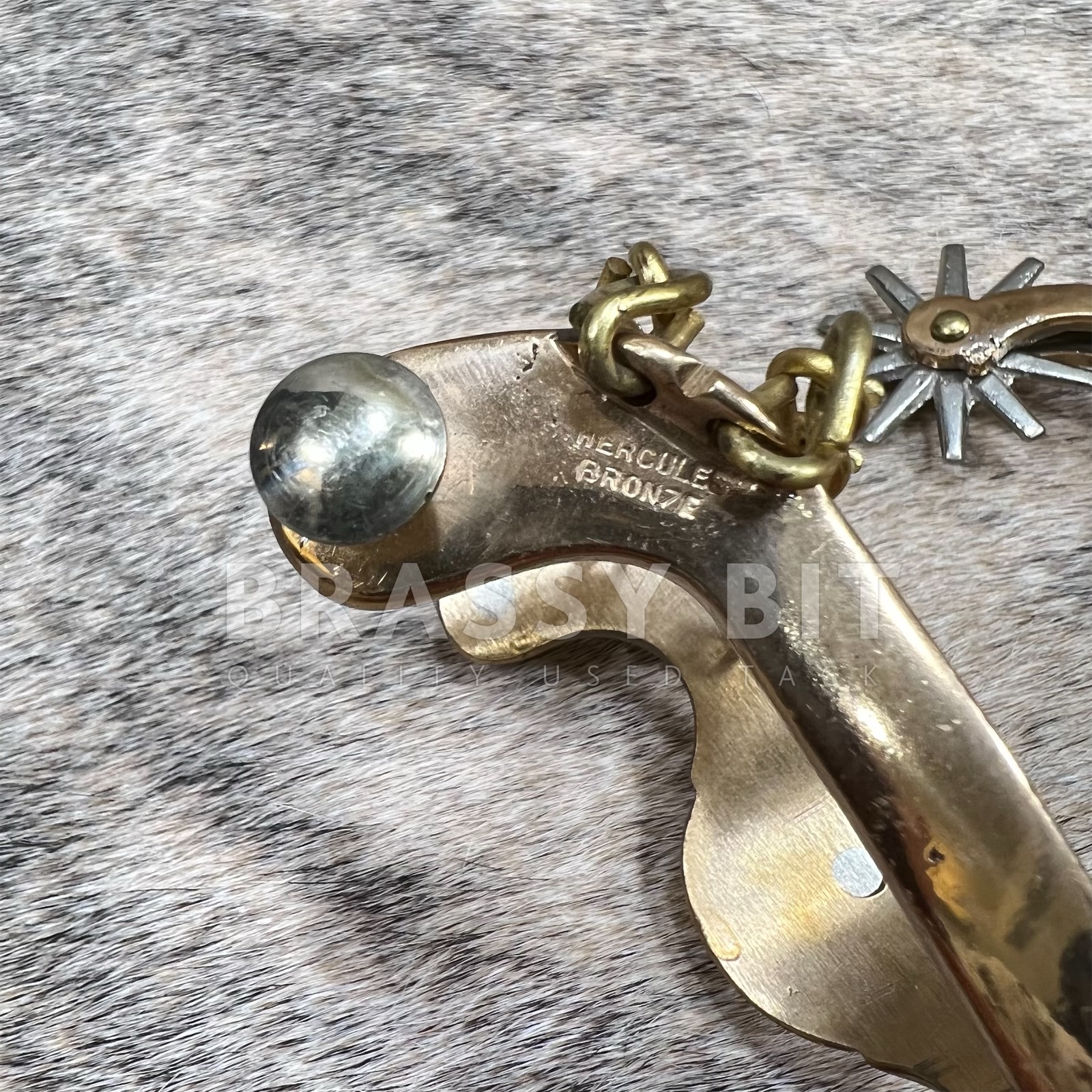 These are a nice set of spurs, from the incredible bit and spur maker August Beurmann. The Hercules Bronze line of spurs from North and Judd are iconic and highly sought after to collect and to use. Marked with the anchor stamp and Hercules Bronze. Large horse head detail on the side in nickel silver, with nickel silver rowels. Came from a well respected and life-long collectors collection, these are incredible and have a great look. Large, 10 point rowels, free spinning. These spurs are a truly vintage item and are in excellent, collectors condition. Heel chains are intact, no major condition issues, only showing some scratches from use and time. Sound and tight. Measures 2 7/8″ heel space, 3 3/8″ from inside to edge of spur, 2 3/4″ neck as measured from the end of the rowel to the inside of the spur. Very attractive, a great classic look, and ready to use or add to a collection.