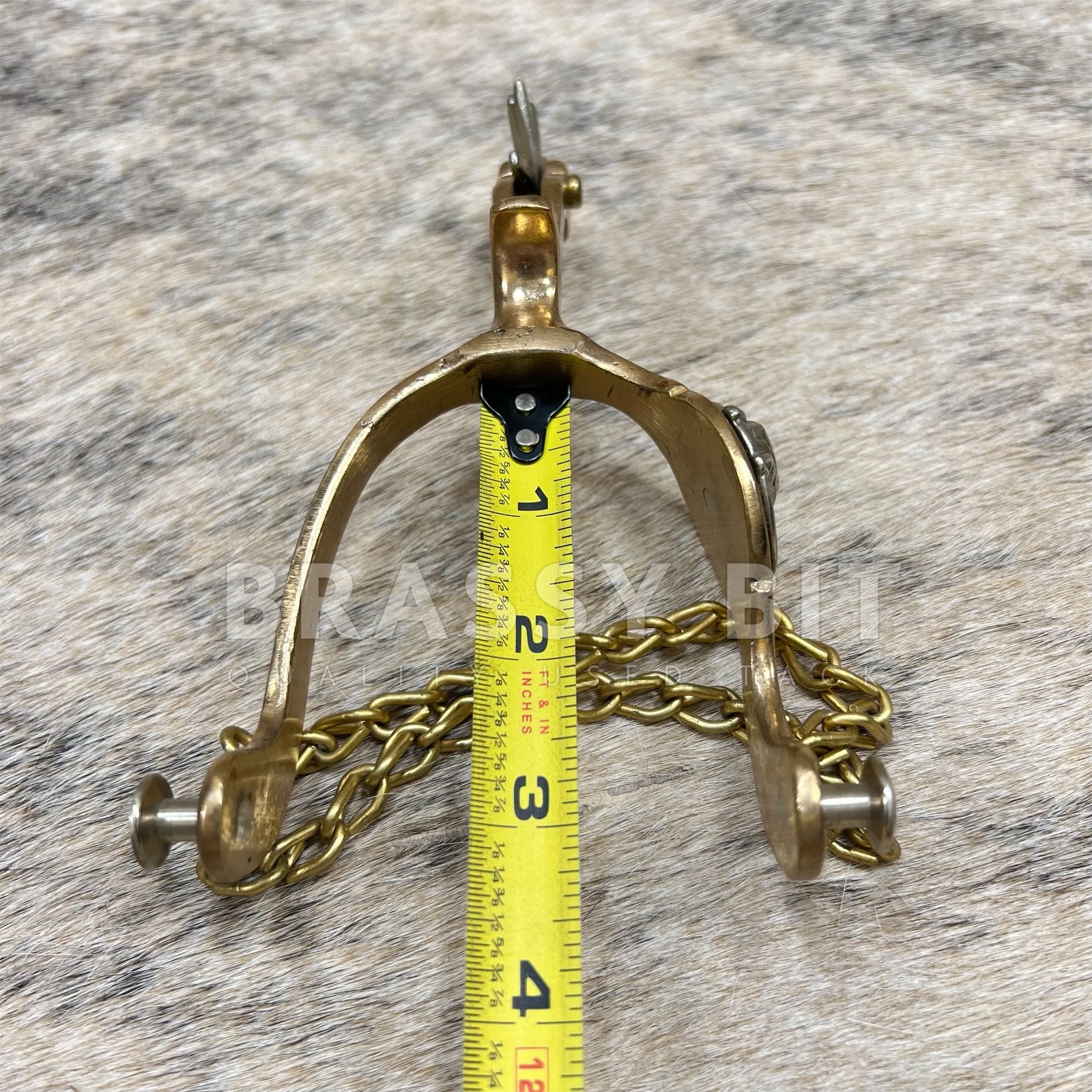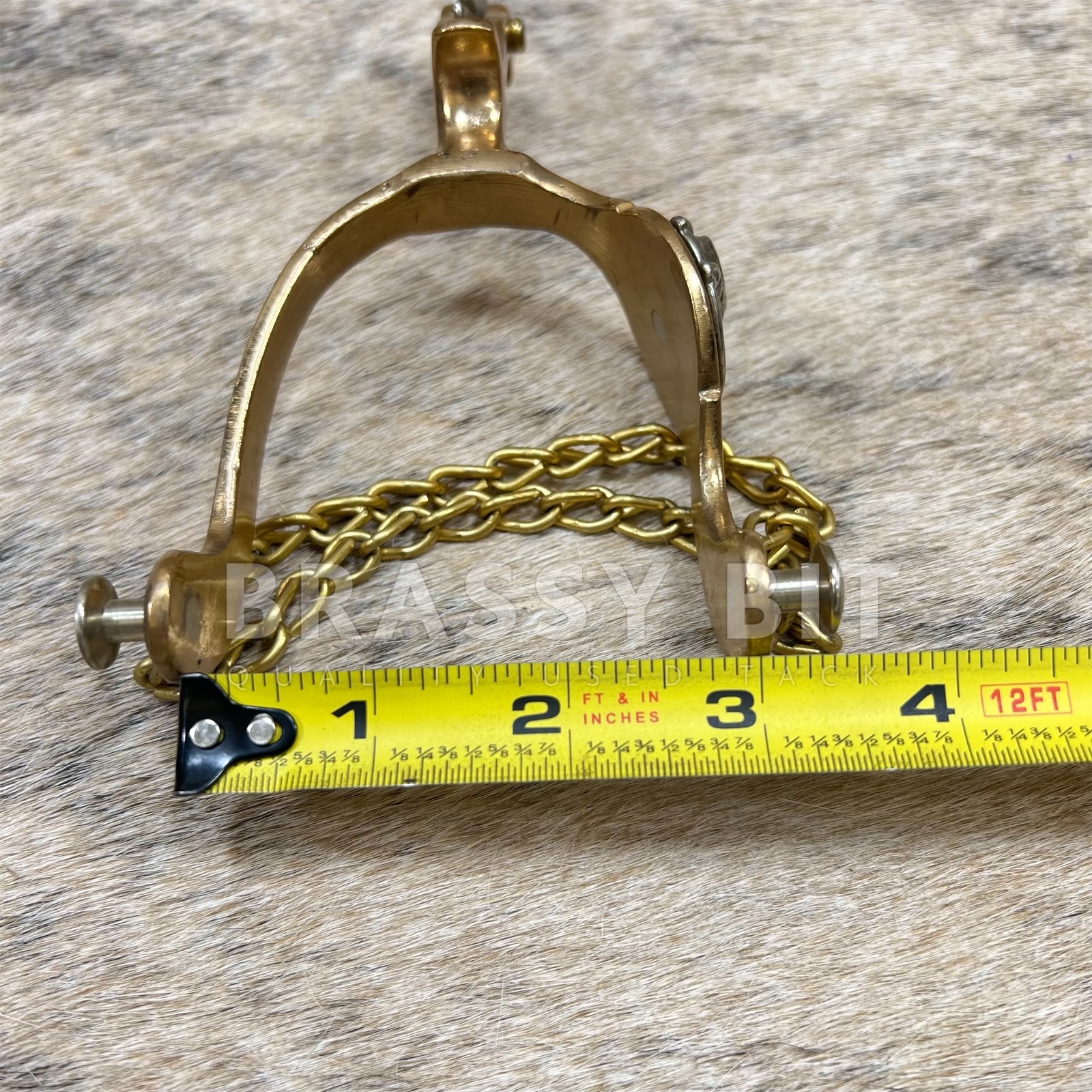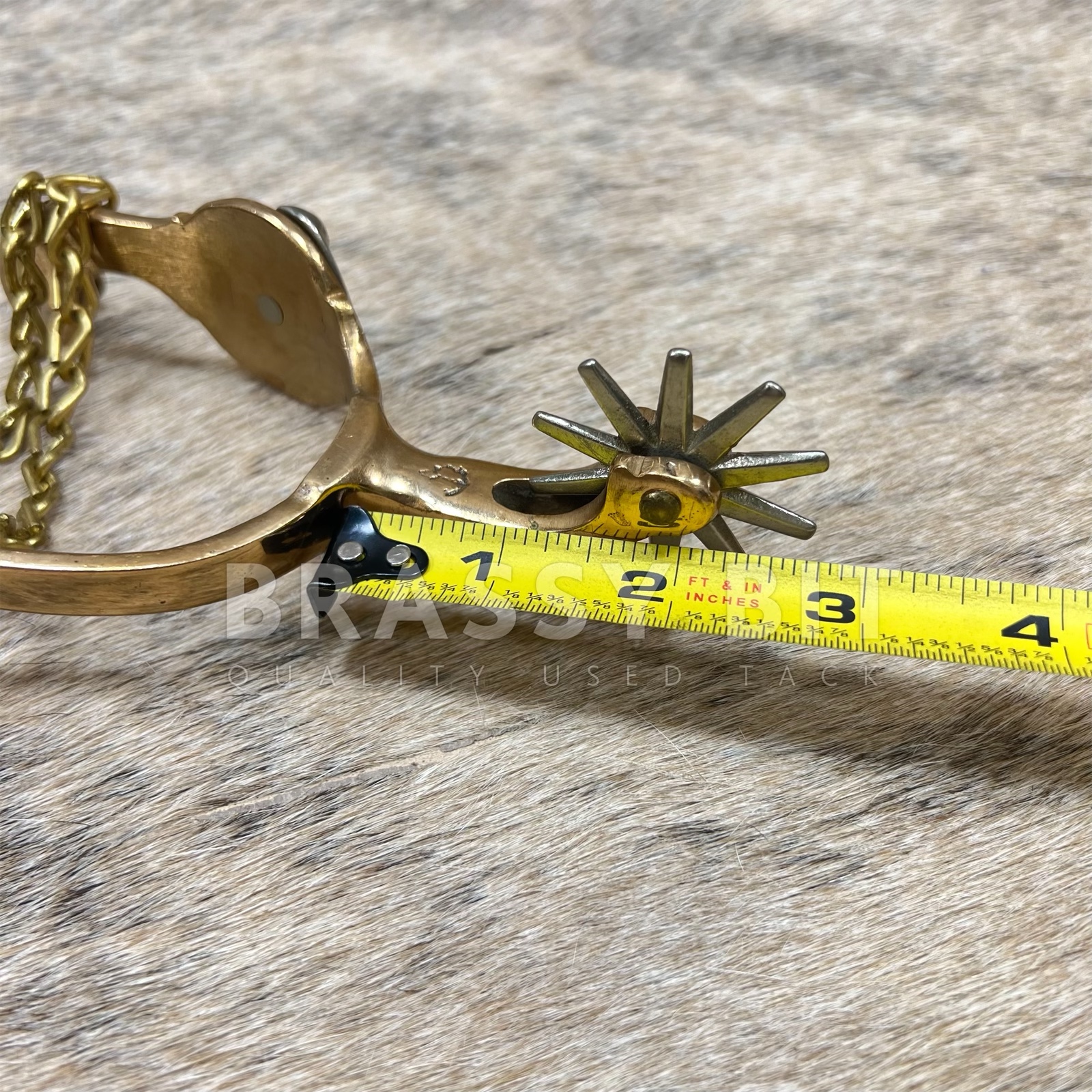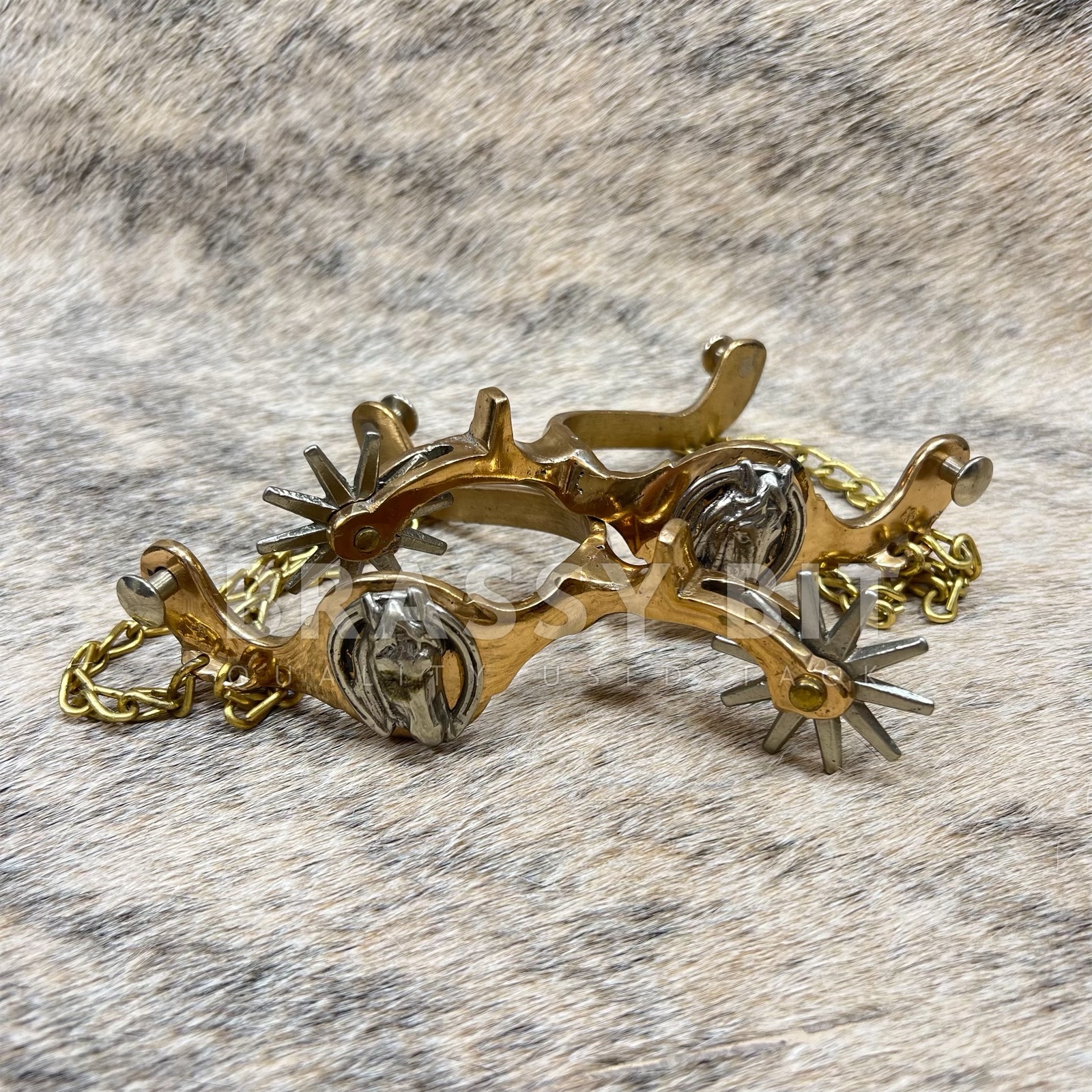 These are a nice set of spurs, from the incredible bit and spur maker August Beurmann. The Hercules Bronze line of spurs from North and Judd are iconic and highly sought after to collect and to use. Marked with the anchor stamp and Hercules Bronze. Large horse head detail on the side in nickel silver, with nickel silver rowels. Came from a well respected and life-long collectors collection, these are incredible and have a great look. Large, 10 point rowels, free spinning. These spurs are a truly vintage item and are in excellent, collectors condition. Heel chains are intact, no major condition issues, only showing some scratches from use and time. Sound and tight. Measures 2 7/8″ heel space, 3 3/8″ from inside to edge of spur, 2 3/4″ neck as measured from the end of the rowel to the inside of the spur. Very attractive, a great classic look, and ready to use or add to a collection.