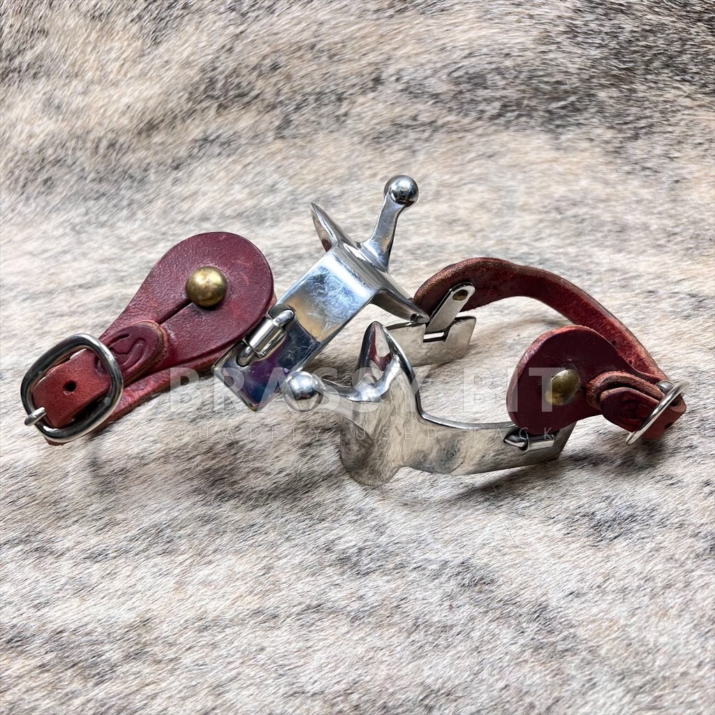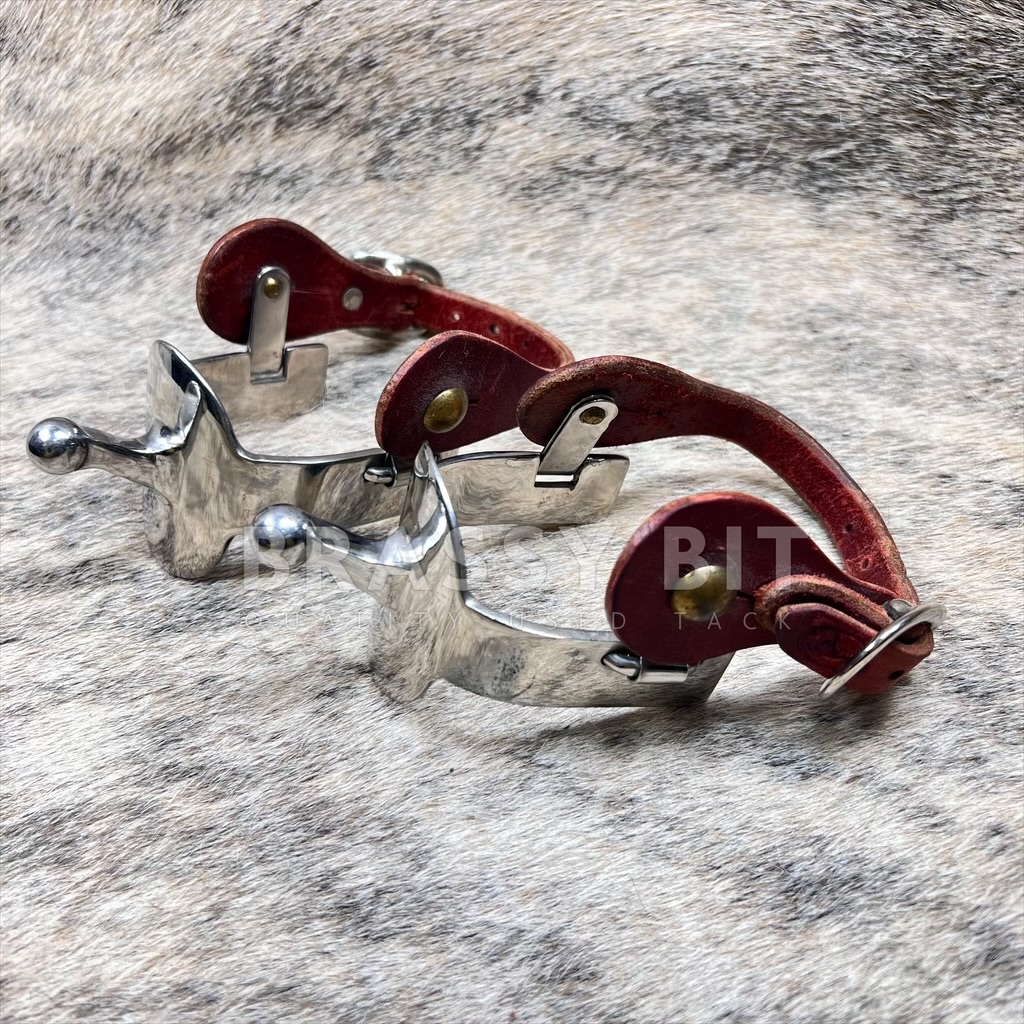 These are a nice set of spurs from famed Natural Horsemanship trainer, Clinton Anderson. CA, despite their popularity, only offers spurs for a very short time, and you rarely see them one the used market. Even rarer, to see them in this condition. Unisex, with shorter, slightly upturned necks with ball/blunt ends. Have CA’s patented stay-put design with a wider heel at the neck, fitting most boots. Alls stainless, are quite weighty, and have a great look. Comes with a set of CA spur straps too, only marked on the spur straps. These are patented by Clinton Anderson. In excellent, lightly used condition. Measurements: 3″ heel width, 3 3/8″ inside length, 7/8″ heel band, 2 5/8″ heel band at the neck, 1 5/8″ necks. Grab these while you can!