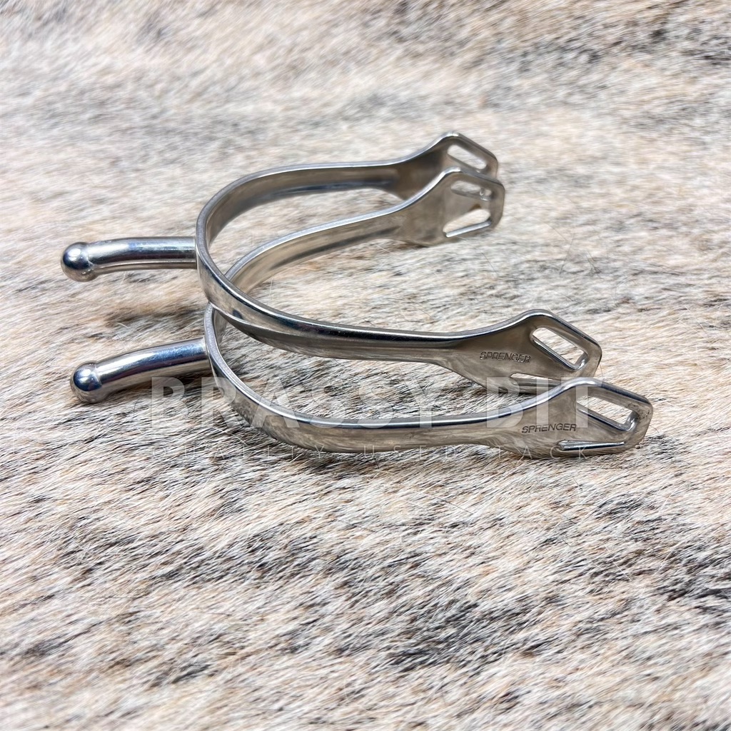 Nice, English spurs from one of our favorite brands, Herm Sprenger! Unisex spurs from their popular Ultra Fit spur line, in all stainless. Flared strap loop. Will fit numerous boots by simply bending to fit. Comes with the Balkenhol Fastening is an intelligent spur strap loop design with angled slots providing optimal ankle comfort and a secure fit against the boot. Slightly turned down, medium long neck that measuring 1 3/8″ and has ball end. In excellent used condition.