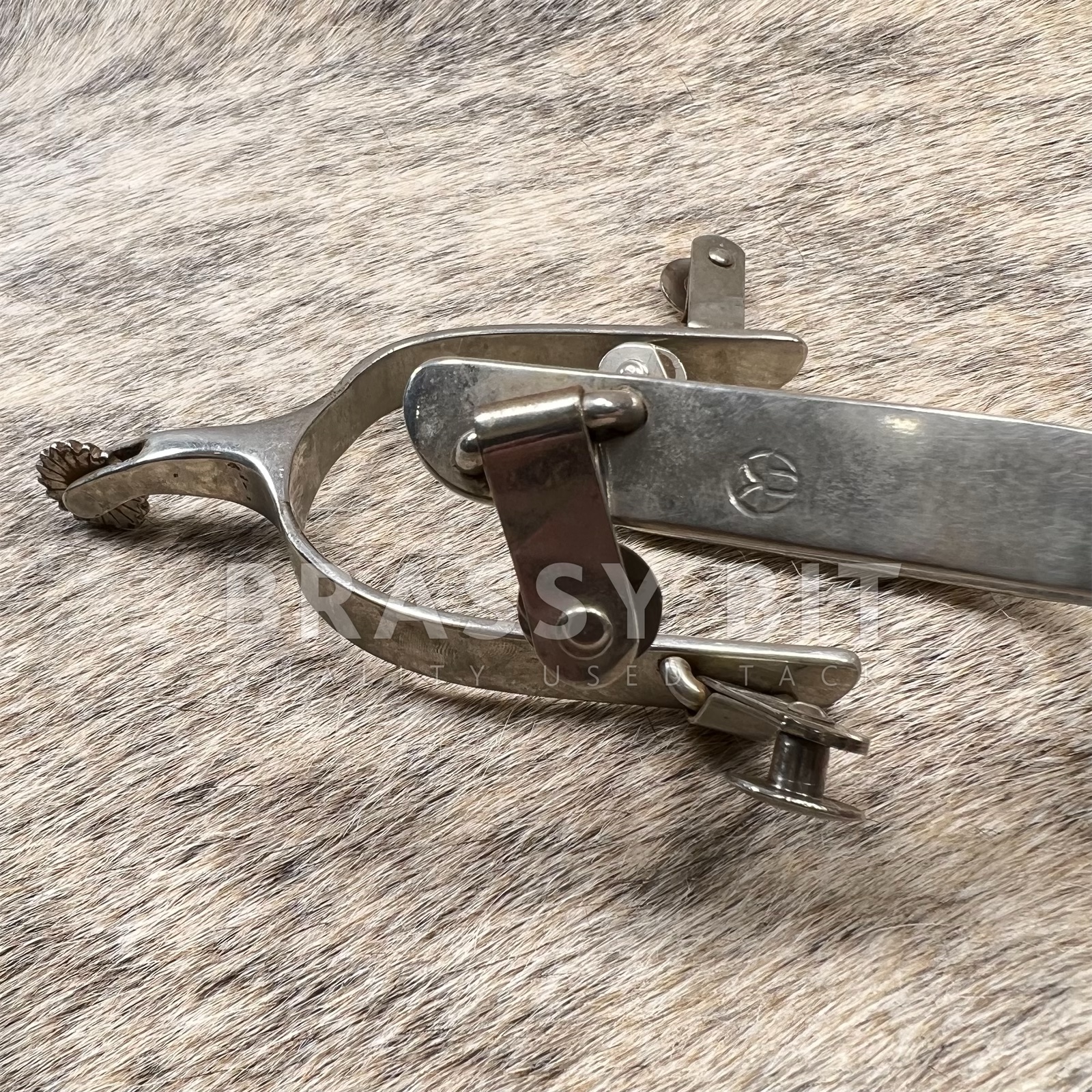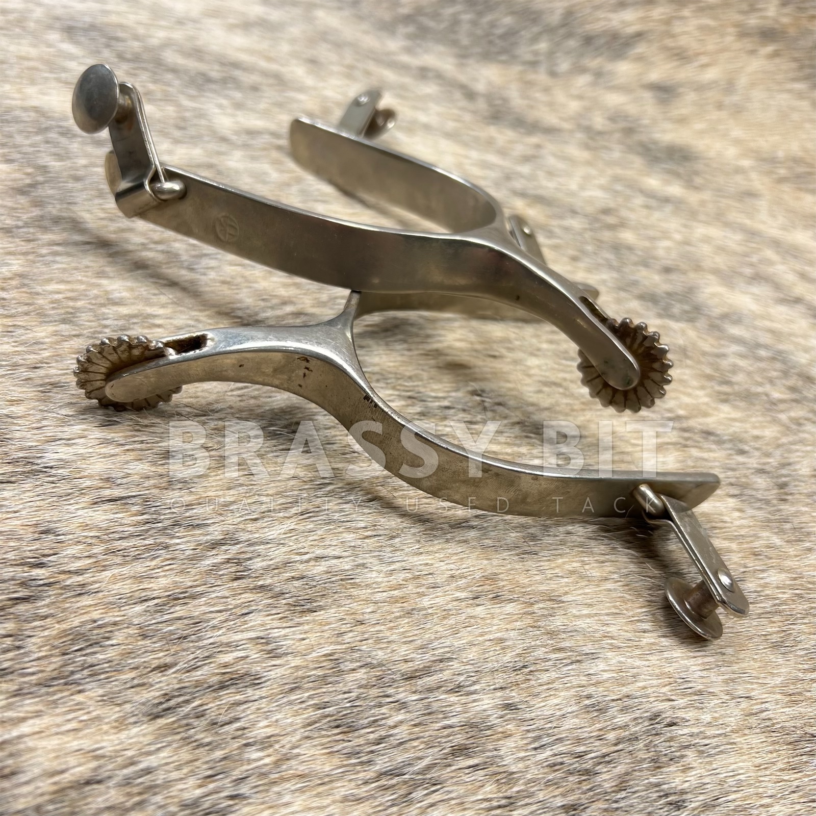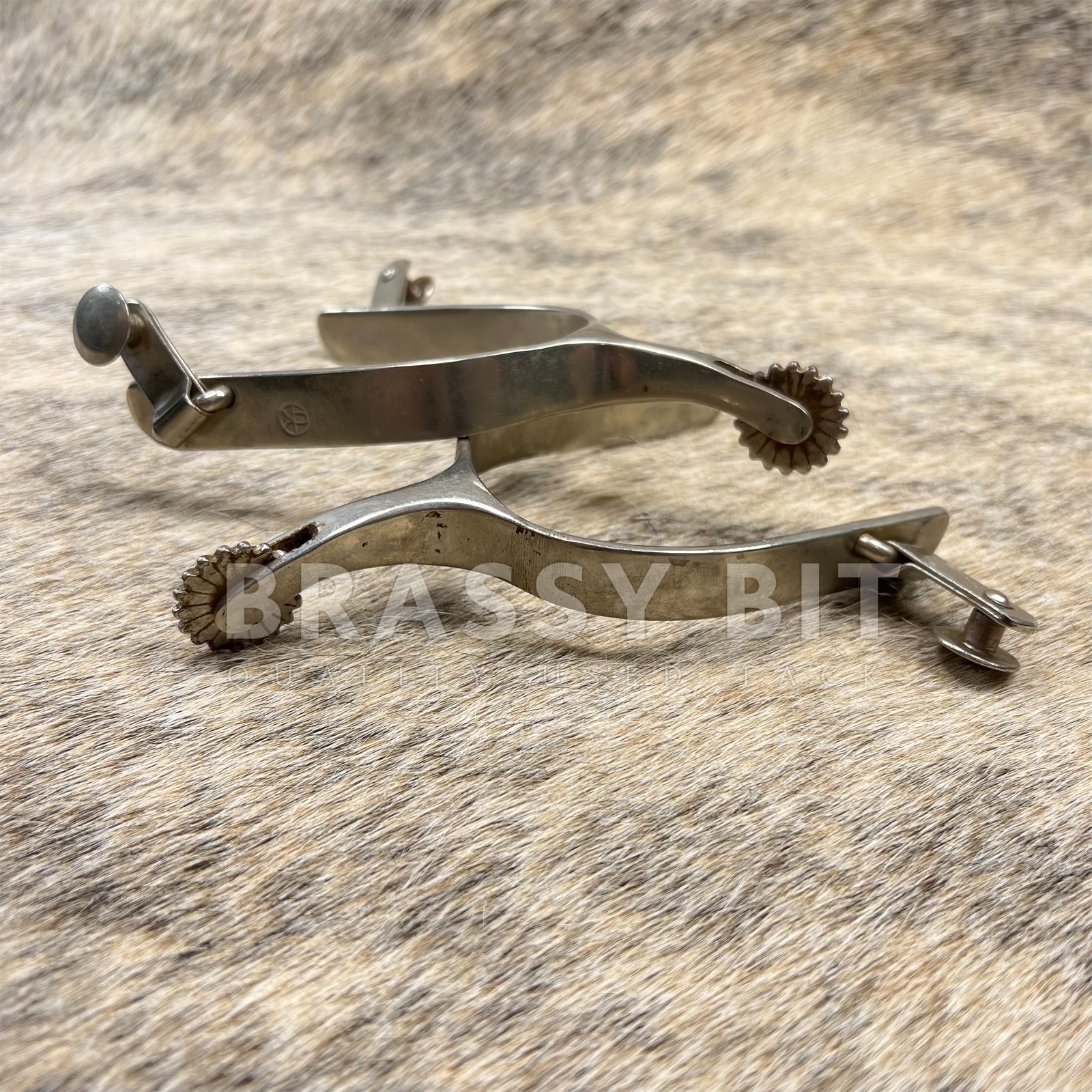 Here is a nice pair of spurs made by respected bit and spur maker Kyle Pettigrew. Marked with his mark, KP, these are a nice pair of more simple, thinner band spurs. In a typical style of Pettigrew, just more refined. Slightly downturned neck, smaller rowels, in stainless over iron. **These have a couple blemishes** Has a small dent/defect on the front of the band, near the neck that is pushed in just a bit. This has caused the stainless layer to start to flake/bubble. However, these spurs are sounds and are not cracked. Usable as is. In good condition ll around. These are ready to ride. 2 7/8″ inside heel width, 3 3/8″ inside length, 2″ neck including rowel, 5/8″ heel band.