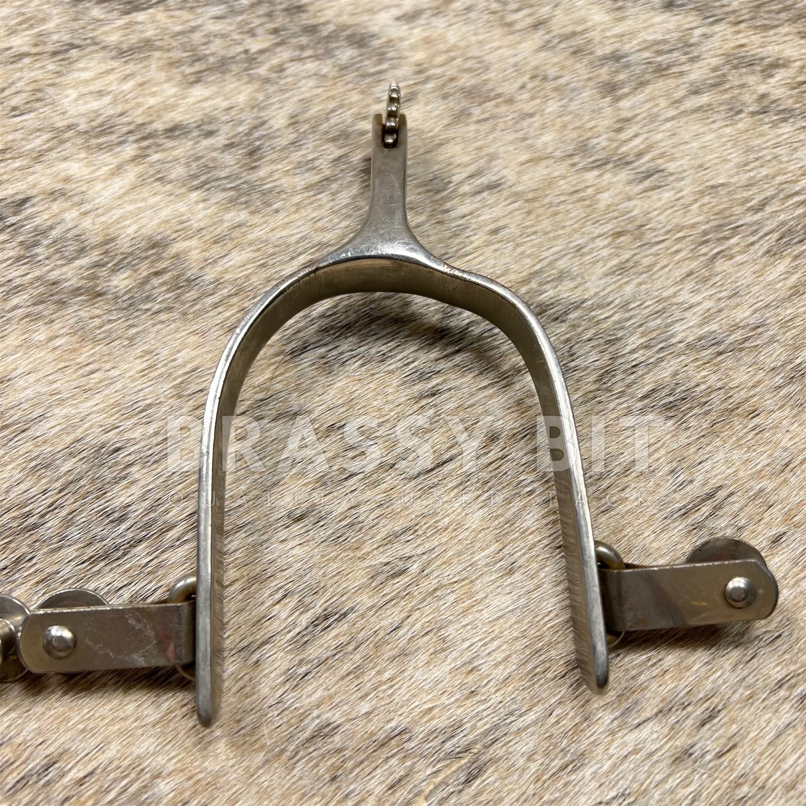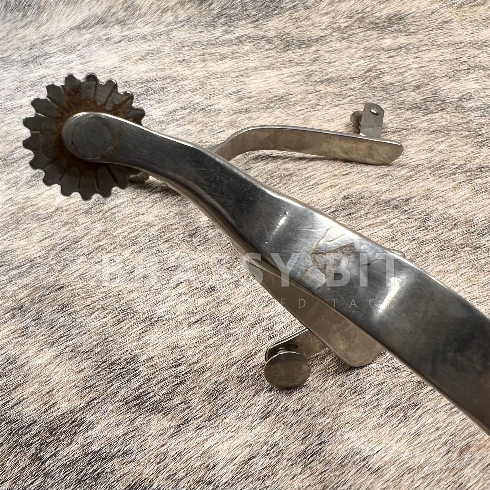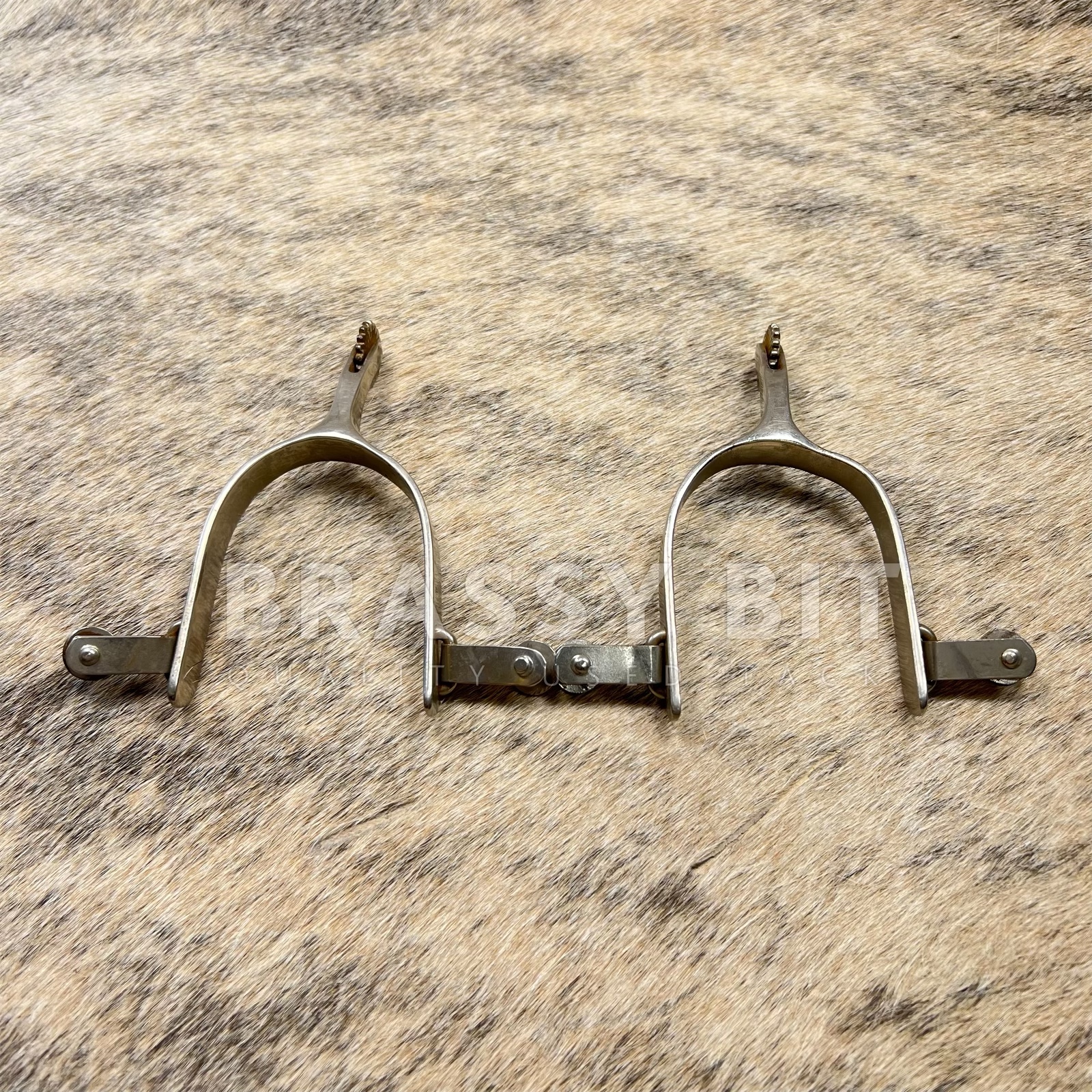 Here is a nice pair of spurs made by respected bit and spur maker Kyle Pettigrew. Marked with his mark, KP, these are a nice pair of more simple, thinner band spurs. In a typical style of Pettigrew, just more refined. Slightly downturned neck, smaller rowels, in stainless over iron. **These have a couple blemishes** Has a small dent/defect on the front of the band, near the neck that is pushed in just a bit. This has caused the stainless layer to start to flake/bubble. However, these spurs are sounds and are not cracked. Usable as is. In good condition ll around. These are ready to ride. 2 7/8″ inside heel width, 3 3/8″ inside length, 2″ neck including rowel, 5/8″ heel band.