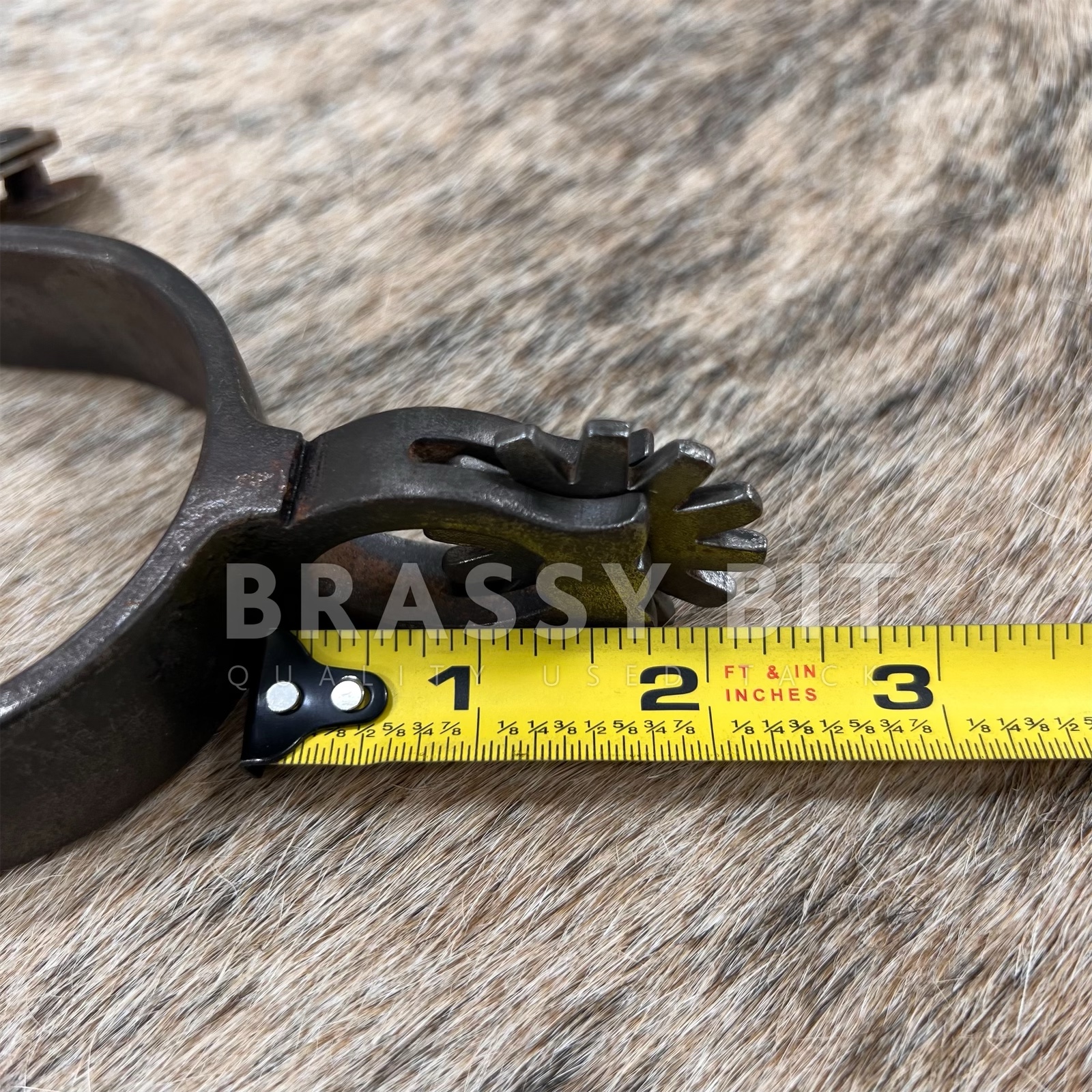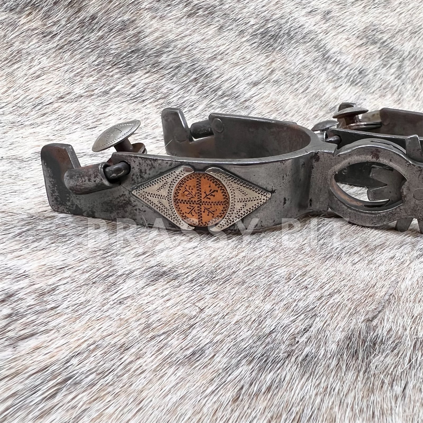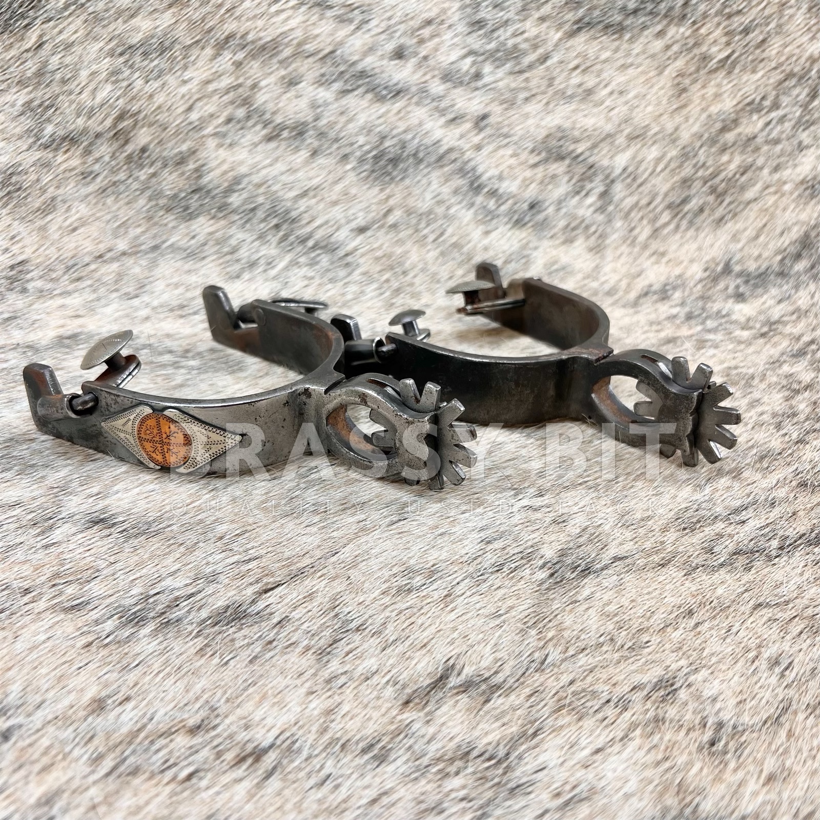 These are a nice set of spurs, from the incredible bit and spur maker Ned Martin. Ned and Jody Martin have become some of the most respected modern spur makers with an incredible following and even more incredible skill. Just take a look at the spur necks on these ones! These single mounted western spurs are in excellent, hardly used condition. Marked NM 719, these are blackened steel with a great design on the outside with copper accents. There is even silver on the buttons. Larger rowels with 12 points. Measures 3 1/4″ inside heel width, 3 1/2″ long from inside to edge of spur, 2 3/8″ neck as measured from the end of the rowel to the inside of the spur. Have a great weight to them. Very attractive, a great classic look, and ready to use or add to a collection.