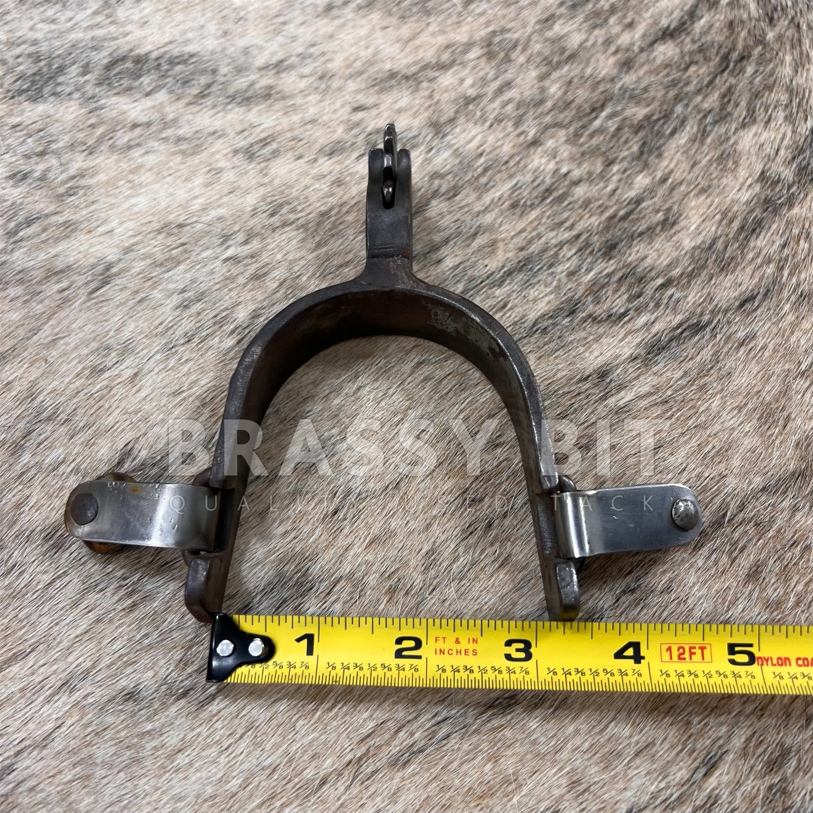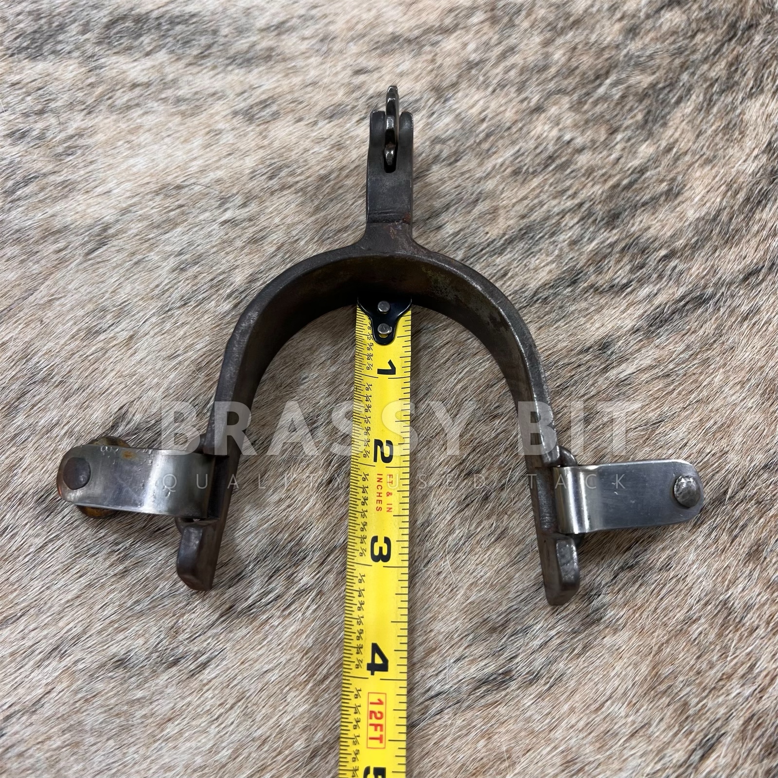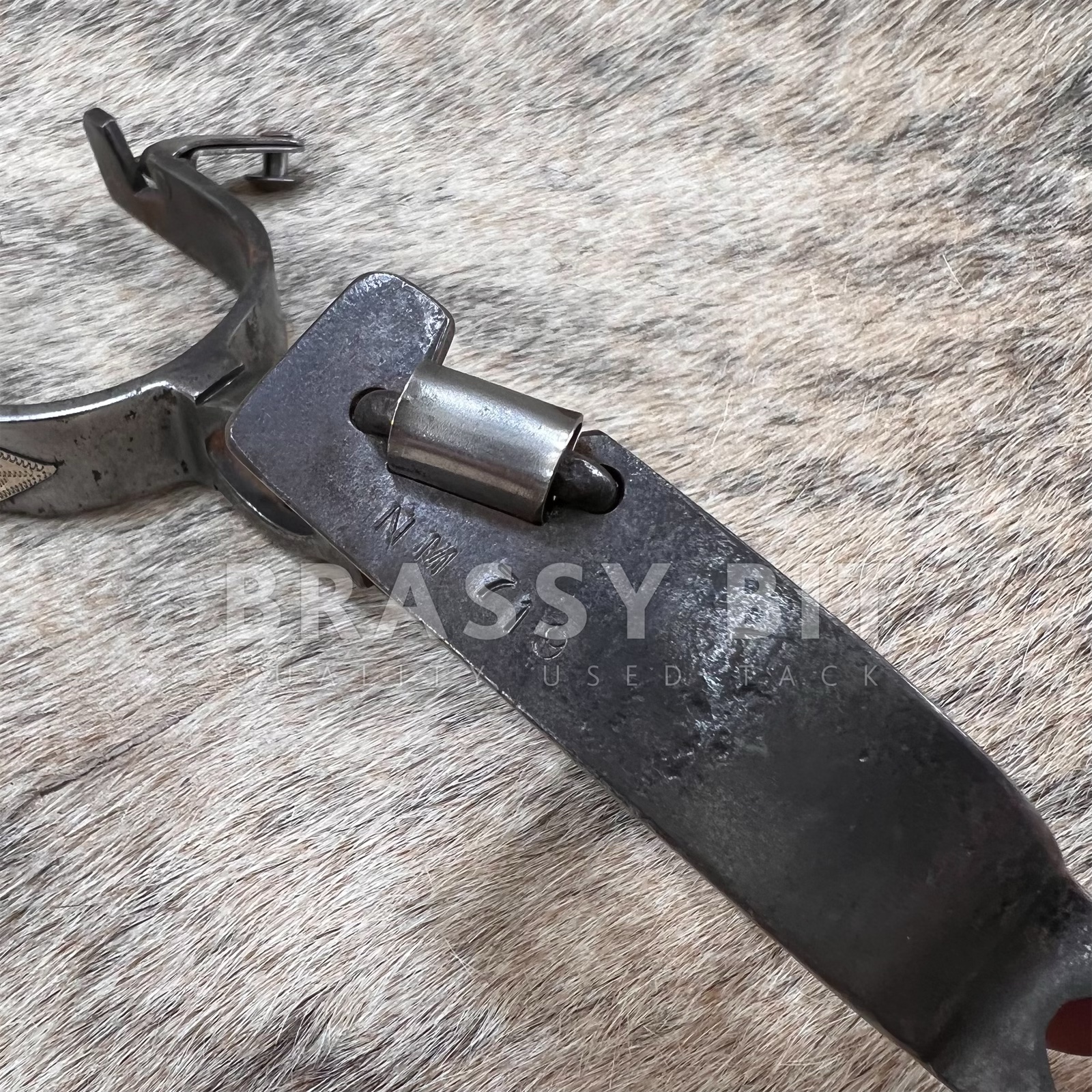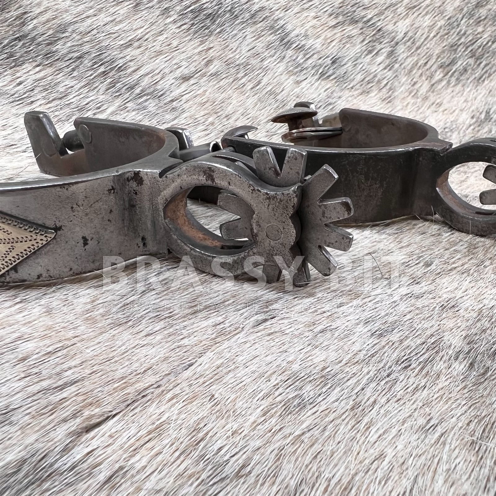 These are a nice set of spurs, from the incredible bit and spur maker Ned Martin. Ned and Jody Martin have become some of the most respected modern spur makers with an incredible following and even more incredible skill. Just take a look at the spur necks on these ones! These single mounted western spurs are in excellent, hardly used condition. Marked NM 719, these are blackened steel with a great design on the outside with copper accents. There is even silver on the buttons. Larger rowels with 12 points. Measures 3 1/4″ inside heel width, 3 1/2″ long from inside to edge of spur, 2 3/8″ neck as measured from the end of the rowel to the inside of the spur. Have a great weight to them. Very attractive, a great classic look, and ready to use or add to a collection.