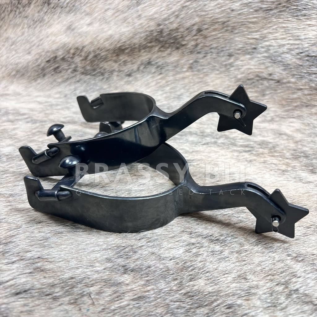 This pair of spurs are sure sharp! On blacked steal that have an almost matte finish, swan neck, and finished off with a medium size star rowel. Heavier duty, have a nice weight to them. While not branded, are nicer than a cheap, economy pair. These are new without tags/new old stock, never used, only stored. May show a minor mark or scuff from storage. Â Measurements: 3 1/4″ heel width, 3 1/2″ inside length, 1 1/2″ heel band, 3″ neck including rowel.