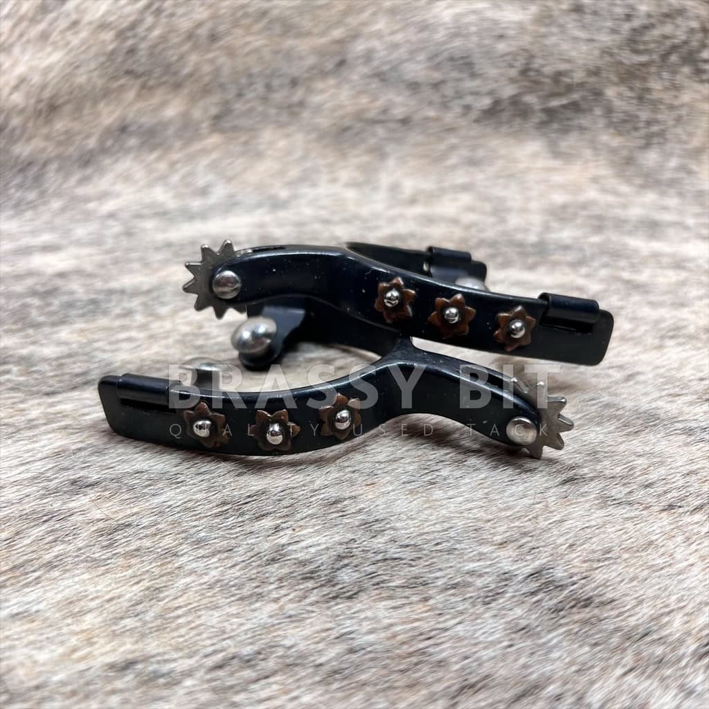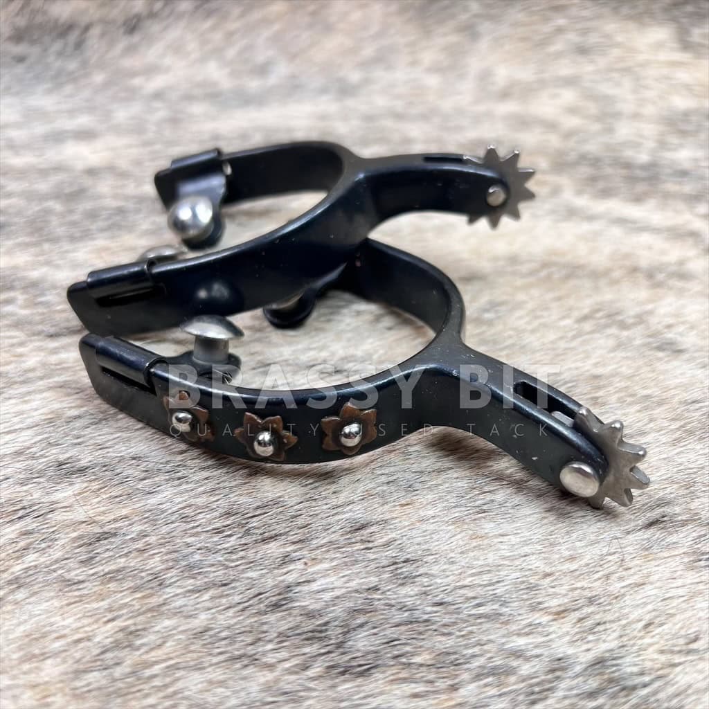 These are a nice set of spurs, one with a great look. New without tags from Weaver, in blackened steel with a very cute with copper flowers with silver dots in the center. Signle mounted. Shorter neck, with smaller rowels. These spurs have a great look, good weight, and well made. In ladies/youth size. New, without tags and offered far less than retail. Nice set here. Measurements: Inside width 2 1/2″, inside length 2 3/4″, neck including rowel 1 3/4″, heel band is 5/8″.