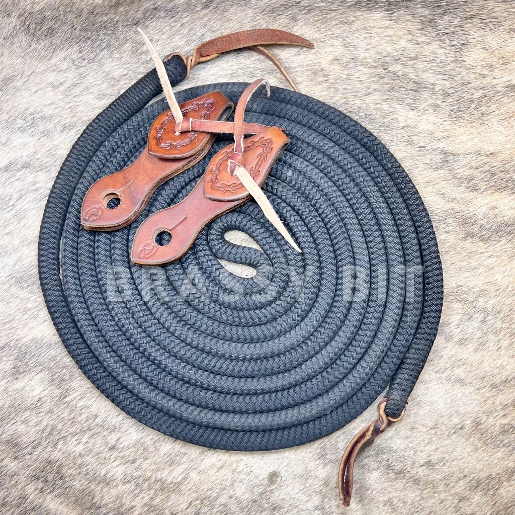 Here is a great opportunity to get a nice set of long mecate reins with tooled slobber ends from Clinton Anderson. Mecates are in black, 22′, 5/8″ diameter, and have leather poppers on each end. Very soft and have a nice weight and feel to them. Nice, heavy duty slobber straps that are marked CA and have a bit of barbed wire tooling on them. This set has seen far more storage than use, showing a bit of dust, but is in excellent condition. This is a nice set for less than retail!