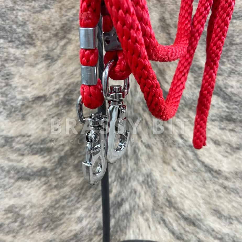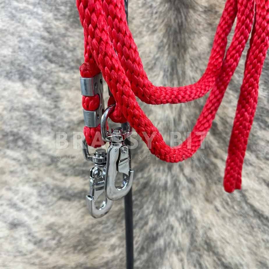 Nice, lightly used nylon reins that are thicker than most. In a bright cherry red, with heavy clip ends which give these a nice weight. Nylon material is quite soft. 82″ long.