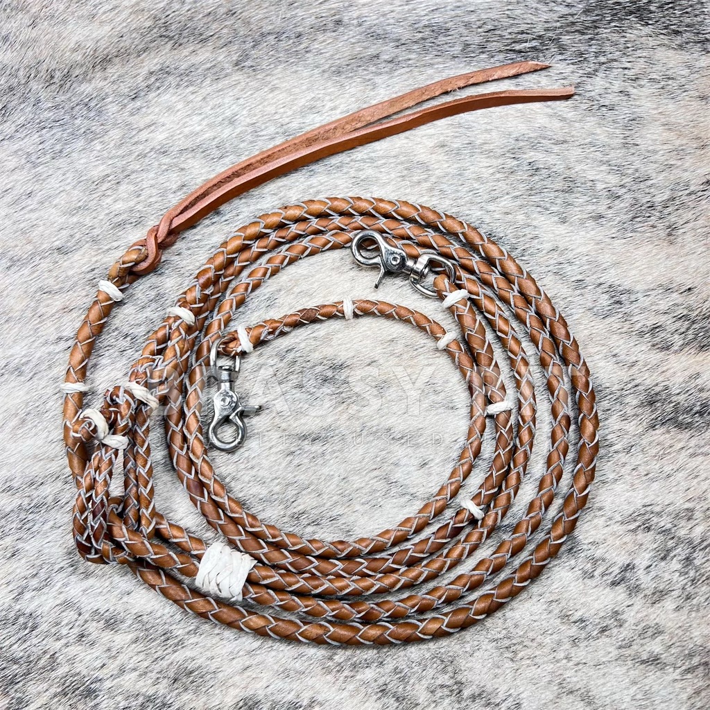Here is a nice set of romel reins with a nice, classic look. Made from plaited leather that are wider plaits with rawhide accents. Scissor clip bit ends. Not branded, not a super high end piece of tack, but is far nicer than economy. Honestly, these have the feel of being Amish made. Reins measure 43″, tail measures 50″ (with popper), 3/8″ diameter. In hardly used condition. Clearly made from nice leather that will soften up in no time from use and a bit of conditioning. We’ve replaced the popper on it with leather that matches better than the original one. Nice set at a great price. Ready to use or show!