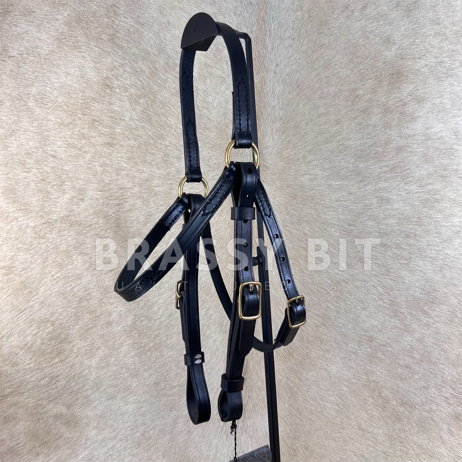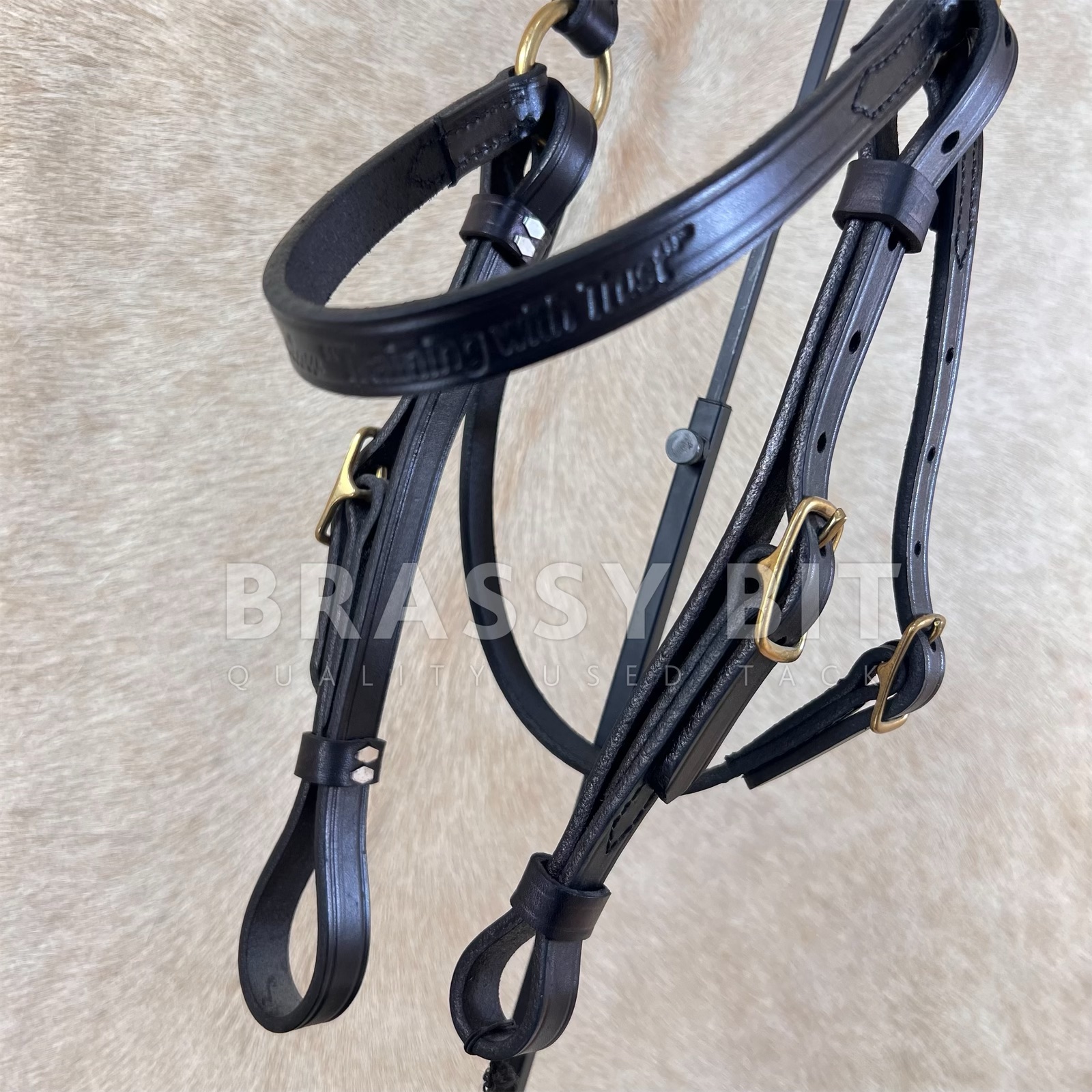 This Australian style trail headstall from the team up of Circle Y and Kenny Harlow is a new/old stock item just waiting to hit the trails. These headstalls secure through bit loops on the cheeks, with quick change buckles for great security. In a medium/chestnut oiled leather with all brass hardware, in skirting leather. This one is new with tags, and is ‘technically’ new old stock, so may show a mark or two, but never used. This one has a ton of adjustability, going small enough for a cob and large enough for a larger horse. Is Horse size.