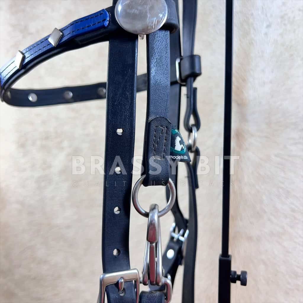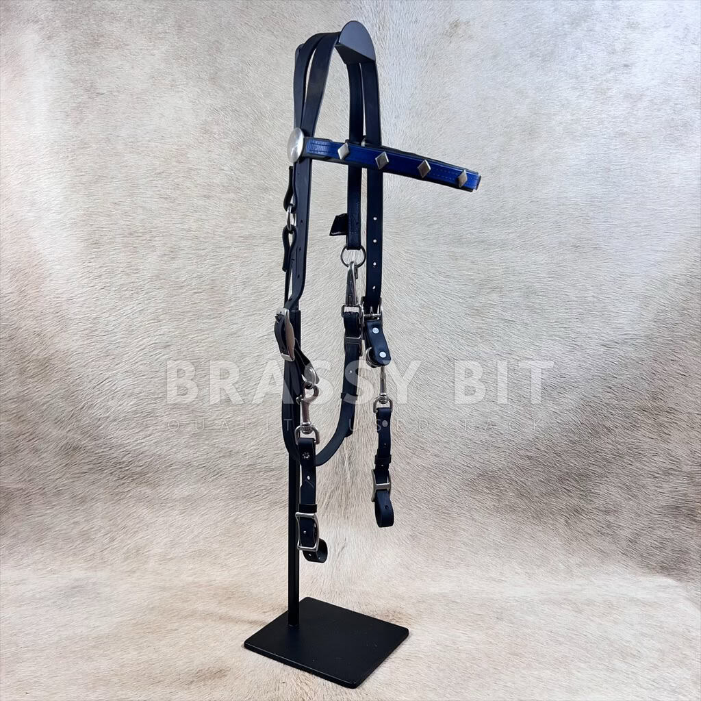 This is a high end bridle, from the very popular and trusted company, Distance Depot. This bridle is a heavy duty yet soft, biothene (beta biothane) material that offers a ton of adjustability. In black with blue overlay on the browband, with sharp stainless diamond conchos on the brow and larger round stainless concho on the side of the brow. Horse size offering a lot of adjustment. Heavy duty hardware on this one. The bit attachment is quite handy with this bridle, with snaps that quickly connect the bridle, with conway buckle bit ends. In excellent used, condition. This is a really nice bridle and offered way way less than retail.