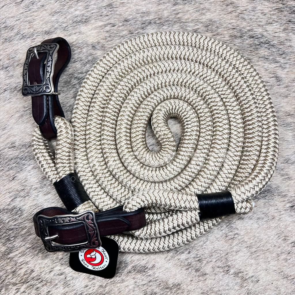 These are nice reins! New from one of our favorite Minnesota companies, Do or Do Knot (DODK). Made with the best materials available, great weight and feel, and an even better look! Very soft, tan yacht rope, connected mecate style reins that have very dark oiled leather bit ends and Jeremiah Watt buckles. Some adjustment at the bit ends, measuring 60″ (10′ total length) from bit end to center, 3/4″ diameter. Great, longer length. We just love these reins! Great quality!
