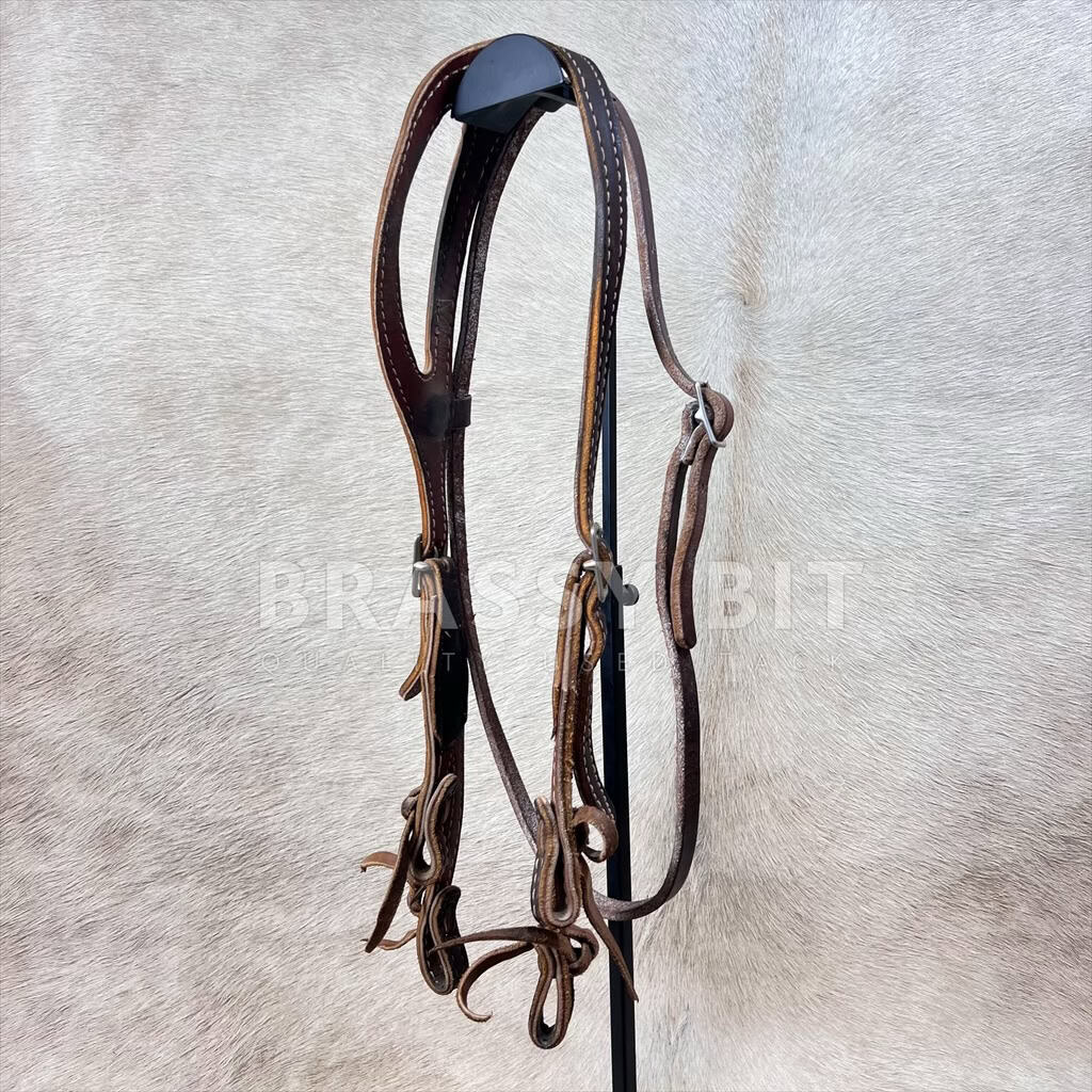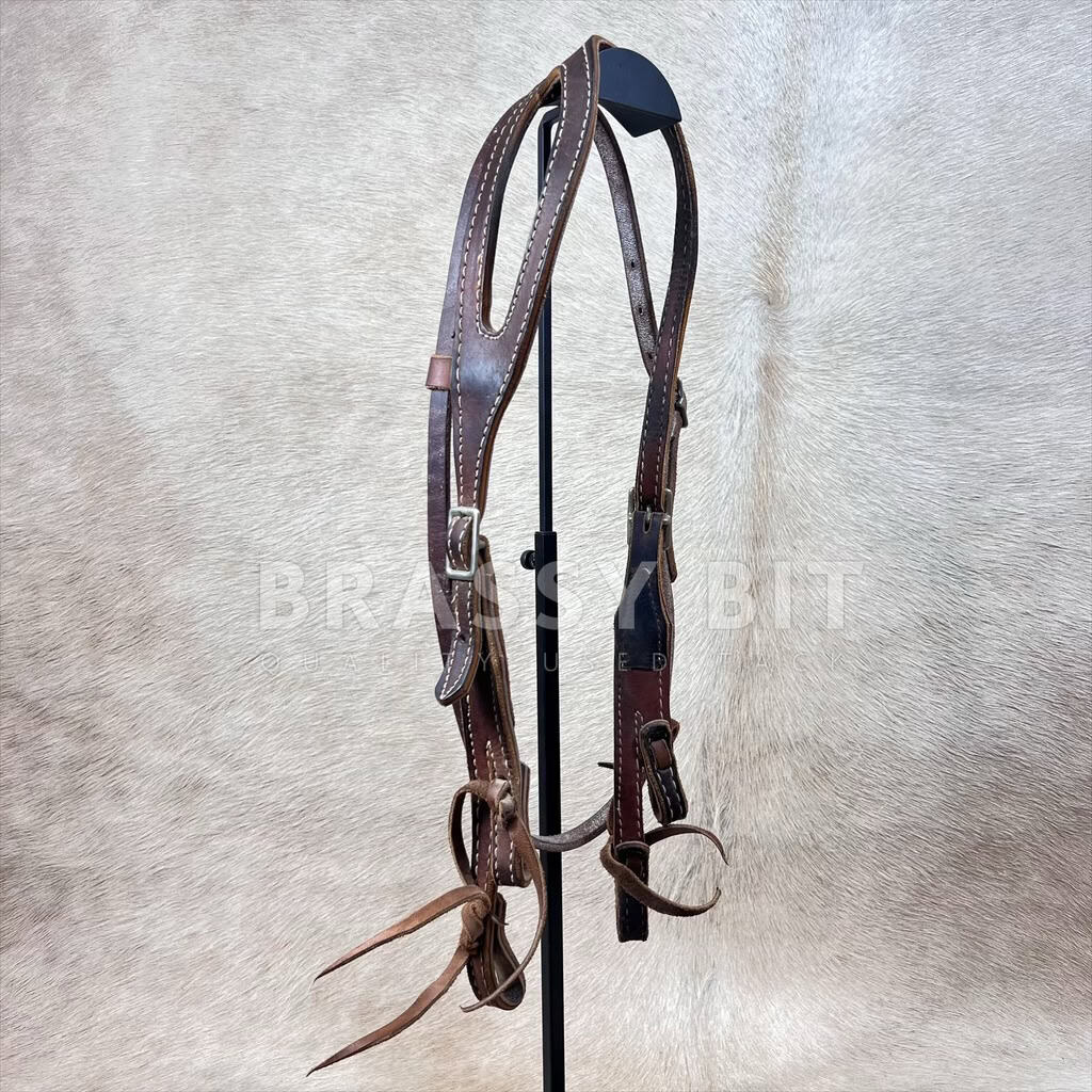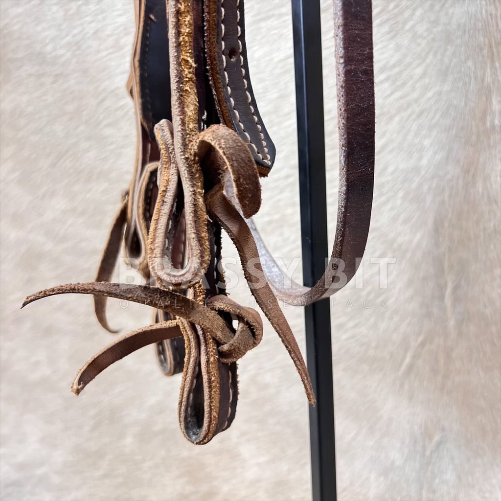 This is kinda cool! This is designed to be used with a combo bit or hackamore, or any bit option that has a nose band. It has a standard bit and nose band bit connection to help stabilize a bit or hackmore, and not let the side cheeks ride up into the eye. Fixed ear style, double stitched, and made for heavier duty leather. With throat latch. Amish made. This headstall is older, but has been well cared for and shows normal signs of use. Nothing fancy, but is plenty nice! Horse size, offers decent adjustability, tie bit ends. In darker oiled leather.