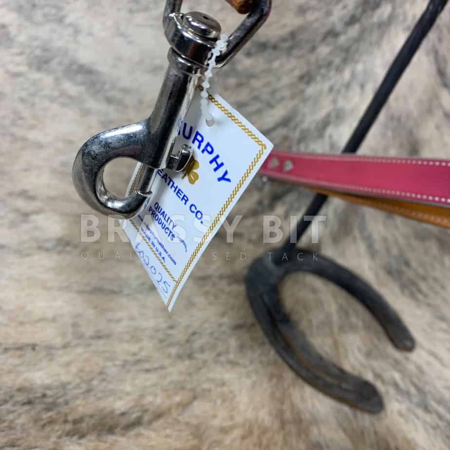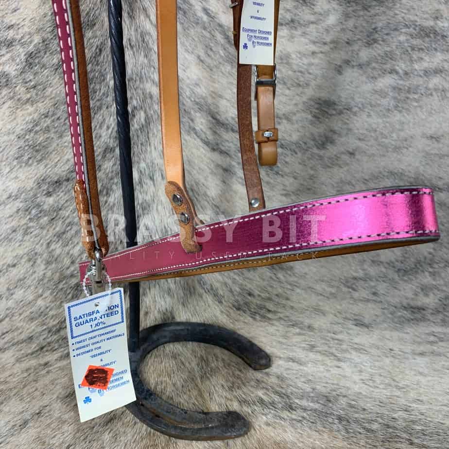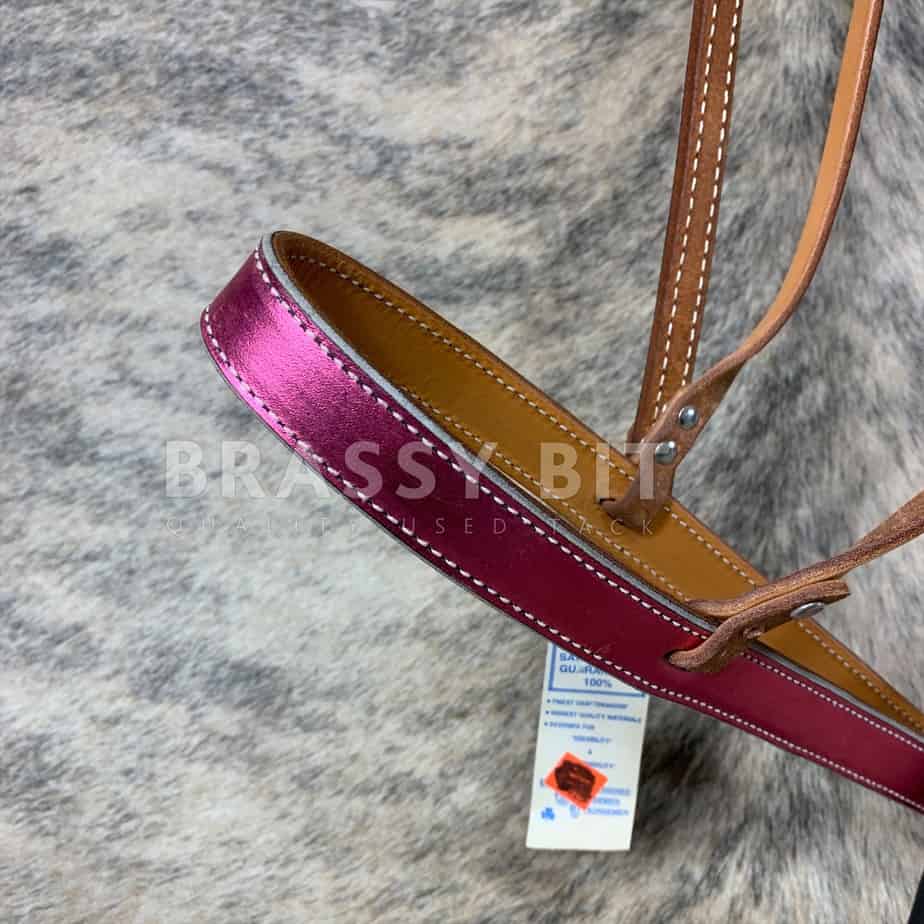 Goodness, is this ever a cool set New with tags from Murphy’s Leather Co, this one has light oiled leather with heavy stitching, overlaid in a metallic pink. This is a new, old stock item, so may have some scuffs from storage. The leather has gotten just a bit dry from hanging out in a shop, but after just a bit of oil here, its already softening up. This set is a noseband with tie down strap. All new, matching, and has such a great look!