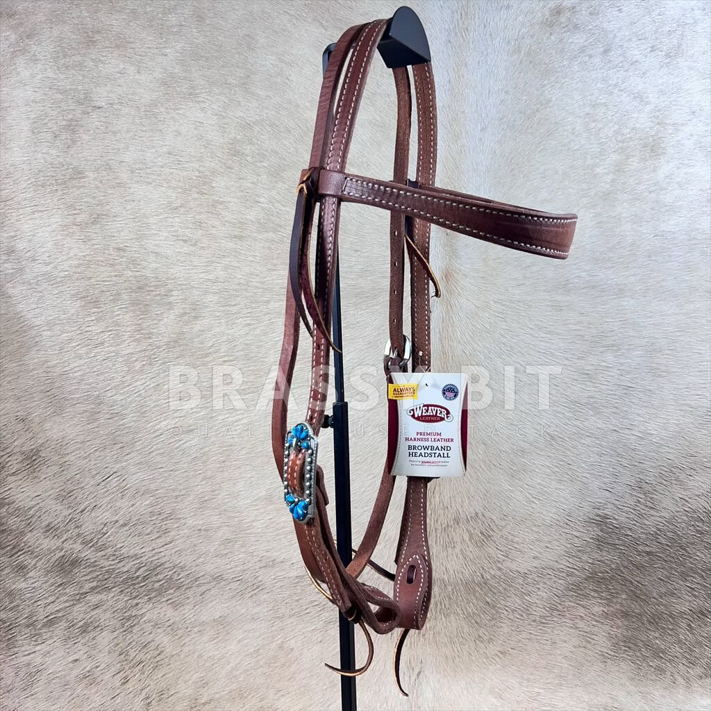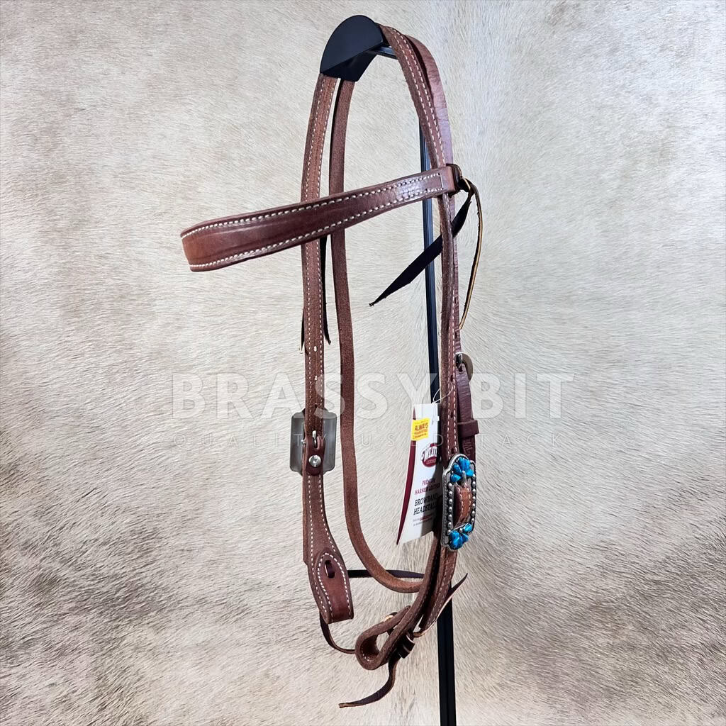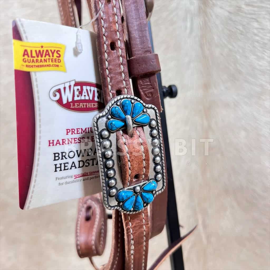 Here is a lovely headstall from Weaver. Great leather quality and construction and an even better look. From the Designer line of tack, made with butter soft harness leather in a medium/natural oiled leather, topped off with hardware that has inlayed faux turquoise with a floral motif. These buckles are so cool, giving this set an understated yet bling feel. This one has such a nice look! Horse size, good adjustability, going quite large. Crown measures (bit to bit) 37″-45″ with room for more holes. New with tags!