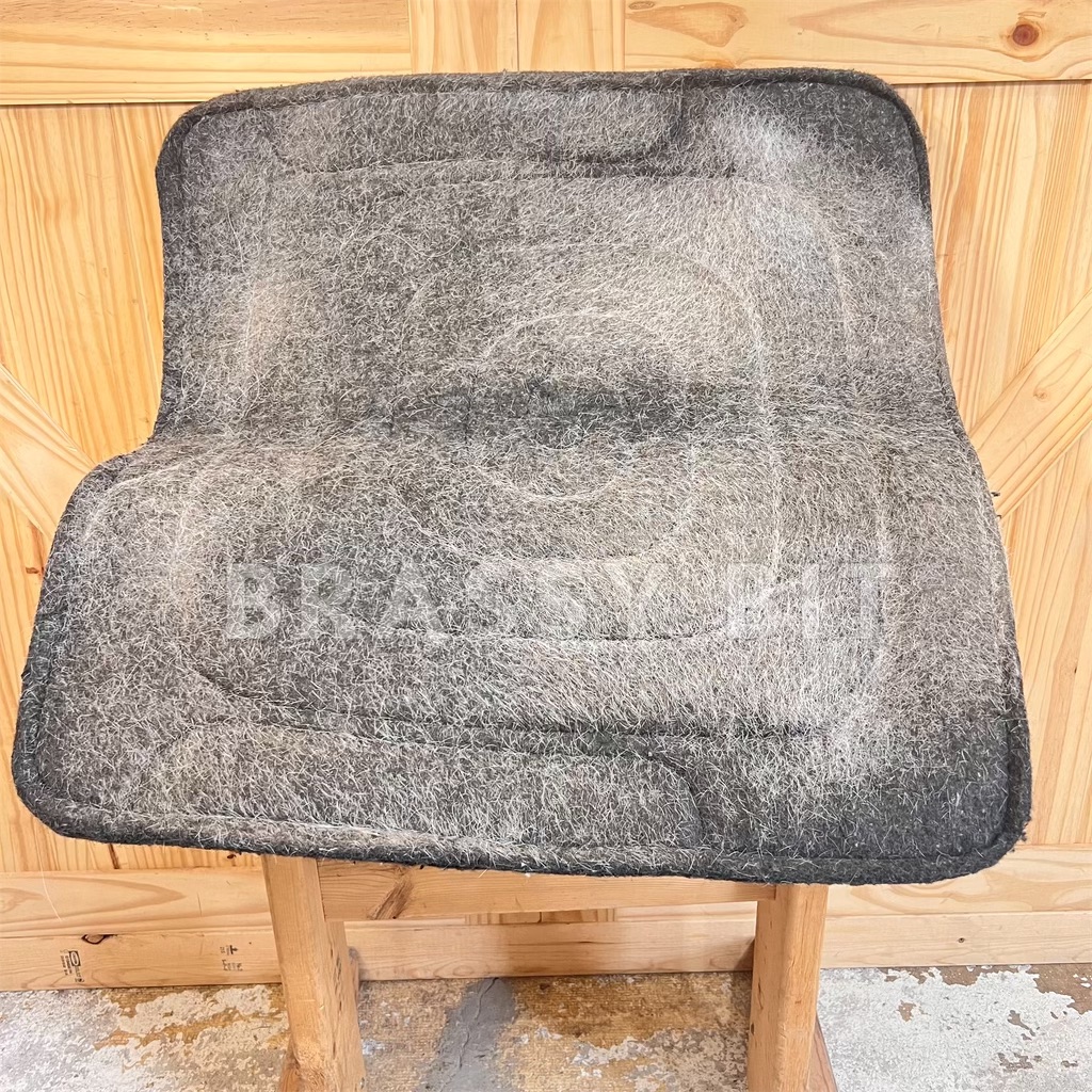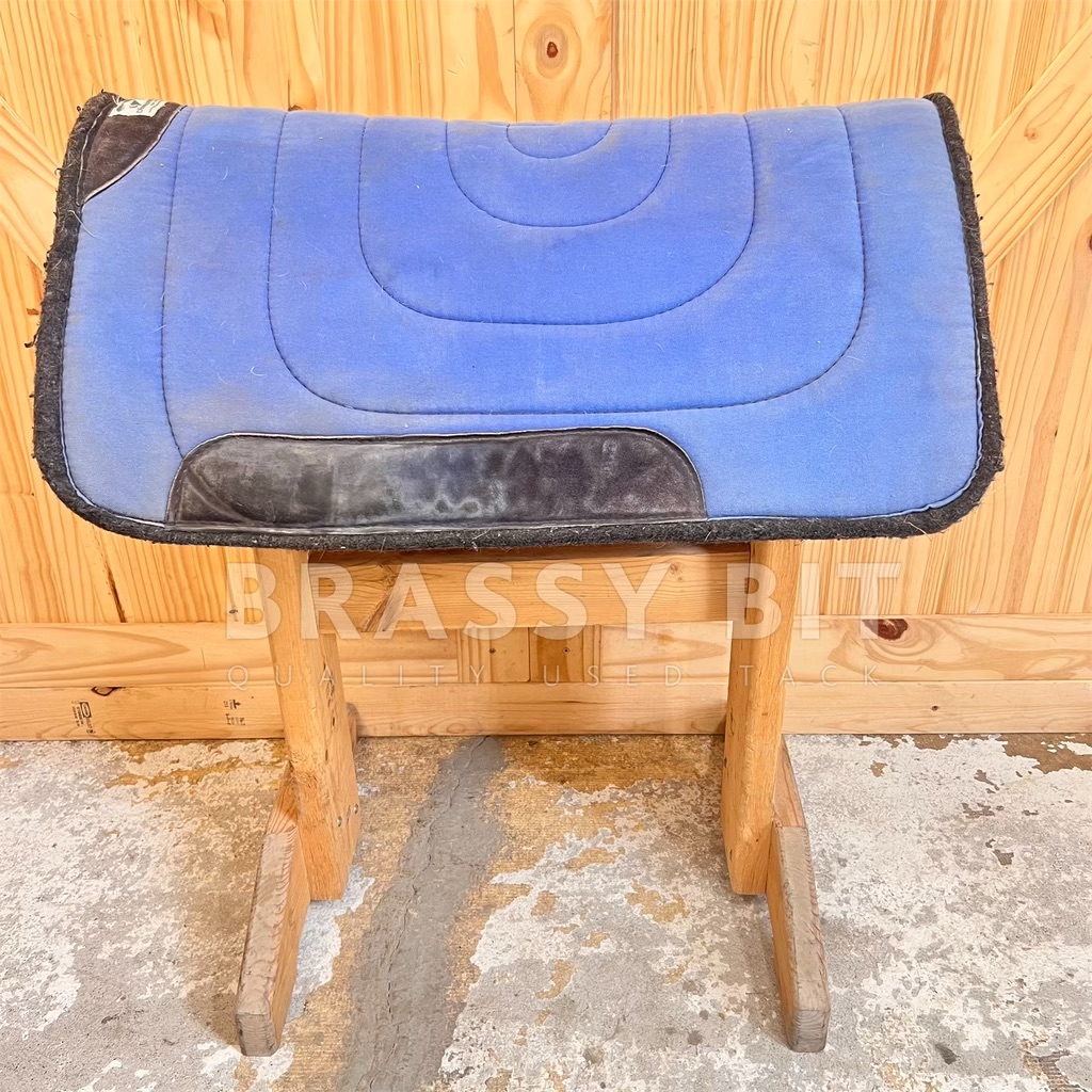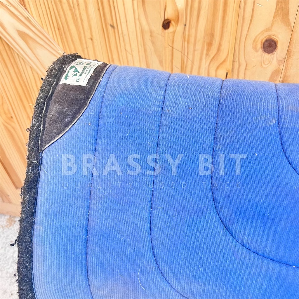 Here is a very nice saddle pad from Diamond Wool, proving you can have quality American made tack without an insane price tag. 28″ x 30″ x 7/8″. Durable canvas topside with felted wool underside. Square/full skirt style, in blue with heavy leather wear bars. This pad is in very good used condition and well maintained. Has not yet been washed this season so would benefit from a stiff brush or wash. These pads last!