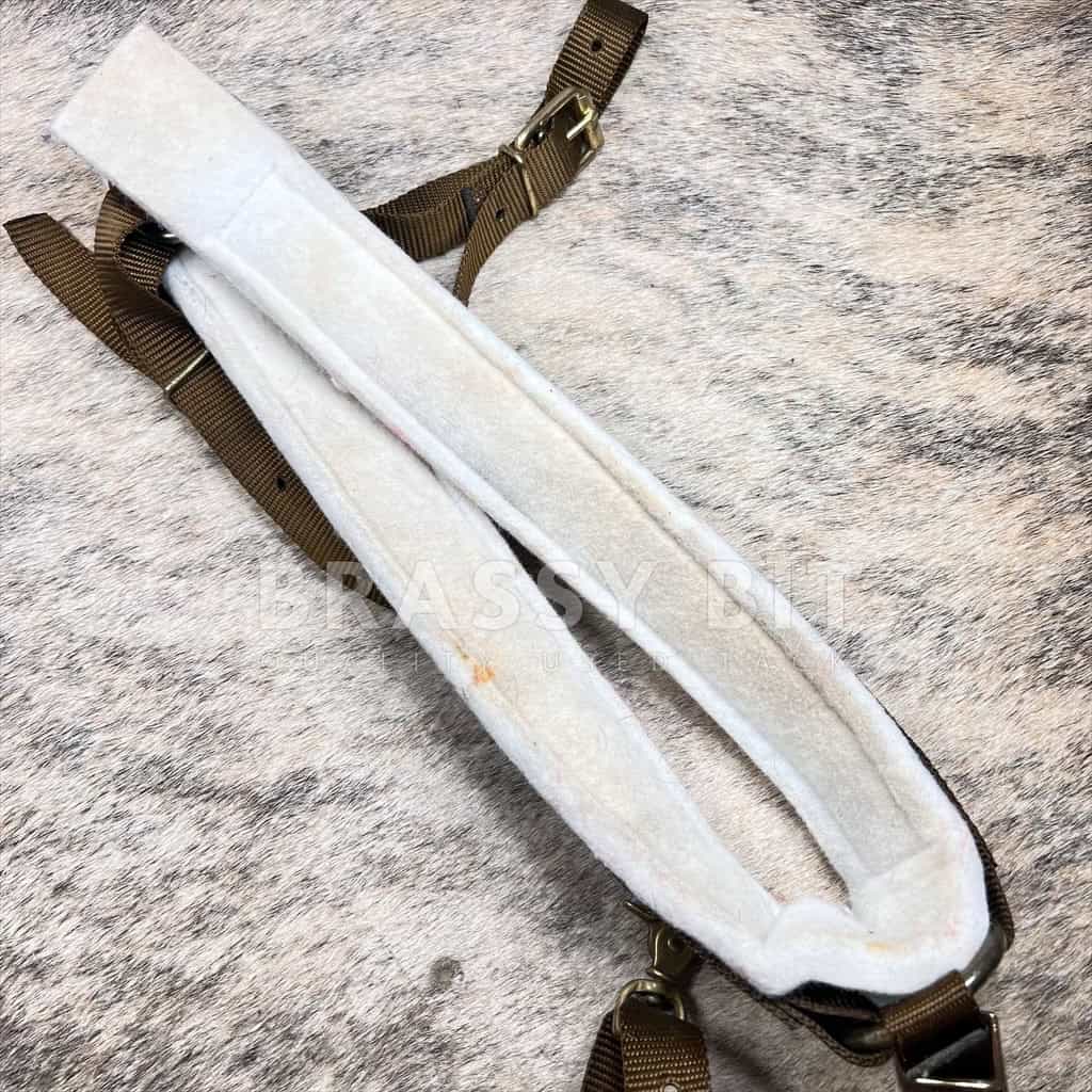 Very lightly used, durable nylon breast collar from Fabtron. Horse size, lots of adjustment and padded with felted wool. White felt with brown nylon top. The brand tag was barely hanging on for dear life, so has been removed. Is from Fabtron, but no longer has its brand tag. Tugs are nylon as well. In very lightly used condition.