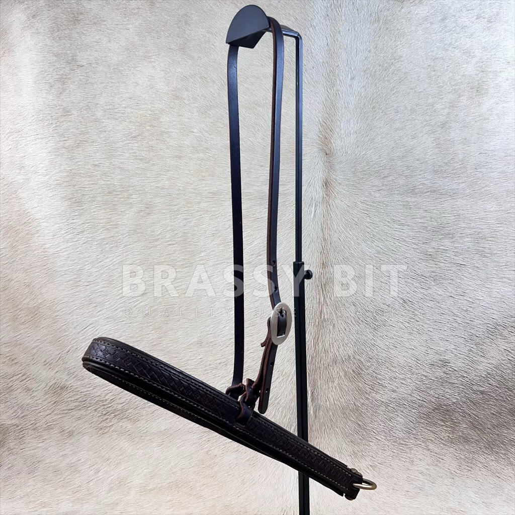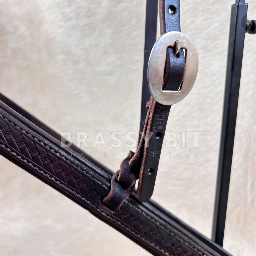 Here is a nice, heavy duty leather tie down noseband. With a wider nose that has a leather padded back and is basketweave stamped. Has a brand new hander added to it. All dark oil, nice leather and quite soft. The hanger is new–replaced by us. The noseband is in very good used condition. Sharp piece of using tack at a great price!