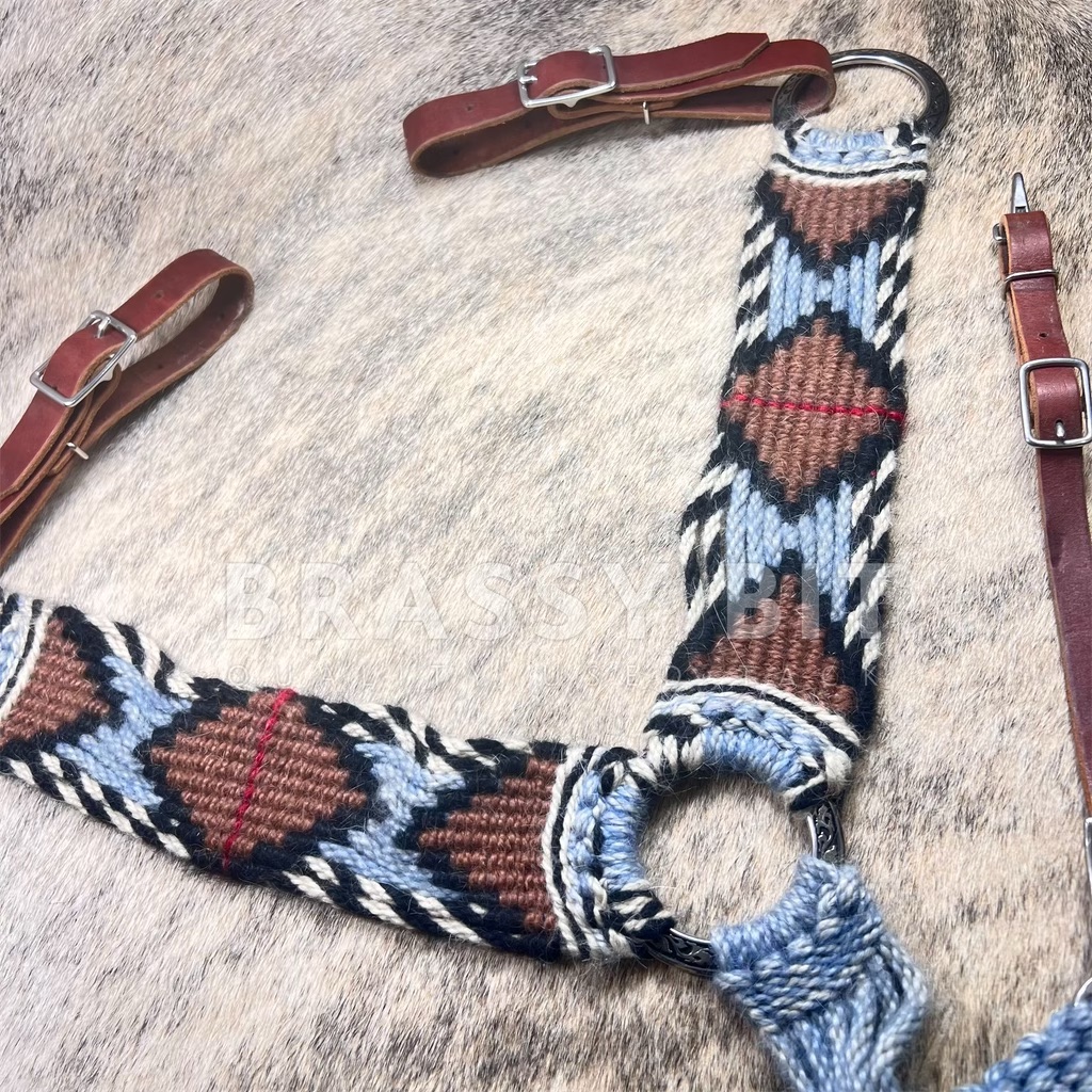 This custom mohair breast collar is stunning! From Twisted Mare, who has become the standard in mohair tack. Creating not only stunning pieces of tack, but also durable tack. In brown, tan, black, and light blue with a great pattern. Horse size, great adjustability, topped off with Jeremiah Watt hardware. Leather is bridle leather that is quite heavy duty. This great collar is hardly used, showing just a bit of hair on the back side. So well made and so darn pretty…and offered way less than retail!