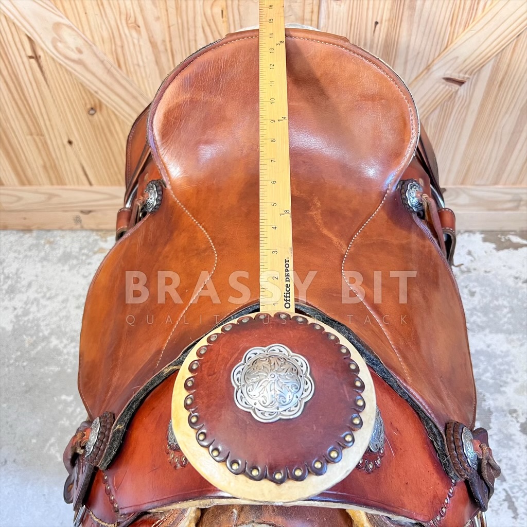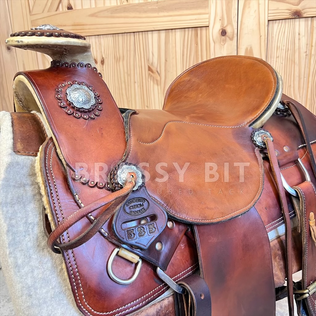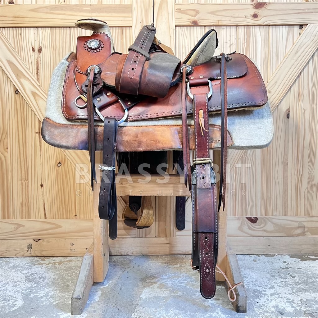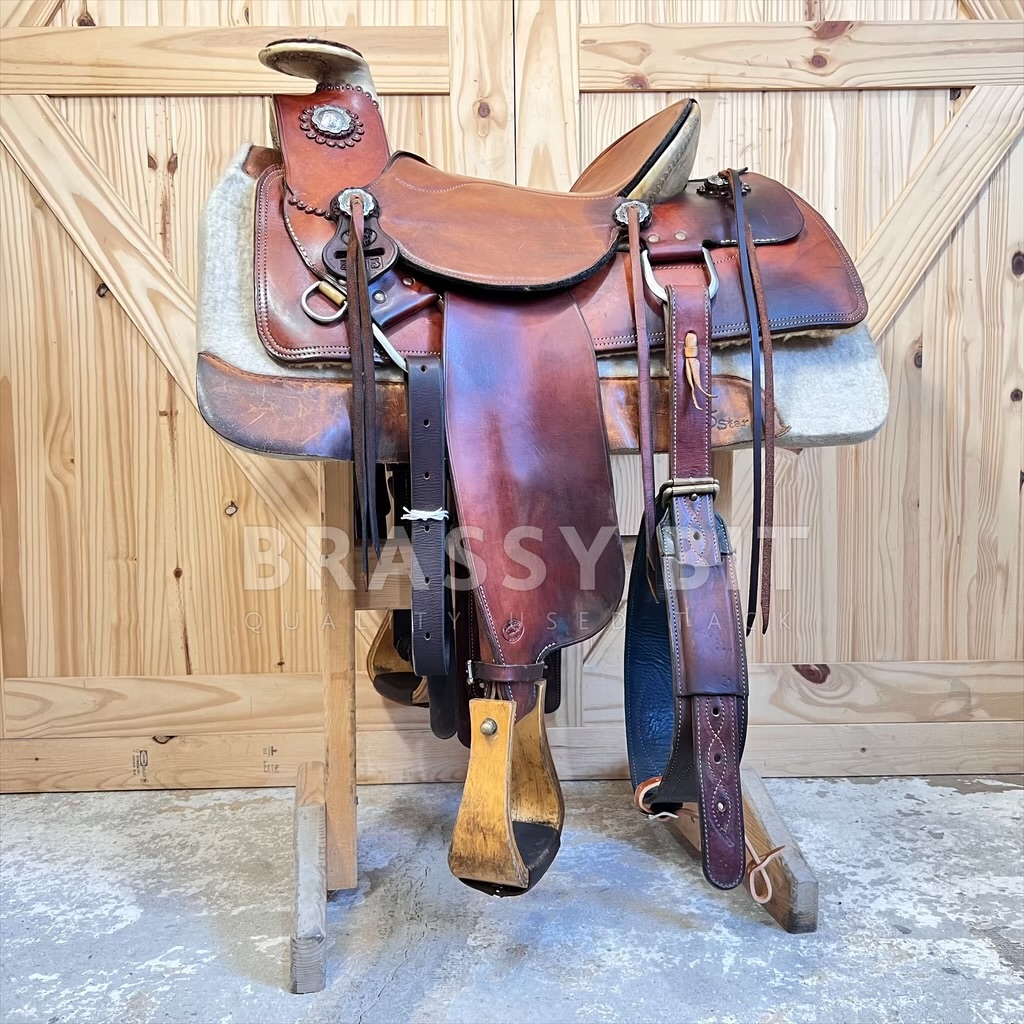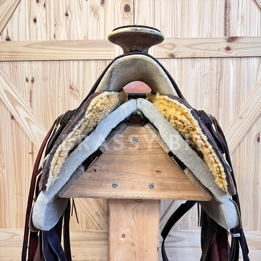 Cliff built this saddle over 20 years ago and when it came back to him when the rider retired, he chuckled to himself, saying “gosh, that is a weird looking saddle”. This rider brought Cliff a Charro Saddle (Mexican style) tree and wanted it built to be as light weight as possible, without sacrificing durability or the ability to work, and be comfortable for miles and miles of ride time. This rider was a VERY serious endurance rider and needed a very specific saddle. This is that saddle! It’s a bit of a cross between a Santa Fe and Charro style, but made as light as possible. Built on a 15″ tree, but with the padding, this saddle fits and measures true to 14.5″. On Full QH Bars, measuring 7″ with great flare, shorter bar length at the front of tree and moderate rock. This would be a great option for a wide build Morgan, Arab, or QH with a rocked top line. The seat is really cool on this one, as it’s a slick seat but the leather is lined with felted wool to offer padding without bulk. Angled front rigged, plenty of rings and strings for packs, and offers some nice concho accents. We love the look that the exposed tree offers, making this saddle very unique. To help keep the weight down, this saddle has a single skirt, narrower/thinner stirrup leathers to also reduce bulk, and slightly lighter weight leather. But is still the leather quality and durability you’d expect from Wickett & Craig. Comes fully rigged. This saddle is older and has seen a TON of ride time (even finishing Tevis Cup 100 mile race) but has been incredibly well cared for. Leather is butter soft, oiled and cleaned often, and stored well. Does have some darkening in a few spots, mainly the rear skirts form packs. This is definitely a saddle that will stand out without being ‘too’ much. It is getting far harder to find used Langerud Saddles on the market, especially at this price. This one is ready to work, trail ride, or even to complete another Tevis 100.