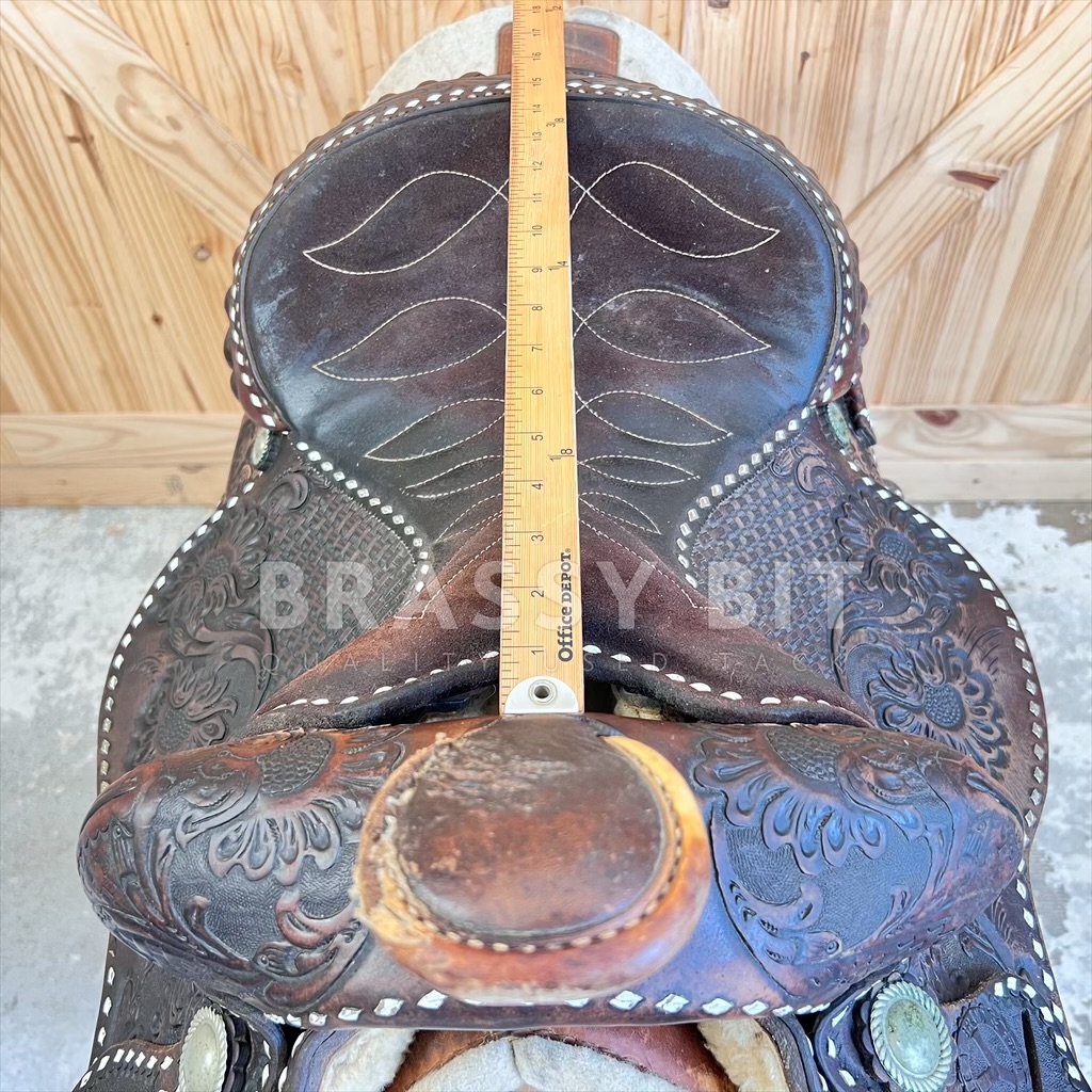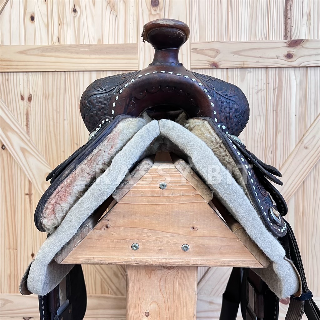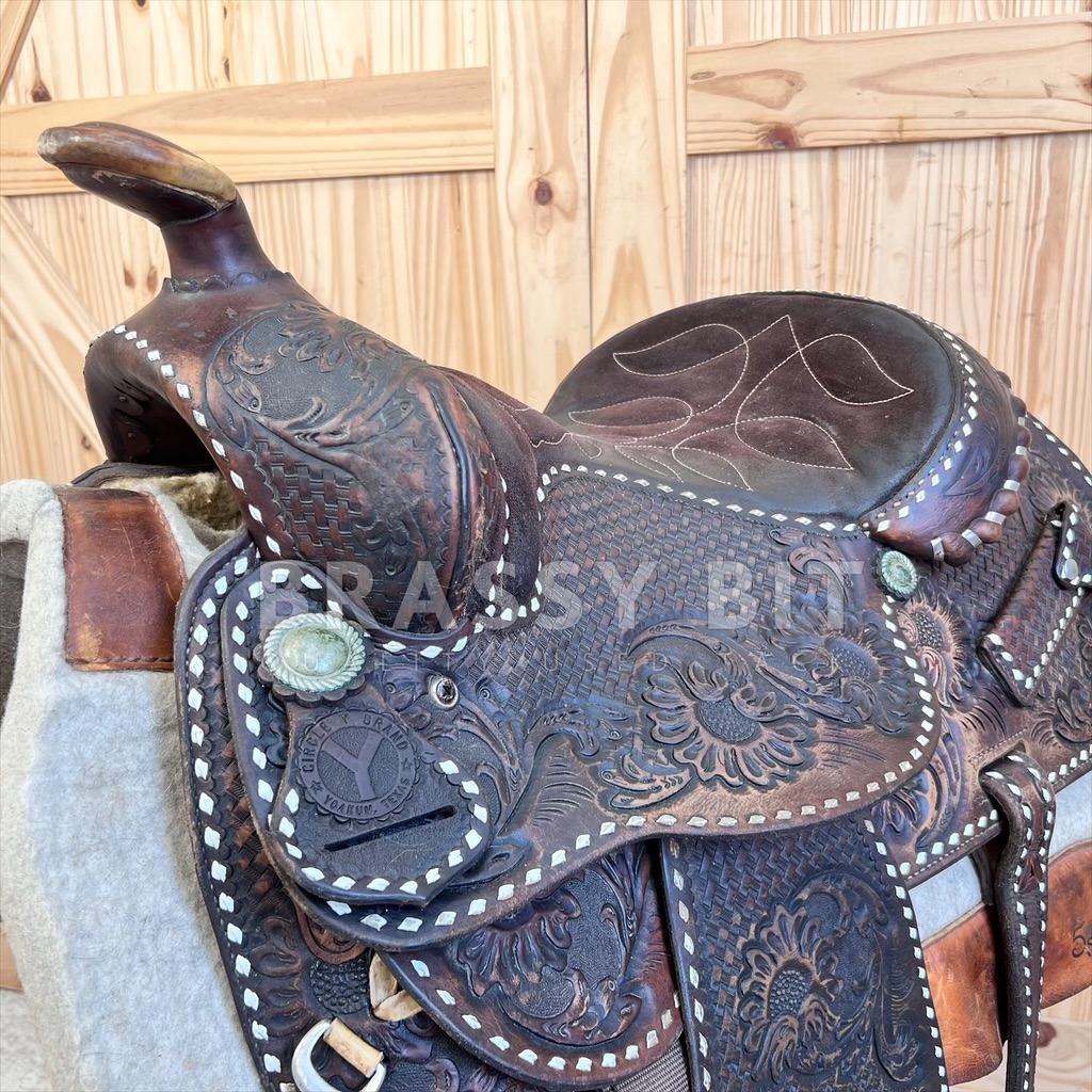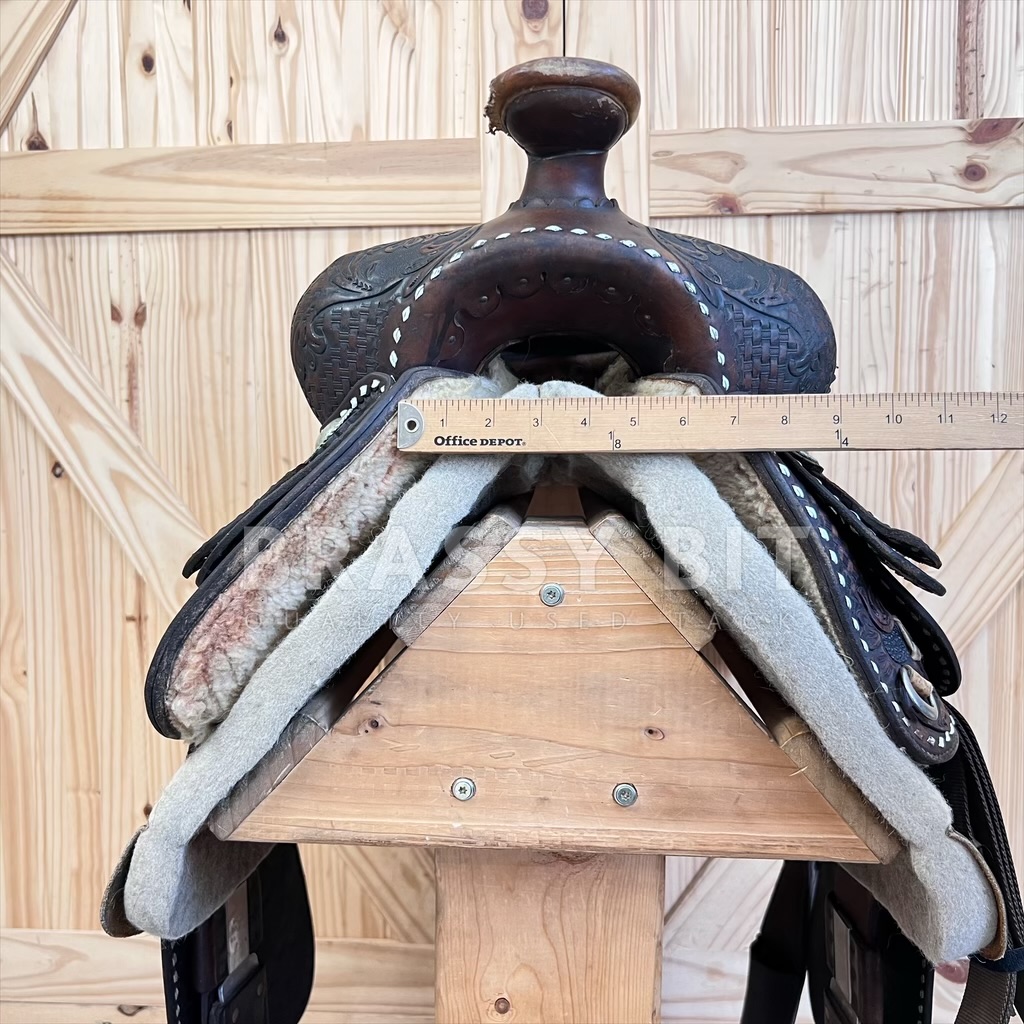 This awesome, older (1975 model) Circle Y is aging like a fine wine! There’s a reason that these saddles are so popular–they are built to last! This one was made when horses weren’t quite as wide as now, built on Semi Bars that measures 6″ with a moderately wider flare, decent wither clearance, and a bit flatter through the bars. This one was built before Circle Y started using metal serial number medallions, so its serial number is stamped way up under the near side fenders. So, we are going off of measurements/style. Measures 15″ to stitching, but with how the seat is shaped, fits true to 14.5″ . This one is made very much in the all around equitation style with a raised twist, deeper seat bed, duck bill style low roper horn, and with almost a reining saddle look. In our favorite dark oiled color, and is fully tooled basketweave stamping with lots of the prettiest classic Sheridan floral tooling. We love the stainless lacing details on the cantle and skirt too. Finally, this stunning older saddle is fully edged in white buck stitching. Talk about sharp! This is an older saddle, but has overall been well cared for–but does show some signs of age and use. There’s a bit of color loss in a few places-but we think it gives it a cool, antiqued look. Is a bit dry from storage, and the off side stirrup is ‘wonky’ as it was stored with a broom handle in it for far too long to turn the fenders. However, given its age…and the fact this saddle could apply for an AARP membership…its in incredible condition. A bit of oil/conditioning will do this awesome saddle wonders. This is a lovely, older saddle that has a ton of riding left in it. Heck, it would be a heck of a decor piece, too. At this price, you truly can’t go wrong!