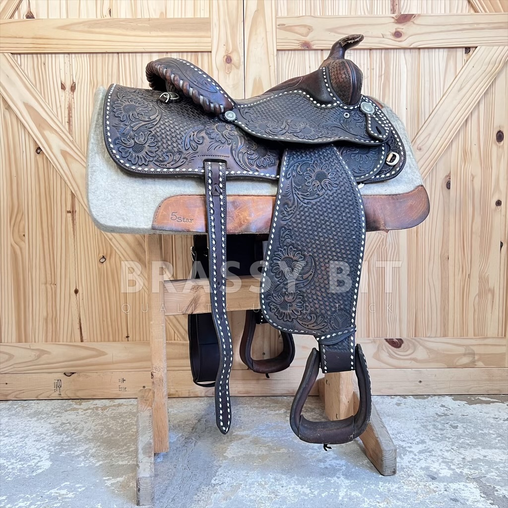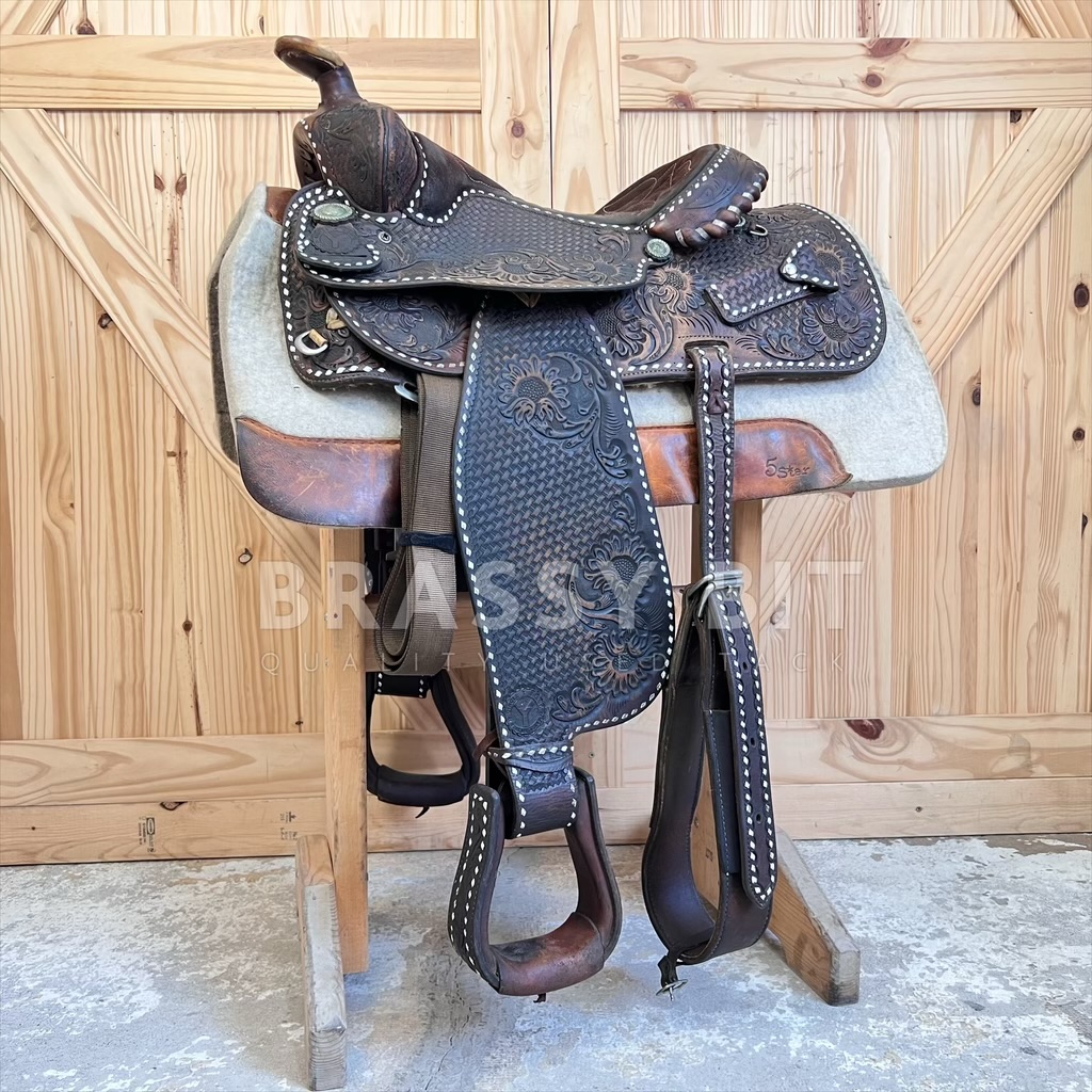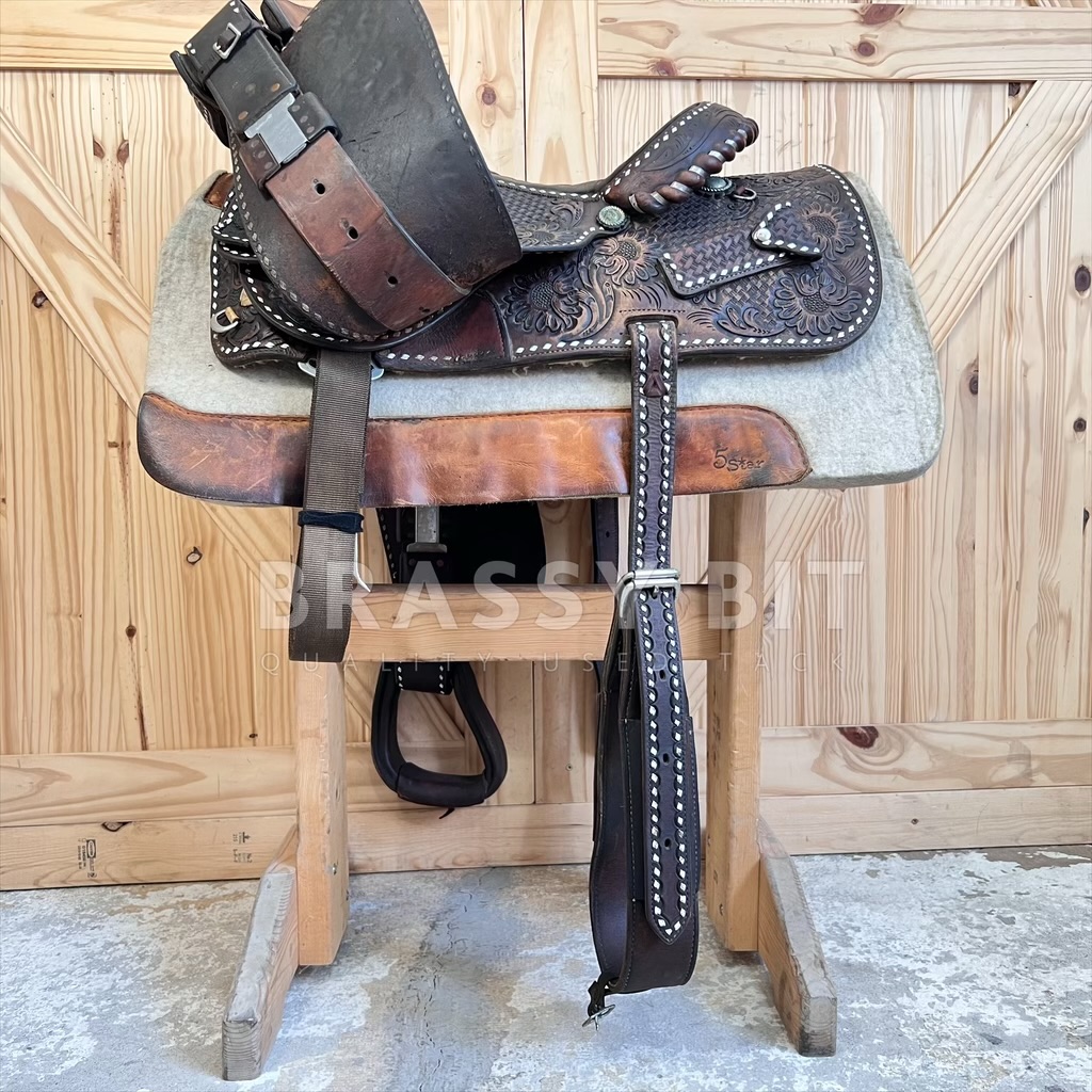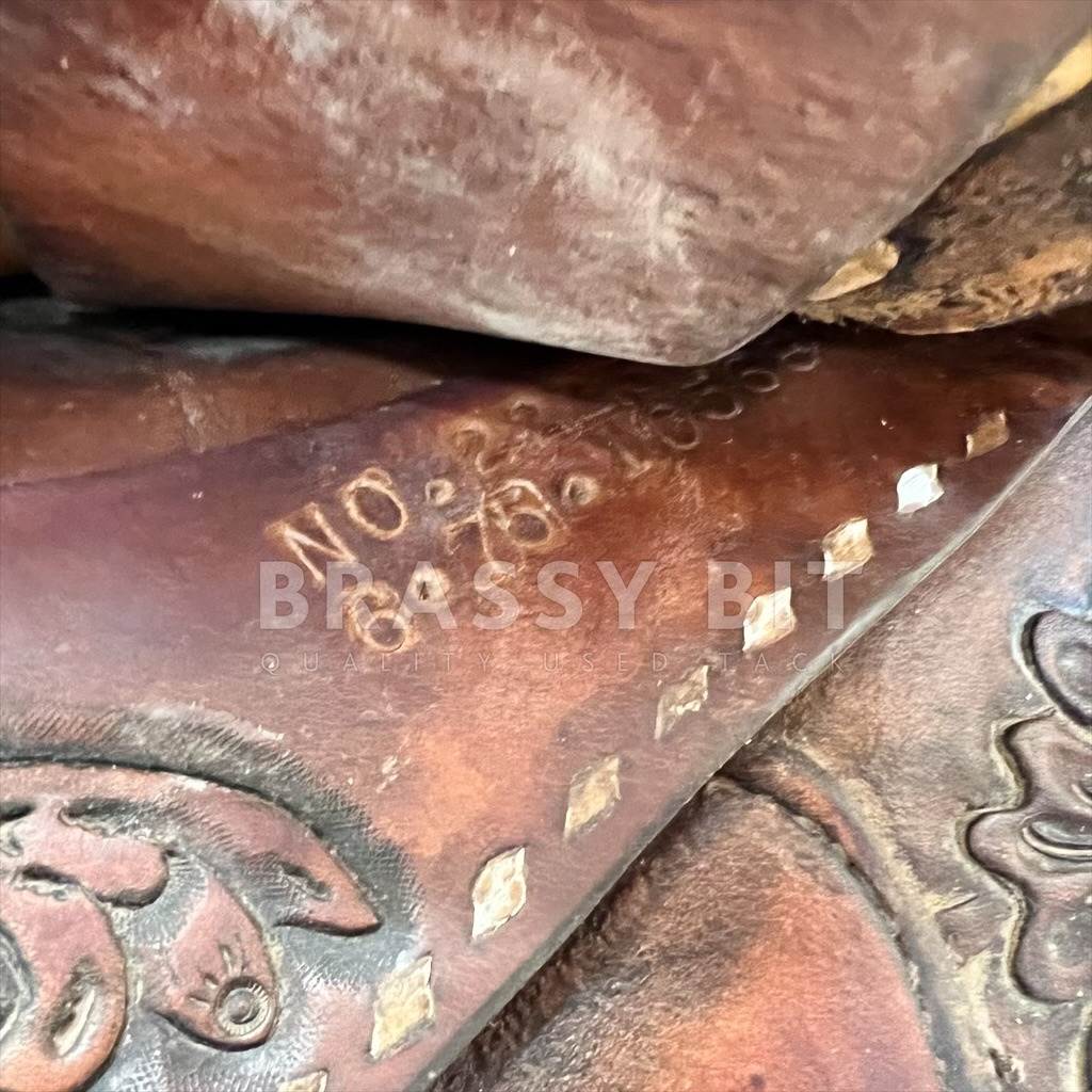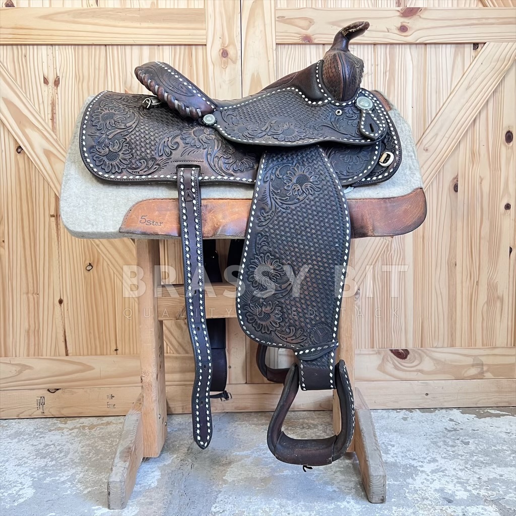 This awesome, older (1975 model) Circle Y is aging like a fine wine! There’s a reason that these saddles are so popular–they are built to last! This one was made when horses weren’t quite as wide as now, built on Semi Bars that measures 6″ with a moderately wider flare, decent wither clearance, and a bit flatter through the bars. This one was built before Circle Y started using metal serial number medallions, so its serial number is stamped way up under the near side fenders. So, we are going off of measurements/style. Measures 15″ to stitching, but with how the seat is shaped, fits true to 14.5″ . This one is made very much in the all around equitation style with a raised twist, deeper seat bed, duck bill style low roper horn, and with almost a reining saddle look. In our favorite dark oiled color, and is fully tooled basketweave stamping with lots of the prettiest classic Sheridan floral tooling. We love the stainless lacing details on the cantle and skirt too. Finally, this stunning older saddle is fully edged in white buck stitching. Talk about sharp! This is an older saddle, but has overall been well cared for–but does show some signs of age and use. There’s a bit of color loss in a few places-but we think it gives it a cool, antiqued look. Is a bit dry from storage, and the off side stirrup is ‘wonky’ as it was stored with a broom handle in it for far too long to turn the fenders. However, given its age…and the fact this saddle could apply for an AARP membership…its in incredible condition. A bit of oil/conditioning will do this awesome saddle wonders. This is a lovely, older saddle that has a ton of riding left in it. Heck, it would be a heck of a decor piece, too. At this price, you truly can’t go wrong!