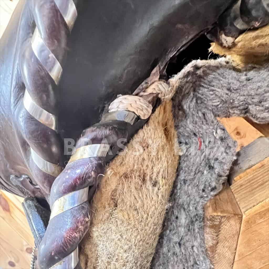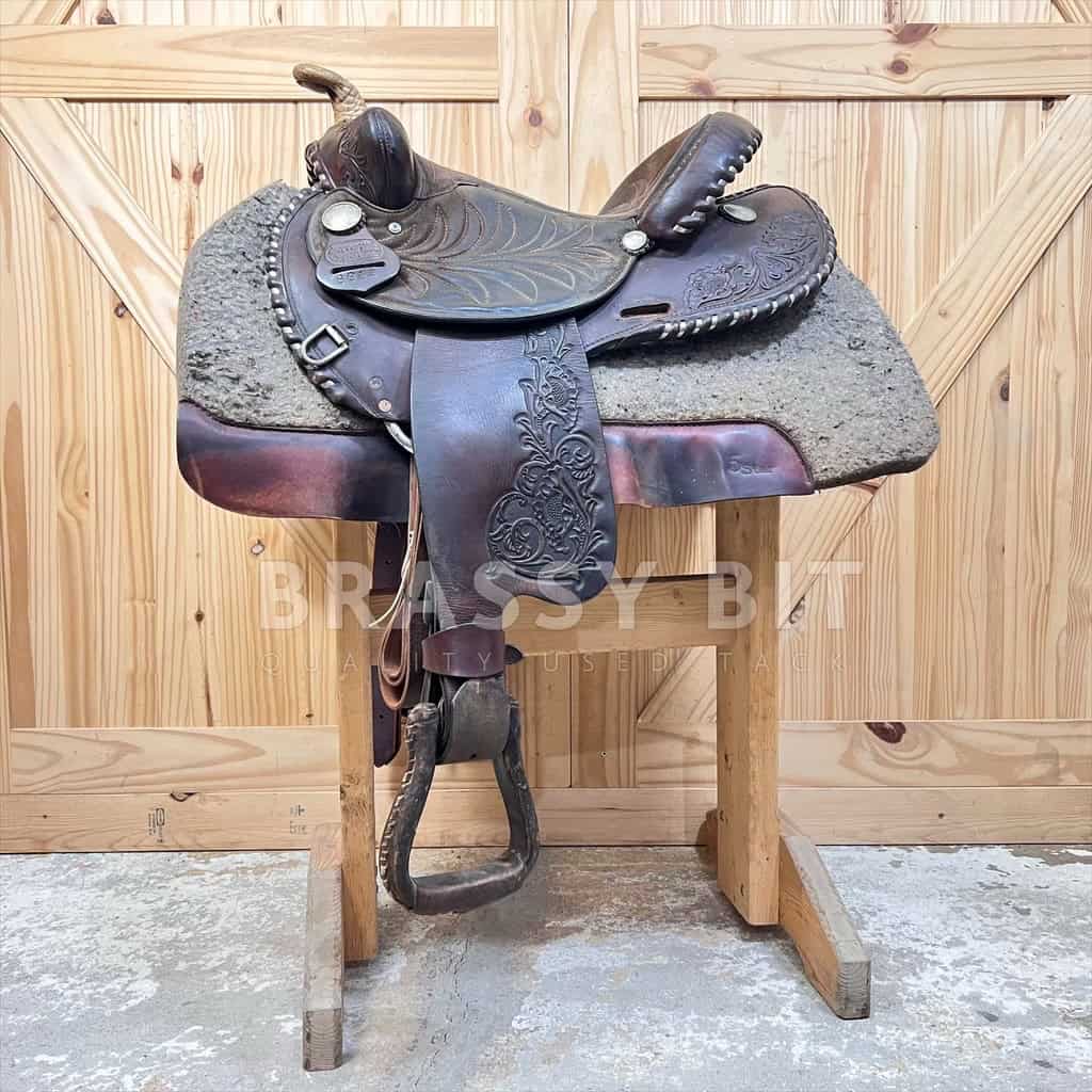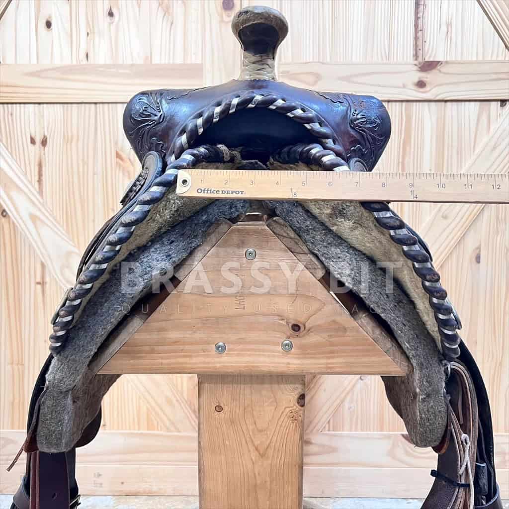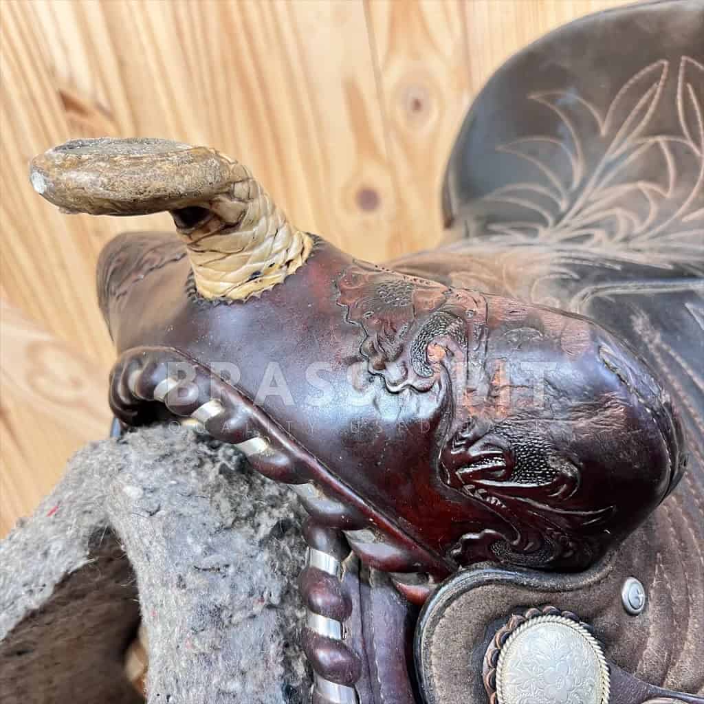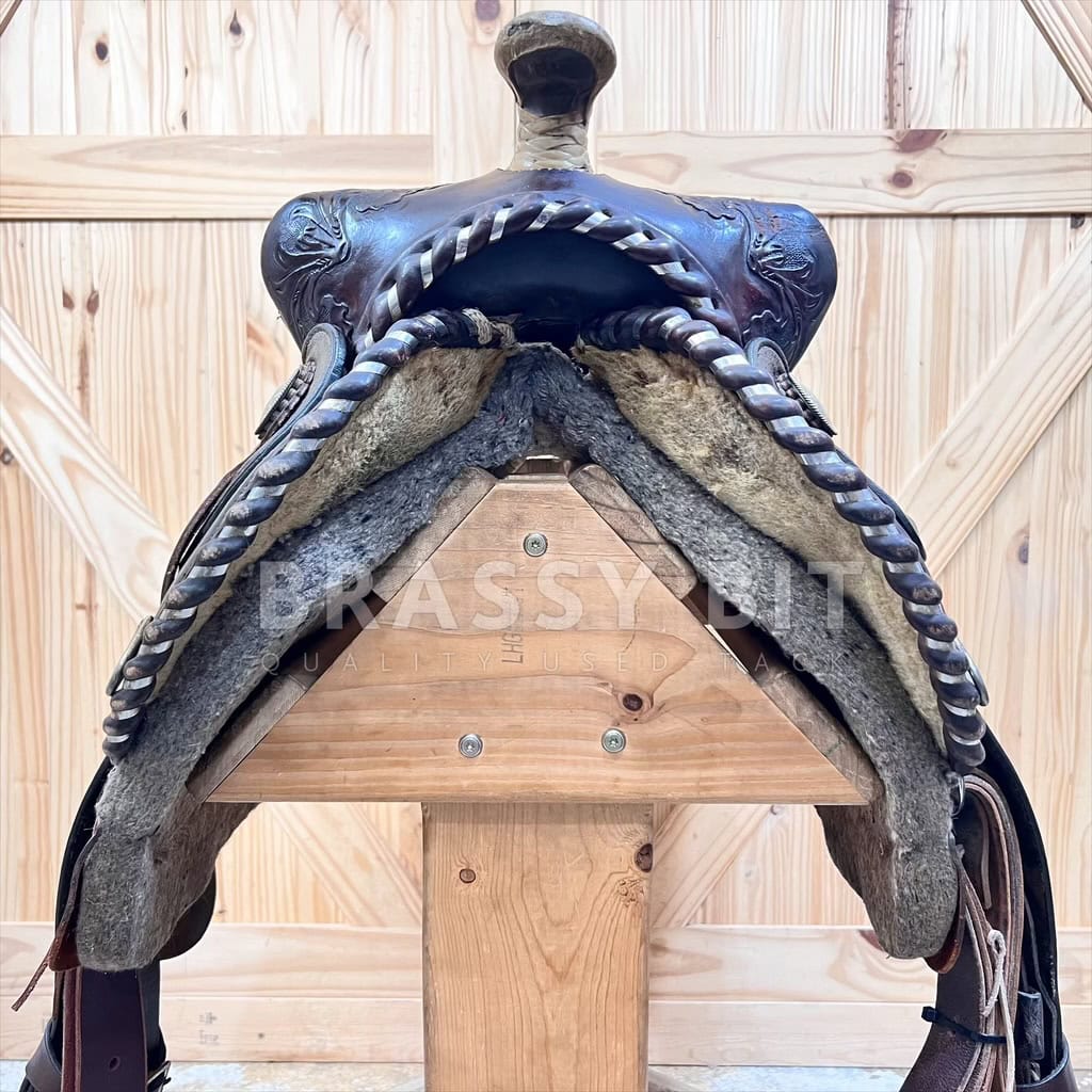 Here is another one of those ‘trusty rusty’ saddles, made when saddles were made right and tight. This is an older 14″ Silver Royal All Around Saddle, one that is ready to be your casual trail partner, or even your daily riding saddle. Given the style this one is from the late 1970’s or 1980’s, with the deep hand tooling and silver lacing around the whole skirt. This one measures 15″ to stitching, but with the higher twist, fitting like at 14″. On Semi Bars with decent wither clearance, a bit flatter, measuring 6″. Very adjustable stirrups, going short enough for a youth rider, but surprisingly long, too. This is the perfect cross between an Equitation and All Around saddle, with sharp detailing like an Eq saddle with the silver lacing along the skirt and cantle, but with the suede seat and jockeys like an older barrel saddle. It is surely comfortable enough to do it all! This saddle has seen a lot of ride time, but has also been very well cared for. The leather is very soft. However, does show some blemishes in the form of a naughty baby horse bit mark on the swell, a bit of wear to the rawhide horn, and some damage to the front skirt where the leather is has rubbed through to the rope interior that makes the lacing. However, is minor and high up under the pommel. For those of you who appreciate the look of older saddles, this one is for you! Silver Royal is an economy saddle brand now, but this one is far from economy. Made when Silver Royal was one of the nicer saddleries. This is definitely a saddle to see, especially at this price!
