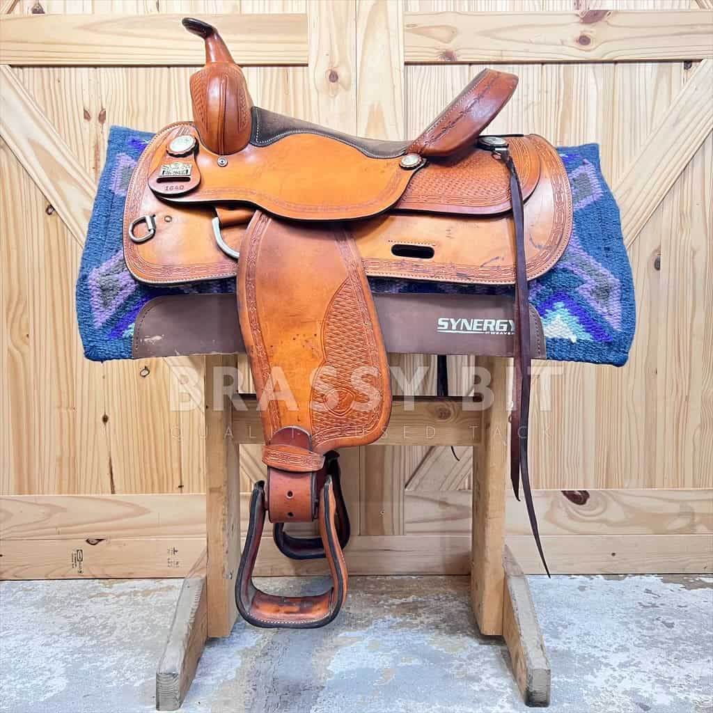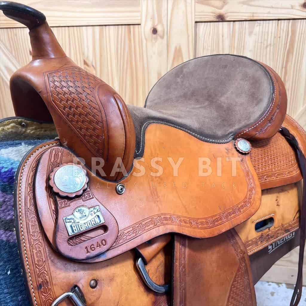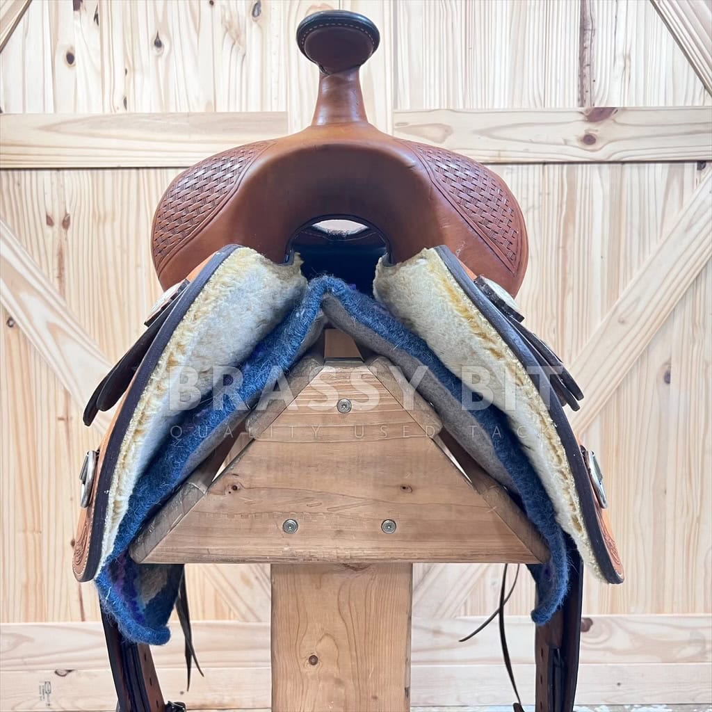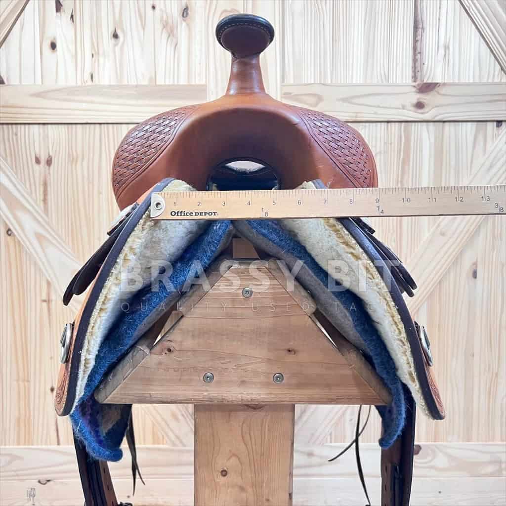 This is such a nice quality saddle, and despite its age, has seen very little ride time. From Big Horn, on their light weight Flex tree offering a bit of flex in movement to accommodate the changes in your horse over the seasons. This flex tree flexes both side to side, but also front to back. Designed to move with your horse. This one is perfect for an athletic built horse, built on QH Bars that measures 6.5” with some flare, moderate wither clearance with wider tree channel, and moderate rock to the bars. This would be great for a gaited horse, Arab, or OTTB. 16” tree that fits just a bit more snug as it has a deeper seat that with nice padding. This one was a pecan oiled leather, but has darkened a bit to an almost chestnut color that is quite attractive. Has just a bit of tooling, with basketweave stamping and barbed wire tooled border. Fenders offer a ton of adjustment, going much longer than many saddles. We love the skirt shape on this one. Often called a butterfly skirt, designed like an equitation skirt to offer a closer contact feel. This saddle has seen very, very little ride time–spending most of its life in storage. Has a few minor spots of discoloration, but we are being far too picking at this point. Leather is just a bit dry in a few spots, but Big Horn uses great leather and it has already softened up like crazy with a bit of attention. This trail saddle is so nice and talk about a great price!