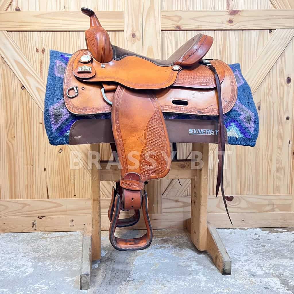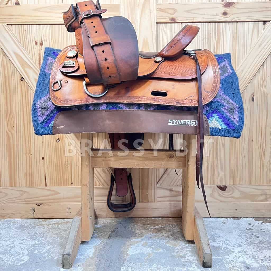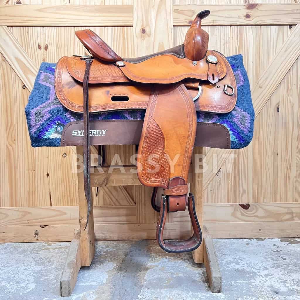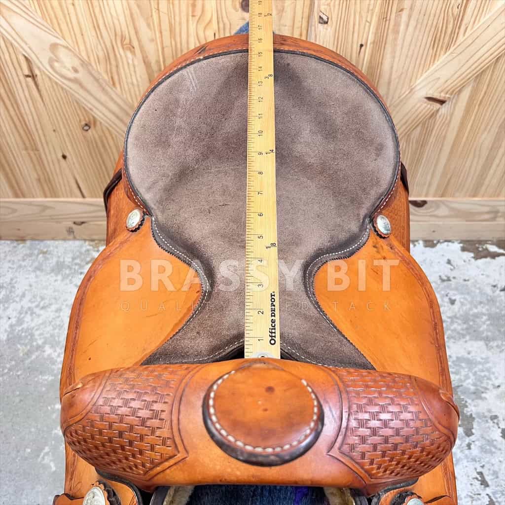 This is such a nice quality saddle, and despite its age, has seen very little ride time. From Big Horn, on their light weight Flex tree offering a bit of flex in movement to accommodate the changes in your horse over the seasons. This flex tree flexes both side to side, but also front to back. Designed to move with your horse. This one is perfect for an athletic built horse, built on QH Bars that measures 6.5” with some flare, moderate wither clearance with wider tree channel, and moderate rock to the bars. This would be great for a gaited horse, Arab, or OTTB. 16” tree that fits just a bit more snug as it has a deeper seat that with nice padding. This one was a pecan oiled leather, but has darkened a bit to an almost chestnut color that is quite attractive. Has just a bit of tooling, with basketweave stamping and barbed wire tooled border. Fenders offer a ton of adjustment, going much longer than many saddles. We love the skirt shape on this one. Often called a butterfly skirt, designed like an equitation skirt to offer a closer contact feel. This saddle has seen very, very little ride time–spending most of its life in storage. Has a few minor spots of discoloration, but we are being far too picking at this point. Leather is just a bit dry in a few spots, but Big Horn uses great leather and it has already softened up like crazy with a bit of attention. This trail saddle is so nice and talk about a great price!