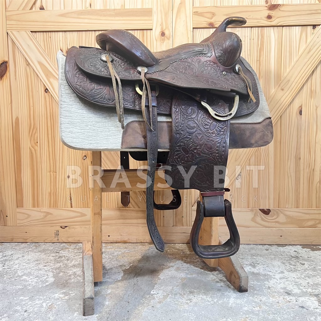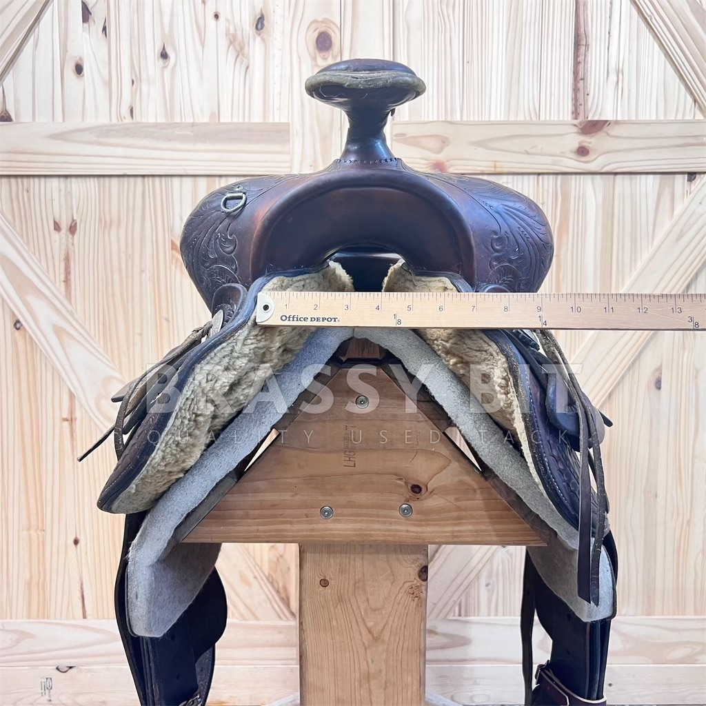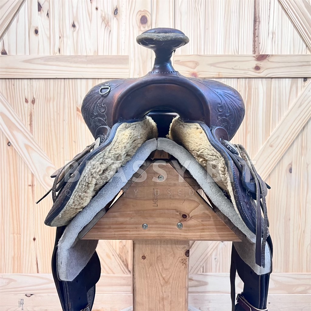 This saddle, despite being old enough for an AARP membership, is one solid saddle! This one was made years (decades) before Circle Y started using serial plates or stamped numbers, but given the style, this one was likely built in the early to mid 1950’s. But don’t let its age fool you, this saddle is in great condition and is as sound as the day it was made. The tree is wider than you’d expect, fitting like QH bars that measure 6.75″, fitting low and wide with a moderate shoulder flare and just a bit of rock to the bars. Offers a true 15.5″ seat with a sloped raised twist and deeper seat bed, with lower/wider cantle almost like an old Bull Dogger saddle. Has a reinforced duck bill style roper horn that measures 3″ x 3.5″, this one will hold a rope just fine. This one has clearly worked for a living, but has been incredibly well cared for. Its clearly been roped off of, showing a bit of rope scars, but the horn is sound. Has a few scuffs, scrapes, and minor/shallow age related cracking on the leather but has been oiled often and has very soft leather. Real wool shearling underside that is still quite fluffy, showing a couple spots that are thinning a bit, but again given its age, its in great condition. Build on a bull hide wrapped wood tree, so this is not a light saddle, weighing in near 40lbs. Has large solid brass Bork EZ rigging plates. This saddle’s last rider ran the fenders under the rigging ring to reduce bulk, but could easily be run back over. Fenders offer far more adjustment than you’d expect, going short enough for a 5′ rider. This is a really nice older saddle, one that is ready for decades more work..and would be a heck of a colt starter. At this price, you can’t go wrong!