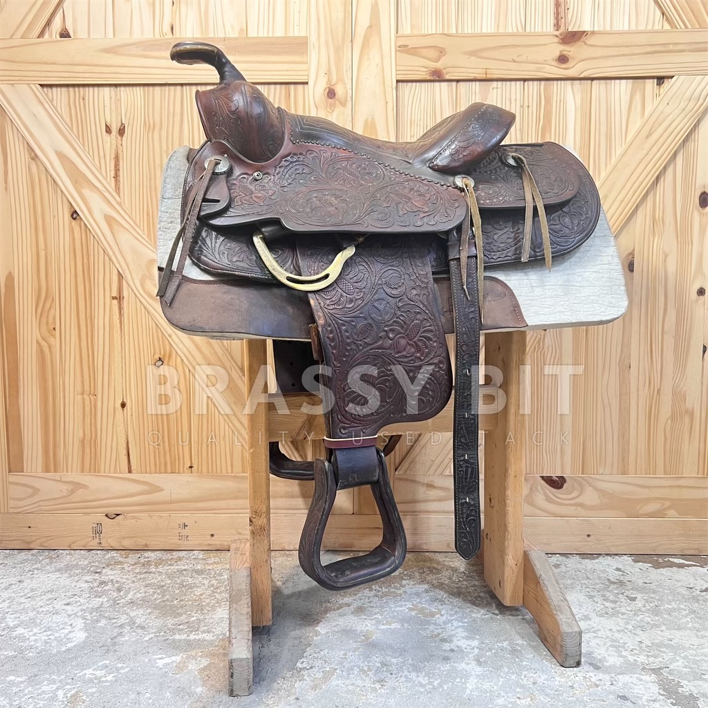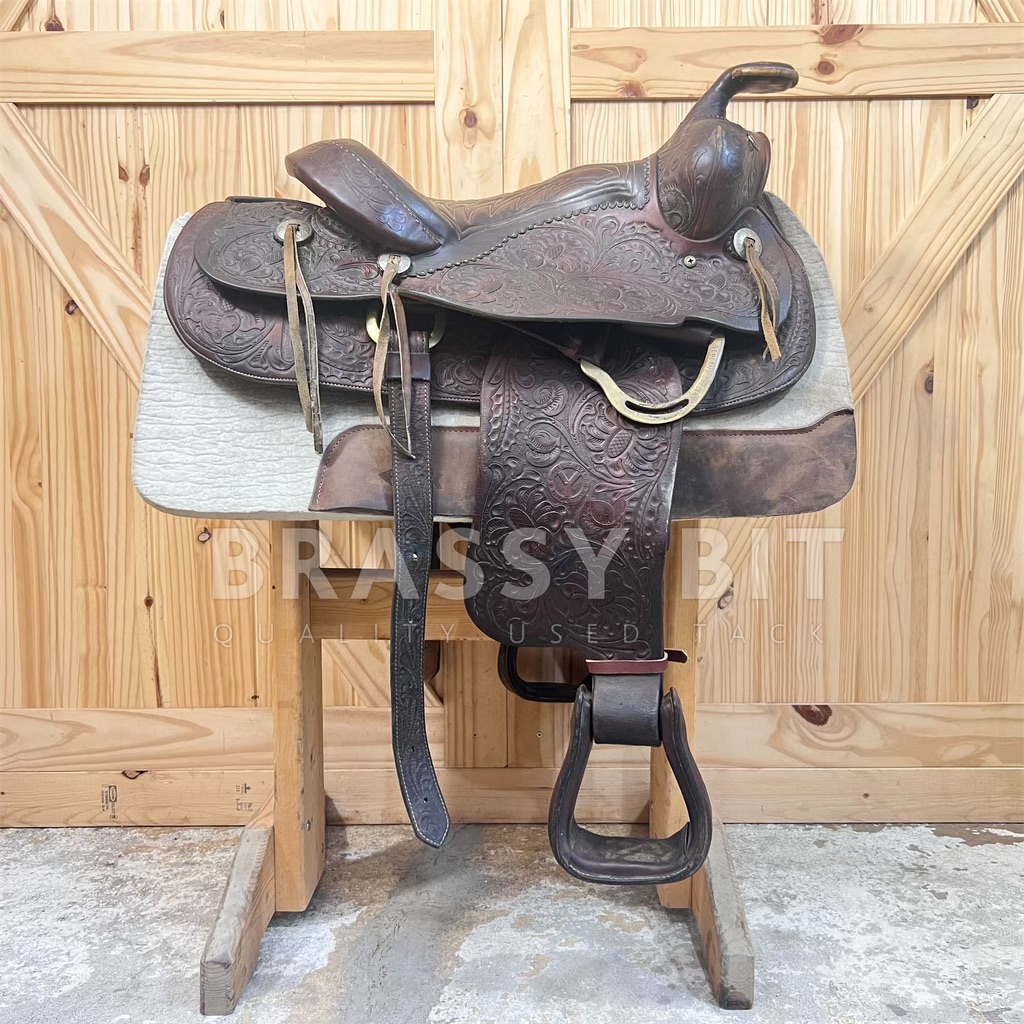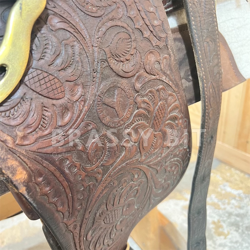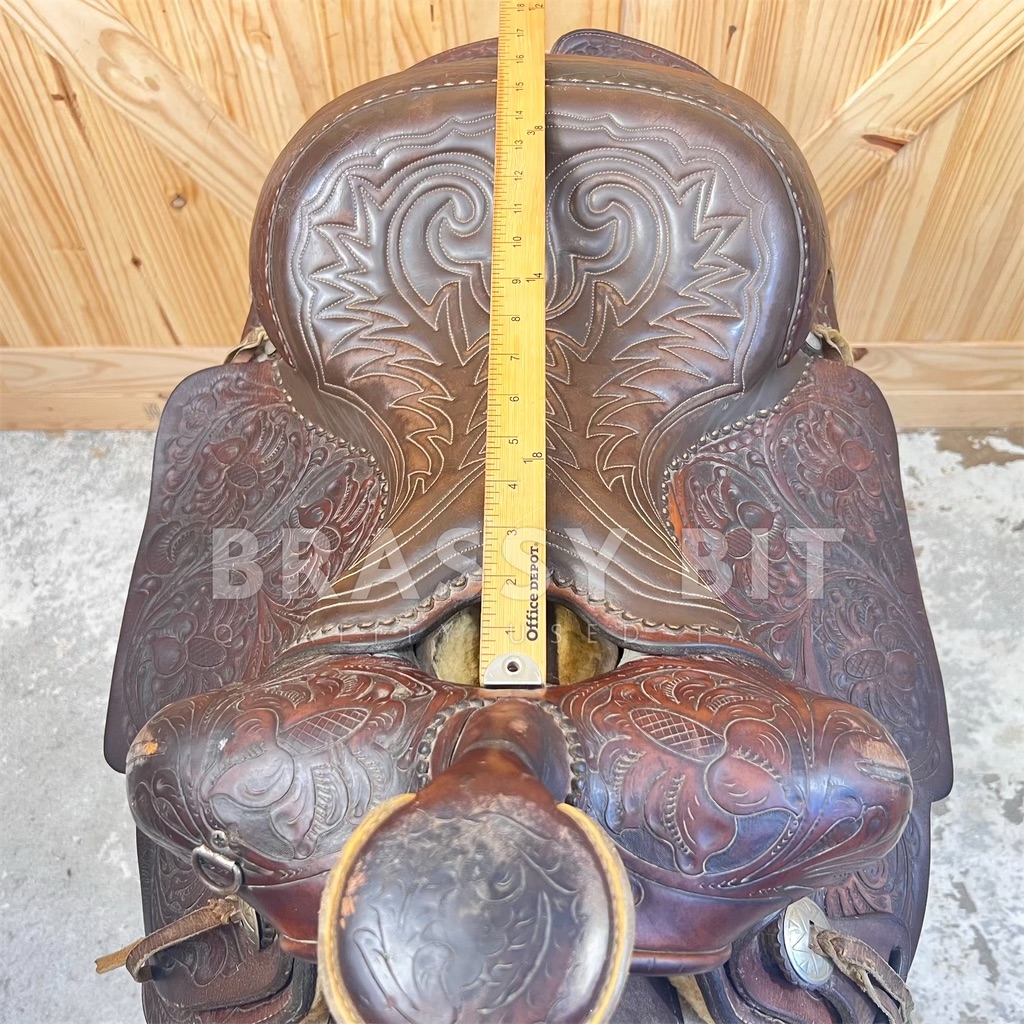 This saddle, despite being old enough for an AARP membership, is one solid saddle! This one was made years (decades) before Circle Y started using serial plates or stamped numbers, but given the style, this one was likely built in the early to mid 1950’s. But don’t let its age fool you, this saddle is in great condition and is as sound as the day it was made. The tree is wider than you’d expect, fitting like QH bars that measure 6.75″, fitting low and wide with a moderate shoulder flare and just a bit of rock to the bars. Offers a true 15.5″ seat with a sloped raised twist and deeper seat bed, with lower/wider cantle almost like an old Bull Dogger saddle. Has a reinforced duck bill style roper horn that measures 3″ x 3.5″, this one will hold a rope just fine. This one has clearly worked for a living, but has been incredibly well cared for. Its clearly been roped off of, showing a bit of rope scars, but the horn is sound. Has a few scuffs, scrapes, and minor/shallow age related cracking on the leather but has been oiled often and has very soft leather. Real wool shearling underside that is still quite fluffy, showing a couple spots that are thinning a bit, but again given its age, its in great condition. Build on a bull hide wrapped wood tree, so this is not a light saddle, weighing in near 40lbs. Has large solid brass Bork EZ rigging plates. This saddle’s last rider ran the fenders under the rigging ring to reduce bulk, but could easily be run back over. Fenders offer far more adjustment than you’d expect, going short enough for a 5′ rider. This is a really nice older saddle, one that is ready for decades more work..and would be a heck of a colt starter. At this price, you can’t go wrong!