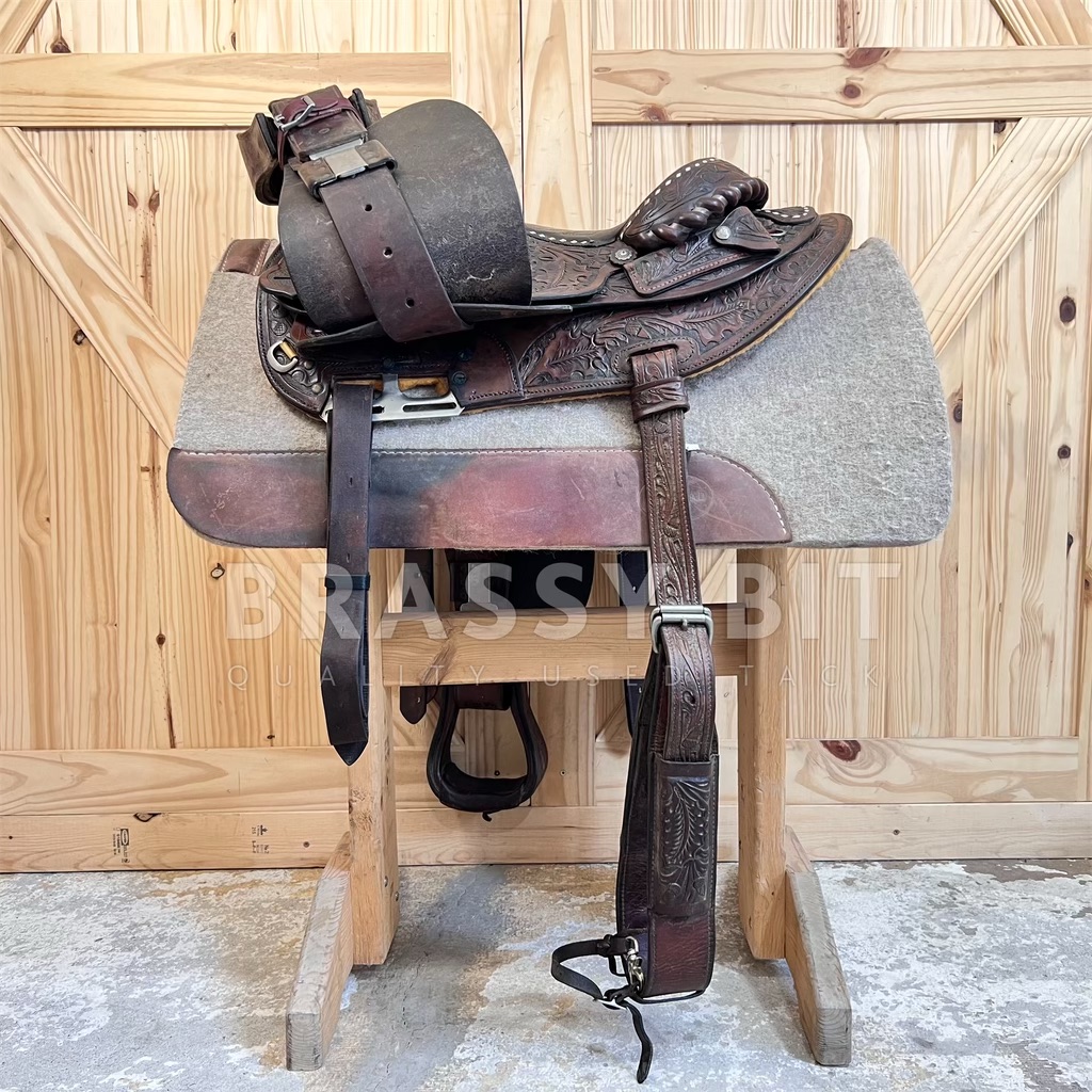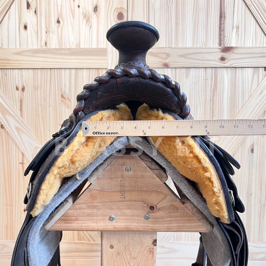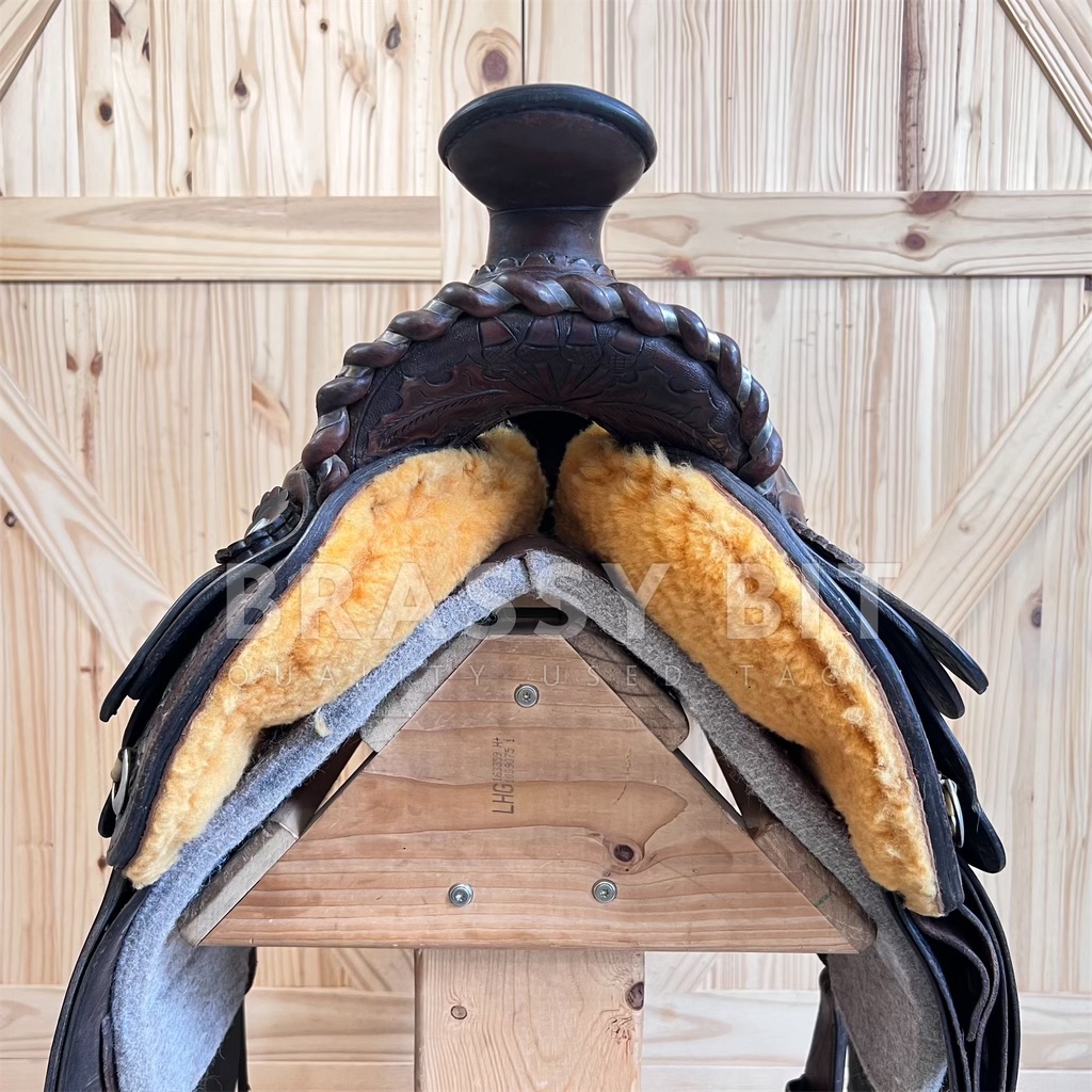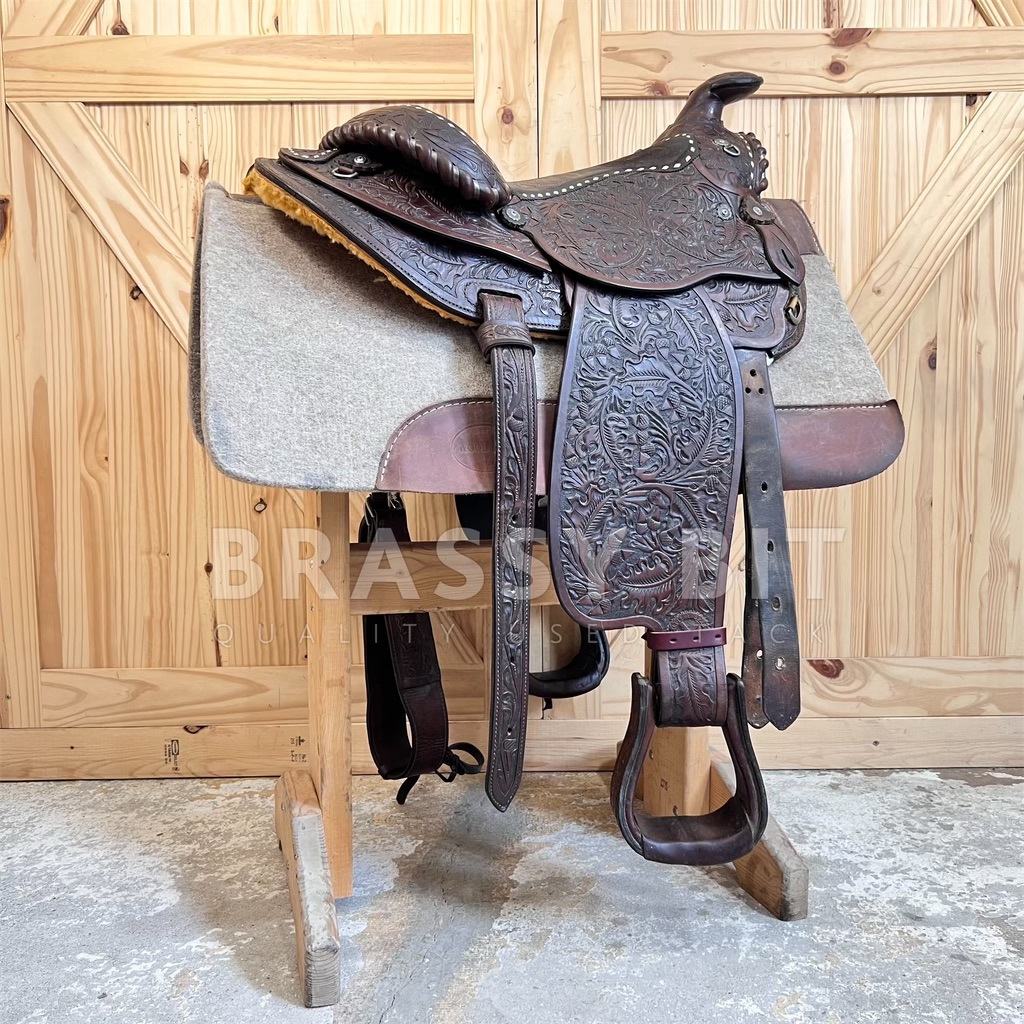 Holy cow is this saddle amazing and is proof that quality tack lasts. If this saddle was a person, it would be shopping retirement properties in Arizona. This one is years prior to when Circle Y has serial plates or stamped numbers, but out guess given the style, this one was built in the early to mid 1950’s. But don’t let its age fool you, this saddle is in incredible condition. This one is a true all around Ranch type saddle with an A-Fork swell, built on a heavy duty wood tree-its built to work but boy its it pretty! Wider than you’d expect, fitting like QH bars that measure 6.5″, fitting low and wide with a wider shoulder flare and just a bit of rock to the bars. Offers a true 15″ seat with a sloped raised twist and deeper seat bed, with lower cantle almost like an old Bull Dogger saddle. Has a reinforced duck bill style roper horn that measures 3″ x 3.5″, this one will hold a rope just fine. Despite being a work saddle, its clear this one never really worked for a living. Never been roped off of, has been professionally refleeced with real wool and we’ve gone over this one with a fine tooth comb. Its in INCREDIBLE condition. Has butter soft leather that is fully tooled in a classic oak leave and acorn pattern, classy buck stitching along the pommel and seat, and it comes with its original and matching rear rigging. Frankly, this awesome vintage saddle shows less use and wear that most saddles a fraction of its age. Shows a couple scrapes and scratches, but we are being far too critical of this saddle. We’ve pulled this great saddle apart to its tree–this one is sound as heck and ready for another 70 years.