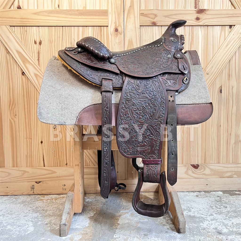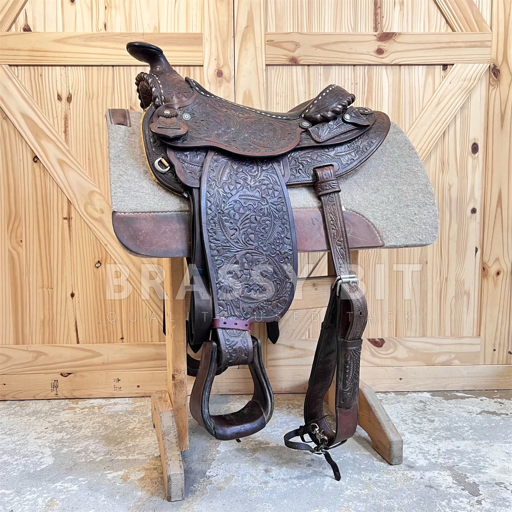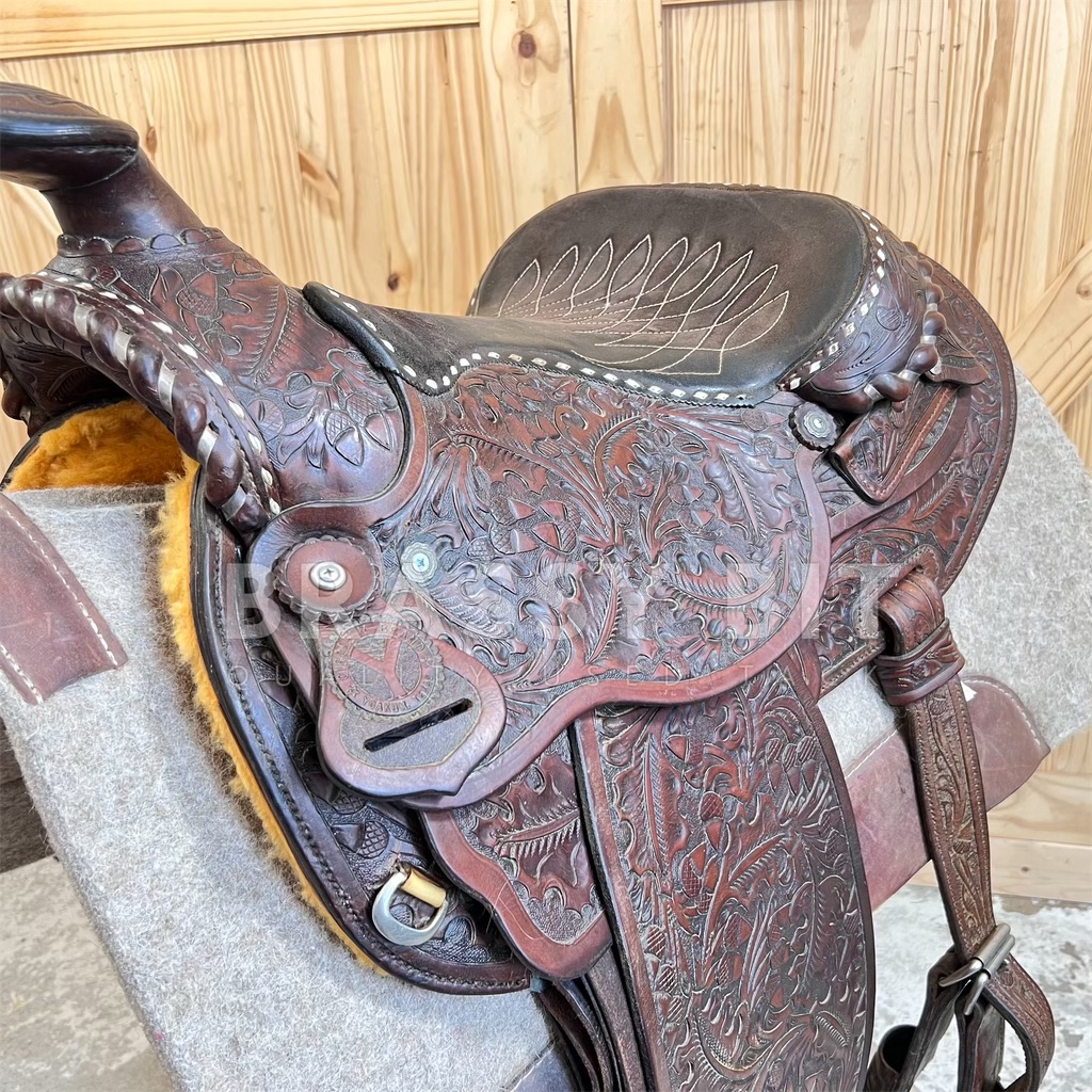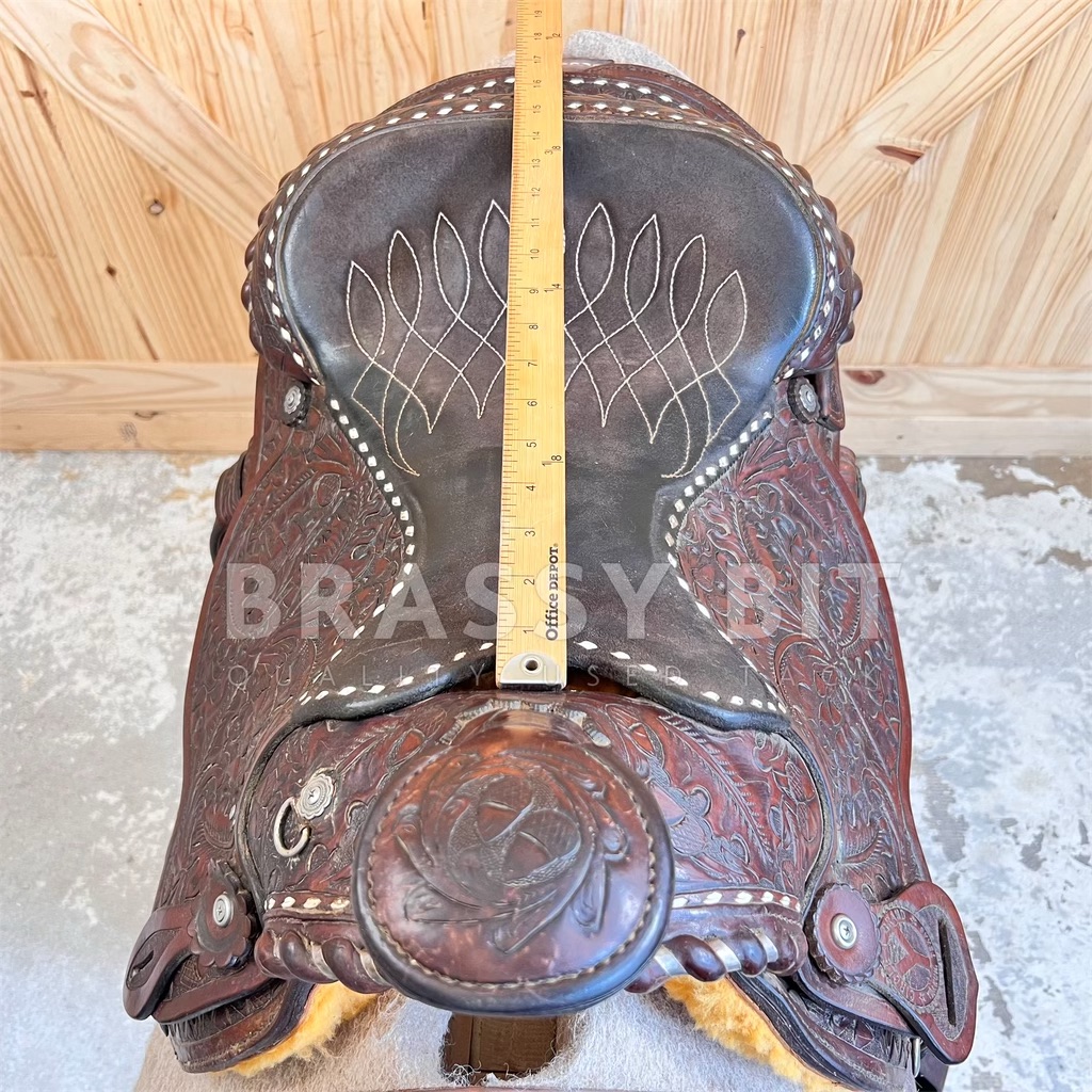 Holy cow is this saddle amazing and is proof that quality tack lasts. If this saddle was a person, it would be shopping retirement properties in Arizona. This one is years prior to when Circle Y has serial plates or stamped numbers, but out guess given the style, this one was built in the early to mid 1950’s. But don’t let its age fool you, this saddle is in incredible condition. This one is a true all around Ranch type saddle with an A-Fork swell, built on a heavy duty wood tree-its built to work but boy its it pretty! Wider than you’d expect, fitting like QH bars that measure 6.5″, fitting low and wide with a wider shoulder flare and just a bit of rock to the bars. Offers a true 15″ seat with a sloped raised twist and deeper seat bed, with lower cantle almost like an old Bull Dogger saddle. Has a reinforced duck bill style roper horn that measures 3″ x 3.5″, this one will hold a rope just fine. Despite being a work saddle, its clear this one never really worked for a living. Never been roped off of, has been professionally refleeced with real wool and we’ve gone over this one with a fine tooth comb. Its in INCREDIBLE condition. Has butter soft leather that is fully tooled in a classic oak leave and acorn pattern, classy buck stitching along the pommel and seat, and it comes with its original and matching rear rigging. Frankly, this awesome vintage saddle shows less use and wear that most saddles a fraction of its age. Shows a couple scrapes and scratches, but we are being far too critical of this saddle. We’ve pulled this great saddle apart to its tree–this one is sound as heck and ready for another 70 years.