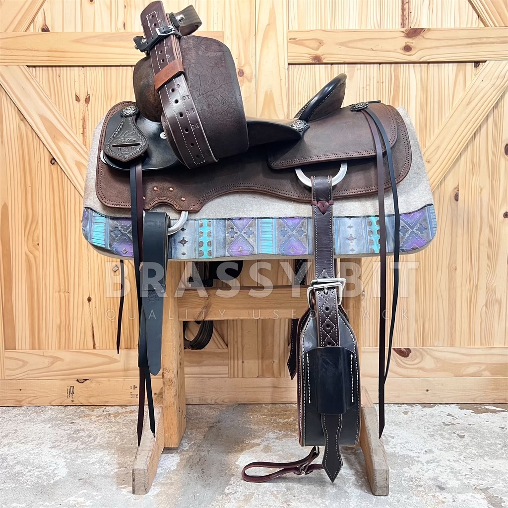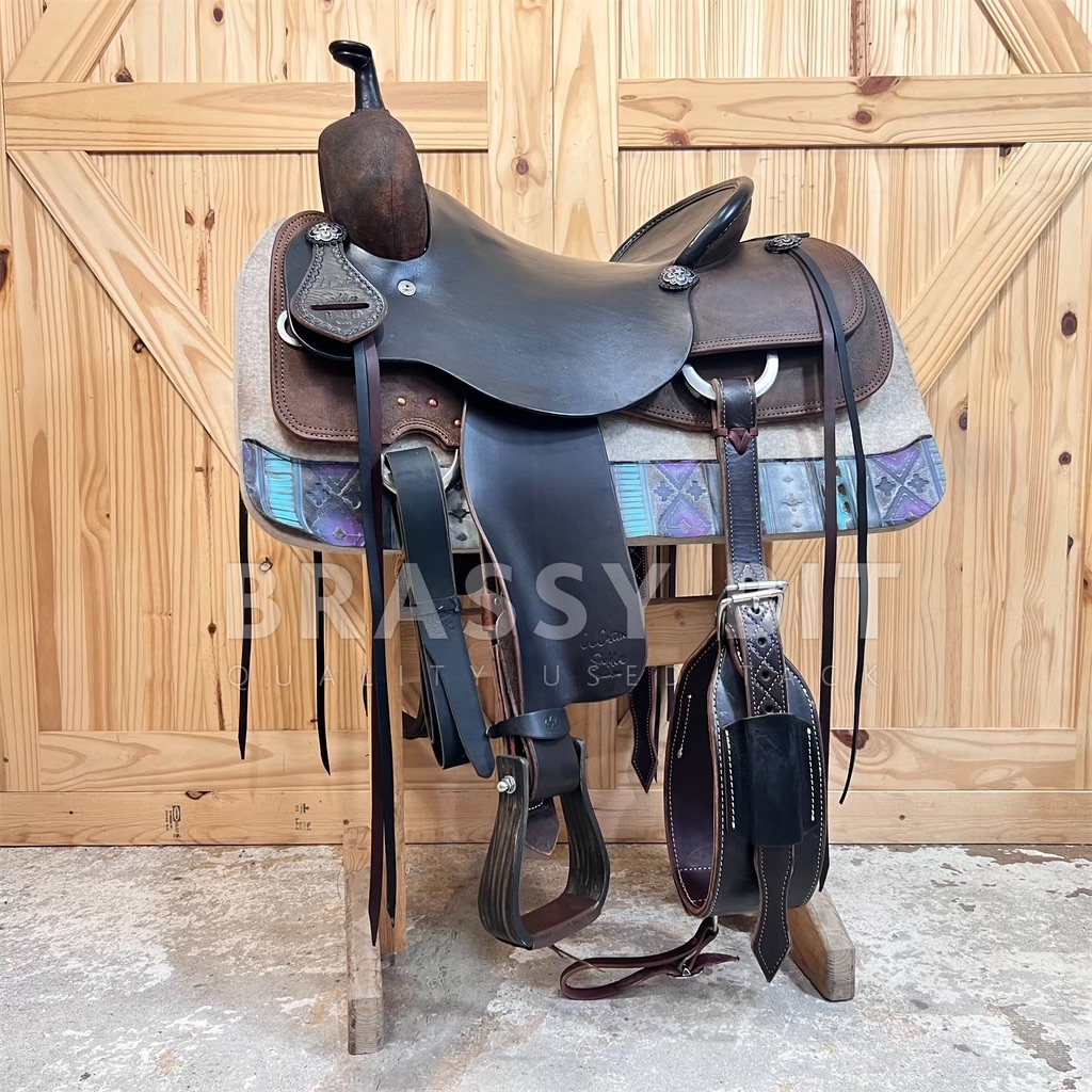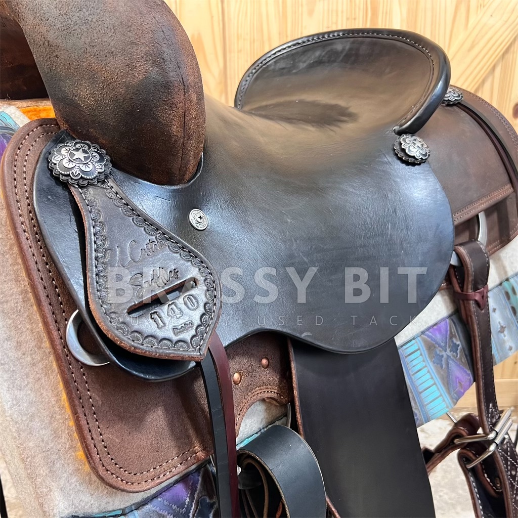 We just can’t handle how much we love, LOVE this saddle. Talk about pretty and handy! CL Custom, which is Brassy Bit Tack’s saddle building brand, from right here in Minnesota. Proudly made with the best materials. Built on a Hadlock and Fox Will James Ranch Cutting tree, on QH Bars that measures 7” x 7” with a wide flare and moderate rock through the bars. The tree angle is not only wide, it flares outward to open up the shoulders. Perfect for a more modern built reiner type QH who has a shorter back and well defined topline. With the balance, this will also work for a horse that is a bit downhill. The tree is 16” bare, fits just a hair smaller with a raised twist, narrower seat bed to keep you secure and comfortable. This is a true All-rounder, perfect for the ranch classes, daily work, reining/working cow, trail, and even speed events. Whoever says brown and black can’t go together—just show them this saddle! This two tone beauty offers black smooth leather over the seat and jockeys, carried through the pencil roll and horn, with dark brown smooth leather fenders, and dark roughed out leather over the swells, skirts, and behind the cantle. We leaned into the two-tone theme hard on this one, with black latigos, black stained custom made oak stirrups, dark leather off billets, black wide roper back cinch with dark brown accents, AND black and dark brown saddle string. Finally, this one is finished off with a limited edition Jeremiah Watt floral star concho. Key details sets this one aside from there rest. Double stitched, reinforced in all the right places, heavy duty stainless hardware, and real shearling underside. Of course, this one comes fully fitted. This one will look darn nice any arena and will hold up to daily work. Take a peek at this one, you won’t be disappointed.