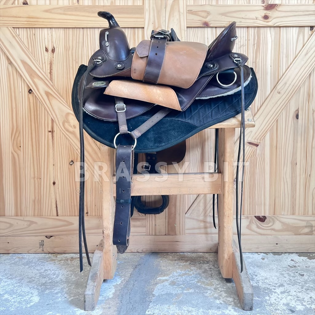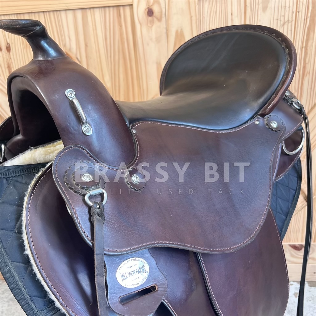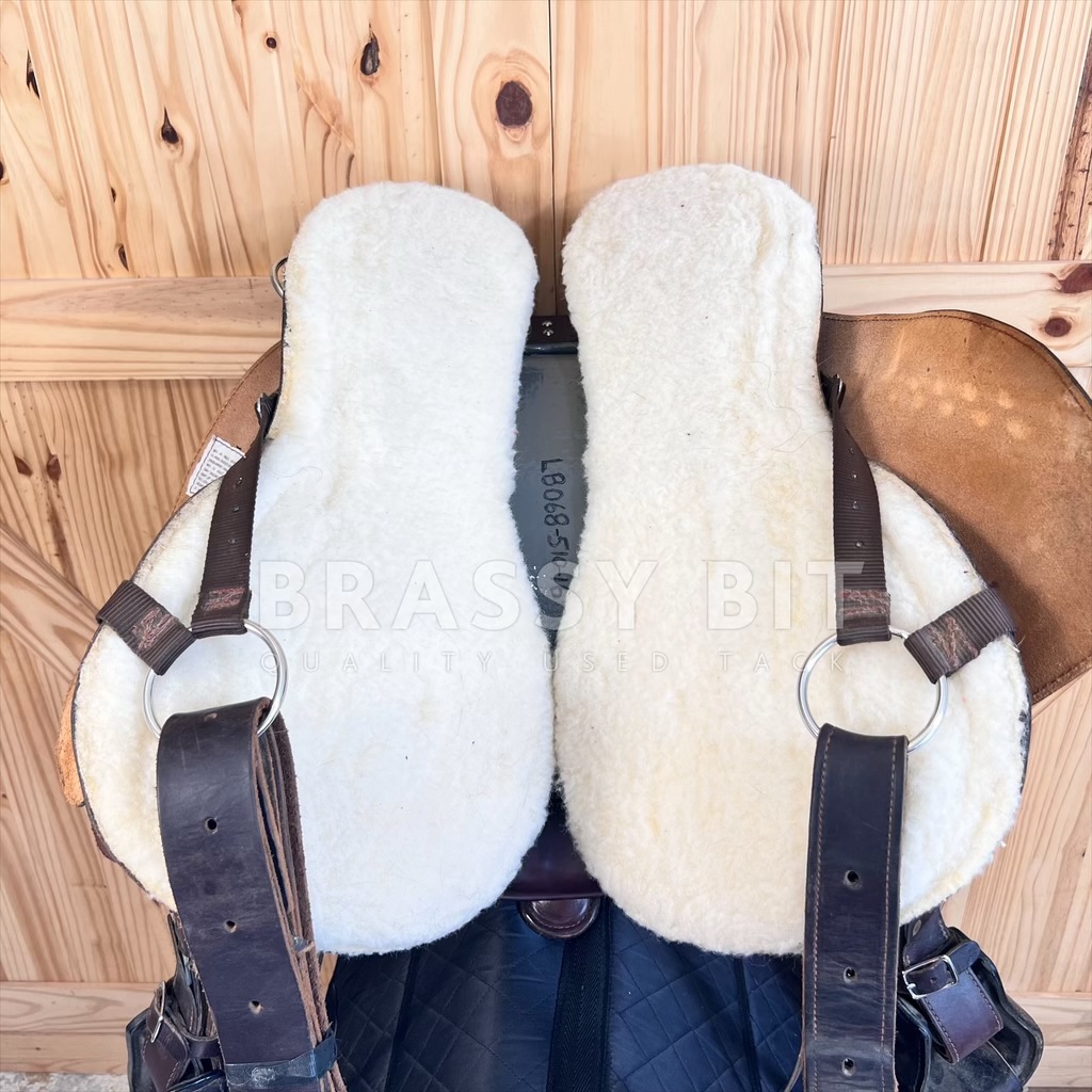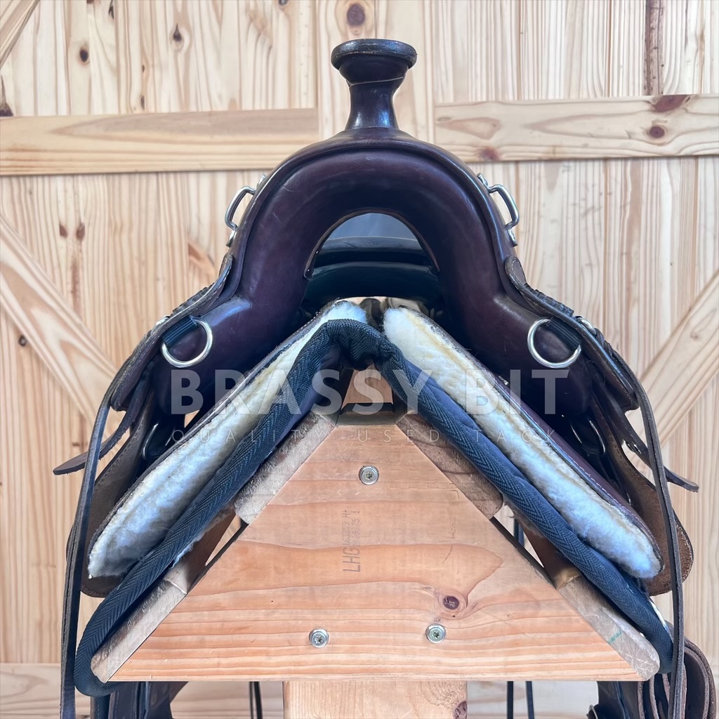 We just love having these saddles in! Flex Panel saddles have a near cult following, and seeing this saddle, it is no wonder why! Made by Hill View Farms, the is one of their most popular models, the Liberty Trail. Hill View Evolutionary Saddles took the design from Ortho Flex and improved it, offering active adjustment with each step your horse takes. Sadly, Hill View has since sold, so these incredibly popular saddles are getting hard to get ahold of! Flex panel saddles are designed with panels that are fixed to a solid tree (wood in this case) by a serious of flexing bearings that move with each step of your horse. They offer far more support than a treeless saddle while supporting saddle fit. This one is the ‘standard’ option, meaning it will work for a narrower horse up to a moderately wide horse. Would not consider this an option for a very hefty horse, think draft, but would be a great option for a draft cross! This awesome saddle offers a great padded seat, low profile swells, and butter soft leather. 16″ seat, however with the great padding, fits a bit closer to 15.5″. Has super adjustable fenders, going surprisingly short and are free swinging. 4″ cantle, wider and deeper seat. Shorter skirt length at just 25″. Panels and bearings are in pristine condition. We love the rigging on this one as its adjustable and self balancing, dropping to a center fire style. This one has fleece lined panels, so no need for booties/socks. Has always been used with a pad. This saddle has been incredibly well cared for and very lightly ridden in. Shows very minimal signs of use, has been babied and is butter soft. Only shows a couple small scuffs here and there. This awesome flex panel saddle is one of the best priced ones on the market right now. Grab it while you can!