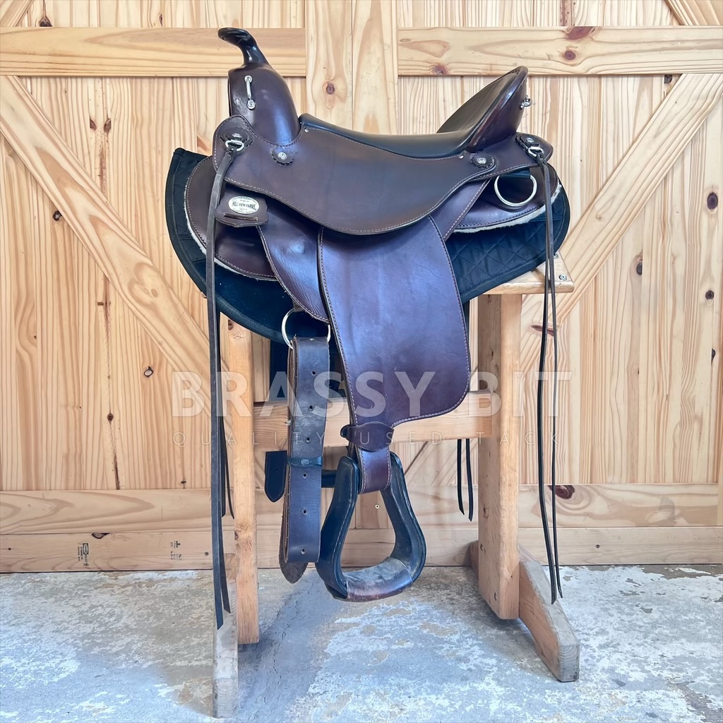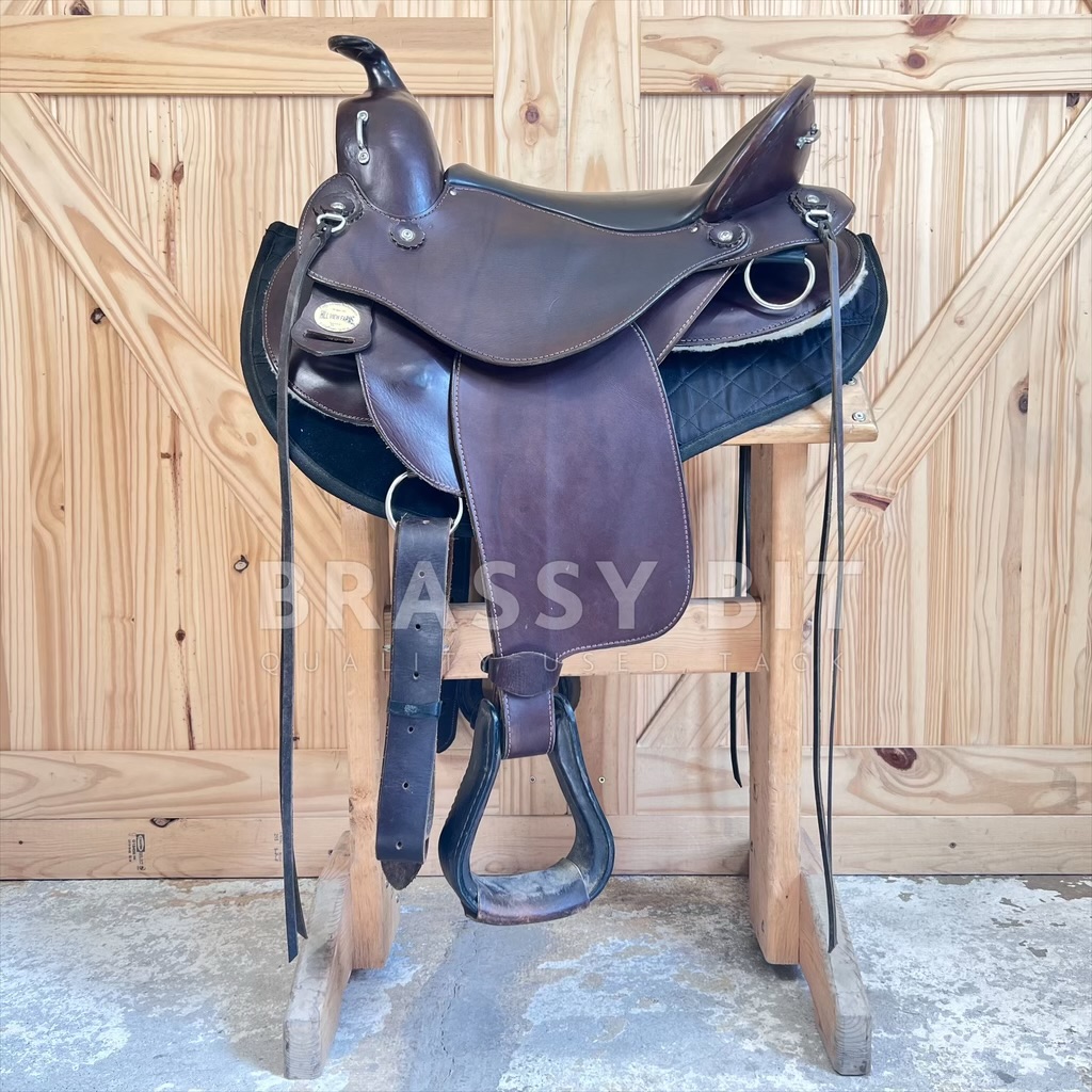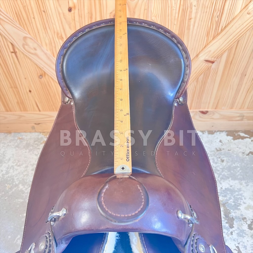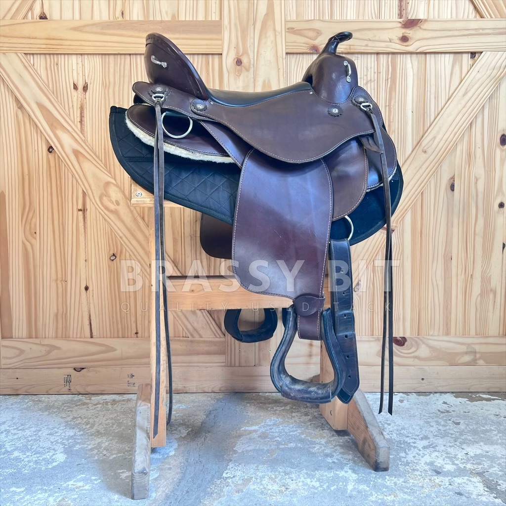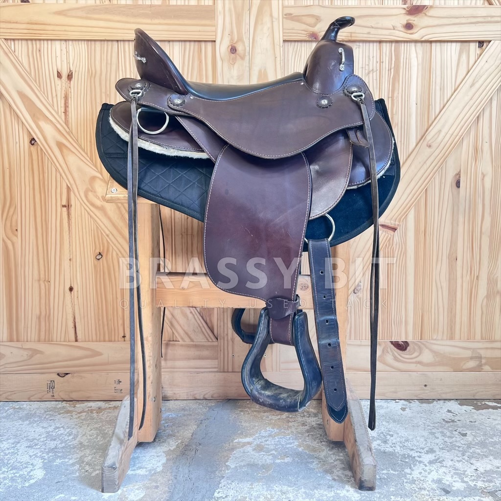 We just love having these saddles in! Flex Panel saddles have a near cult following, and seeing this saddle, it is no wonder why! Made by Hill View Farms, the is one of their most popular models, the Liberty Trail. Hill View Evolutionary Saddles took the design from Ortho Flex and improved it, offering active adjustment with each step your horse takes. Sadly, Hill View has since sold, so these incredibly popular saddles are getting hard to get ahold of! Flex panel saddles are designed with panels that are fixed to a solid tree (wood in this case) by a serious of flexing bearings that move with each step of your horse. They offer far more support than a treeless saddle while supporting saddle fit. This one is the ‘standard’ option, meaning it will work for a narrower horse up to a moderately wide horse. Would not consider this an option for a very hefty horse, think draft, but would be a great option for a draft cross! This awesome saddle offers a great padded seat, low profile swells, and butter soft leather. 16″ seat, however with the great padding, fits a bit closer to 15.5″. Has super adjustable fenders, going surprisingly short and are free swinging. 4″ cantle, wider and deeper seat. Shorter skirt length at just 25″. Panels and bearings are in pristine condition. We love the rigging on this one as its adjustable and self balancing, dropping to a center fire style. This one has fleece lined panels, so no need for booties/socks. Has always been used with a pad. This saddle has been incredibly well cared for and very lightly ridden in. Shows very minimal signs of use, has been babied and is butter soft. Only shows a couple small scuffs here and there. This awesome flex panel saddle is one of the best priced ones on the market right now. Grab it while you can!