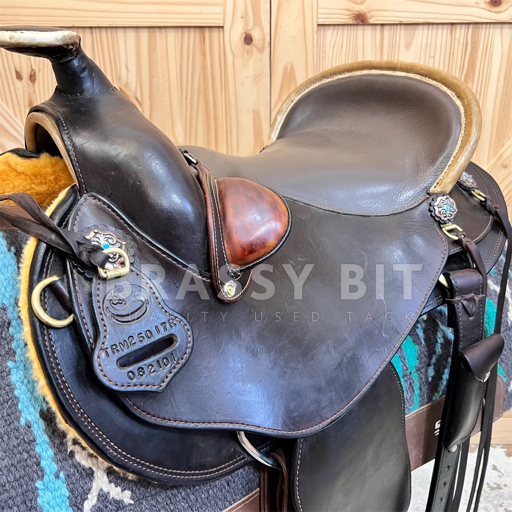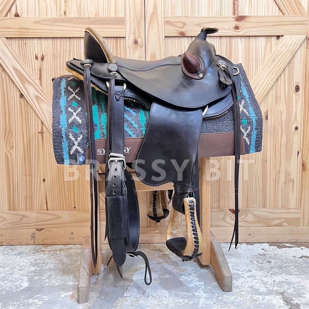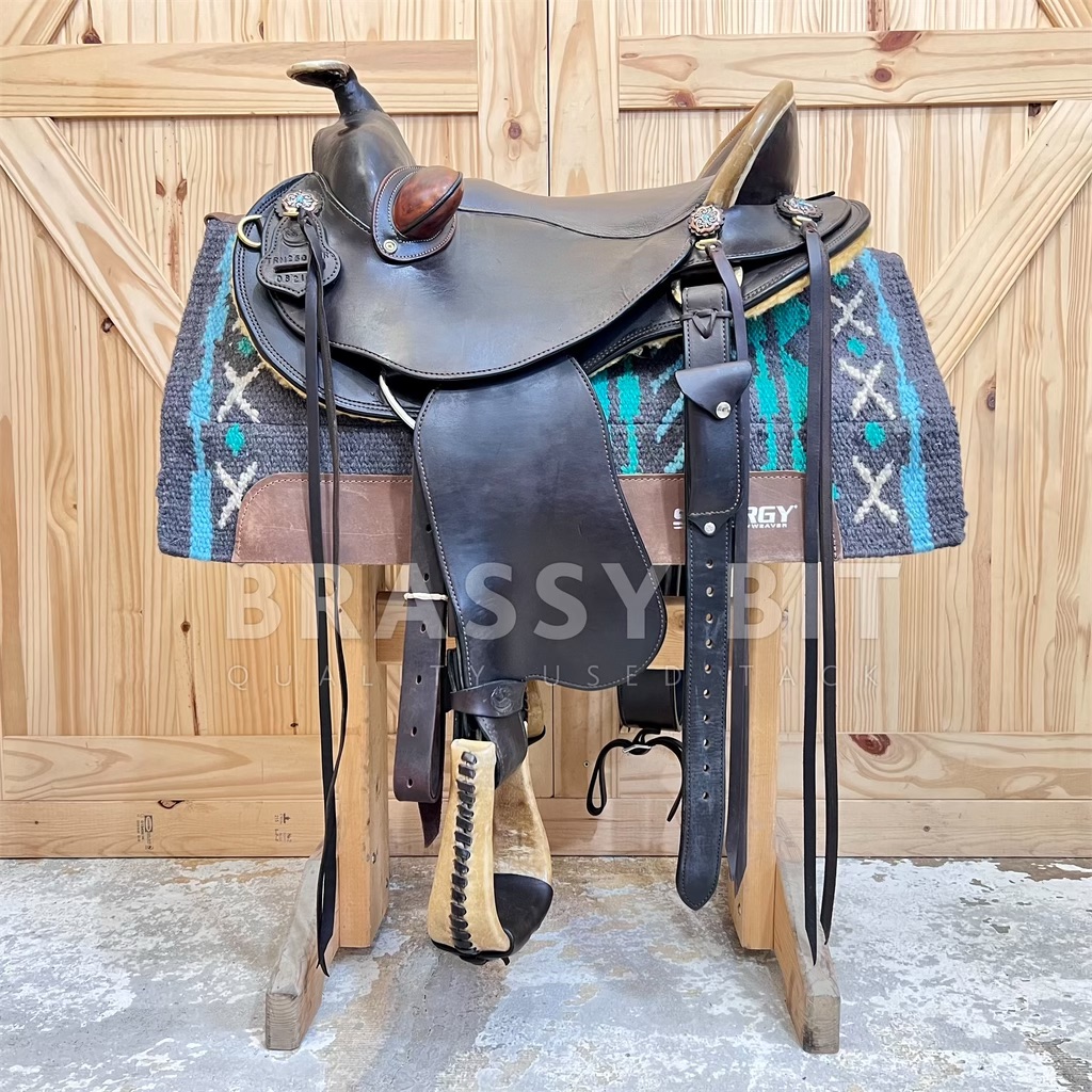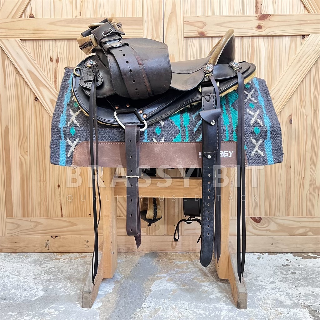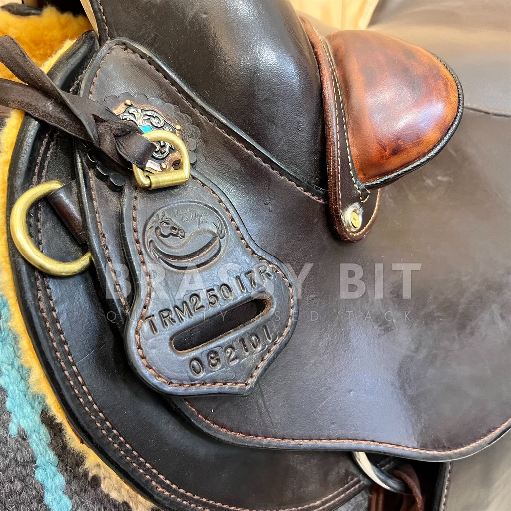 This cool saddle is the perfect combo of a ranch/work saddle, trail saddle, and your favorite padded recliner. Seriously, this thing is made to work while being an incredibly comfortable ride. Made by incredible MN Saddler About the Horse, this saddle is built to last with a ton of extras. The seat on this one is really cool. Offering a 17″ seat, fitting like 16.5″ with a VERY high cantle at 5″, slightly raised twist, and is heavily padded with the comfiest memory foam. The seat is a bit more open, still feeling deep, and paired with the free swinging fenders-this one doesn’t feel confining but is still very secure. About The Horse designs their own trees. This one is built on ATH’s #2 tree-which is their equivalent to Arab Bars. Don’t let “Arab” scare you away. That means it has shorter bar length on the front, nice rock to the bars, and offers a wider tree through the whole length. This one is WIDE. Measures 8″, fitting like W/FQH bars with a ton of flare. This one will fit a horse nicely. Slightly set back rigging to open up the shoulder. The skirt is a great design-rounded and steep under the fender which offers a close contact feel. Not terribly long at 27″. 3″ post horn that will hold up to hard work, A-Fork wells that have a set of bucking rolls added for more security. On a bullhide wrapped wood tree. This saddle is a workhorse, weighing in at 48lbs with its rigging, this one will hold up to even the longest days of hard work. Lots of adjustment to the fenders, working well for a leggy rider. Comes fully rigged and has been finished off with a custom concho and strings. This saddle isn’t black-we swear! It is very, very dark chocolate brown. Ordered new and has seen less than a dozen rides. Sadly, life has changed for its rider who is devastated to part with it. This is a heck of an opportunity to get a saddle that will last generations without the weight or new/retail price.