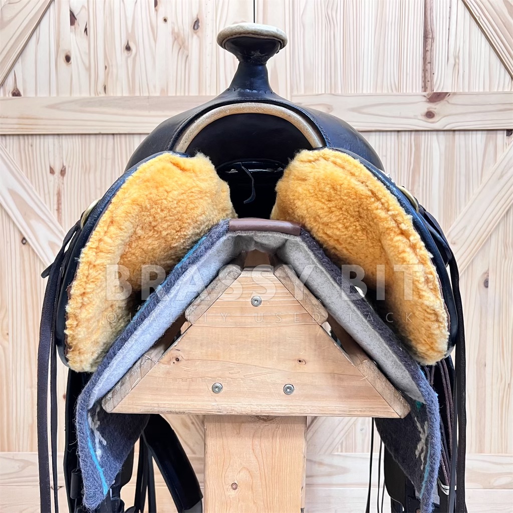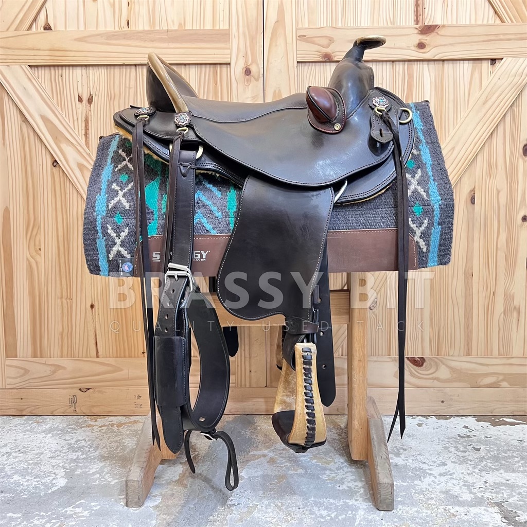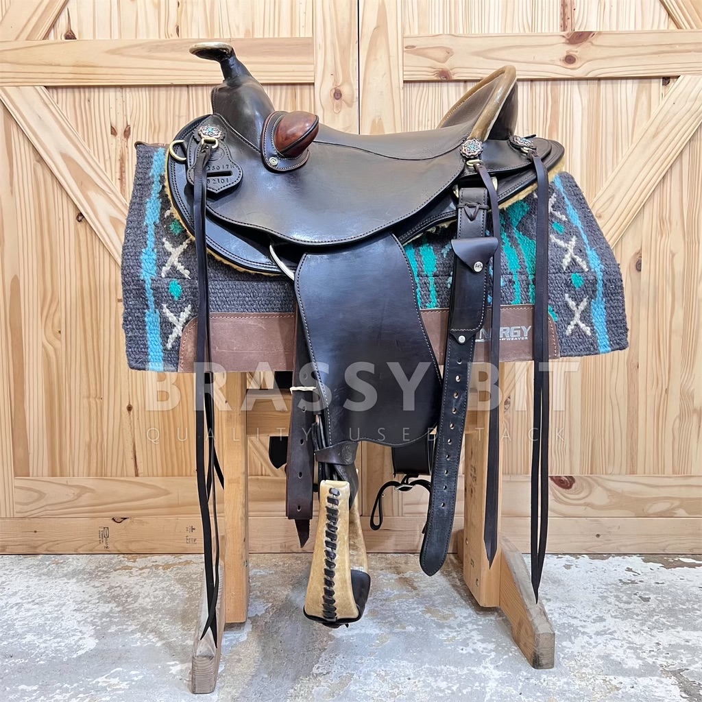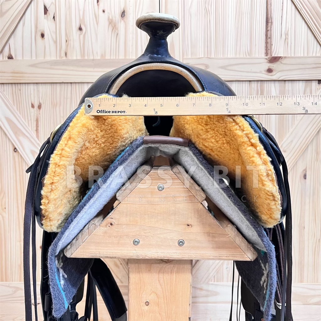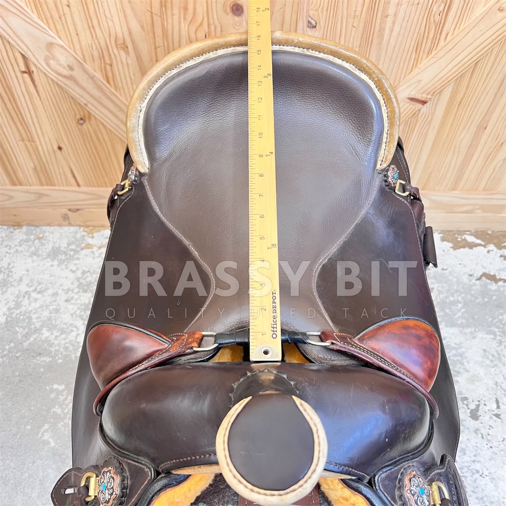 This cool saddle is the perfect combo of a ranch/work saddle, trail saddle, and your favorite padded recliner. Seriously, this thing is made to work while being an incredibly comfortable ride. Made by incredible MN Saddler About the Horse, this saddle is built to last with a ton of extras. The seat on this one is really cool. Offering a 17″ seat, fitting like 16.5″ with a VERY high cantle at 5″, slightly raised twist, and is heavily padded with the comfiest memory foam. The seat is a bit more open, still feeling deep, and paired with the free swinging fenders-this one doesn’t feel confining but is still very secure. About The Horse designs their own trees. This one is built on ATH’s #2 tree-which is their equivalent to Arab Bars. Don’t let “Arab” scare you away. That means it has shorter bar length on the front, nice rock to the bars, and offers a wider tree through the whole length. This one is WIDE. Measures 8″, fitting like W/FQH bars with a ton of flare. This one will fit a horse nicely. Slightly set back rigging to open up the shoulder. The skirt is a great design-rounded and steep under the fender which offers a close contact feel. Not terribly long at 27″. 3″ post horn that will hold up to hard work, A-Fork wells that have a set of bucking rolls added for more security. On a bullhide wrapped wood tree. This saddle is a workhorse, weighing in at 48lbs with its rigging, this one will hold up to even the longest days of hard work. Lots of adjustment to the fenders, working well for a leggy rider. Comes fully rigged and has been finished off with a custom concho and strings. This saddle isn’t black-we swear! It is very, very dark chocolate brown. Ordered new and has seen less than a dozen rides. Sadly, life has changed for its rider who is devastated to part with it. This is a heck of an opportunity to get a saddle that will last generations without the weight or new/retail price.